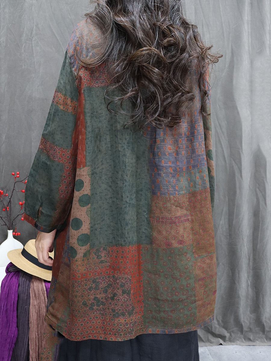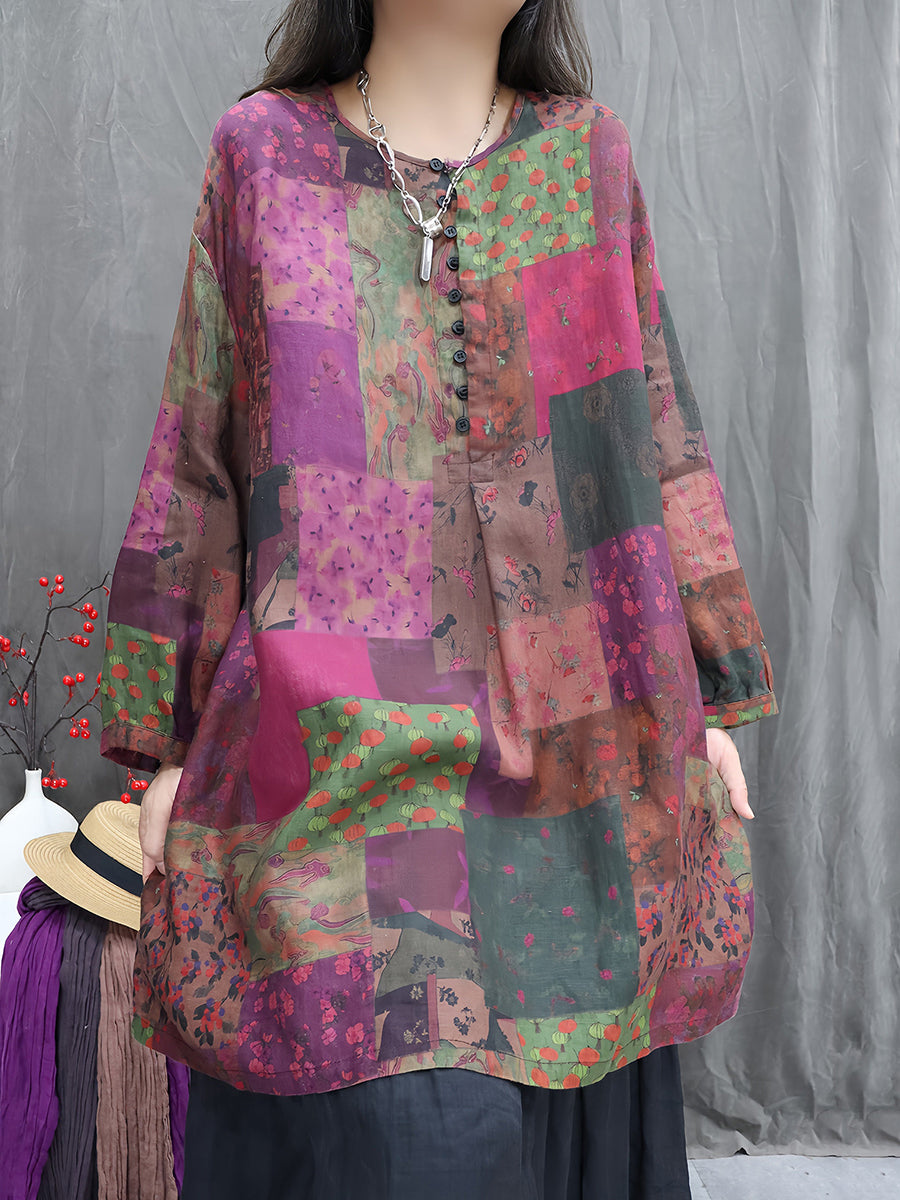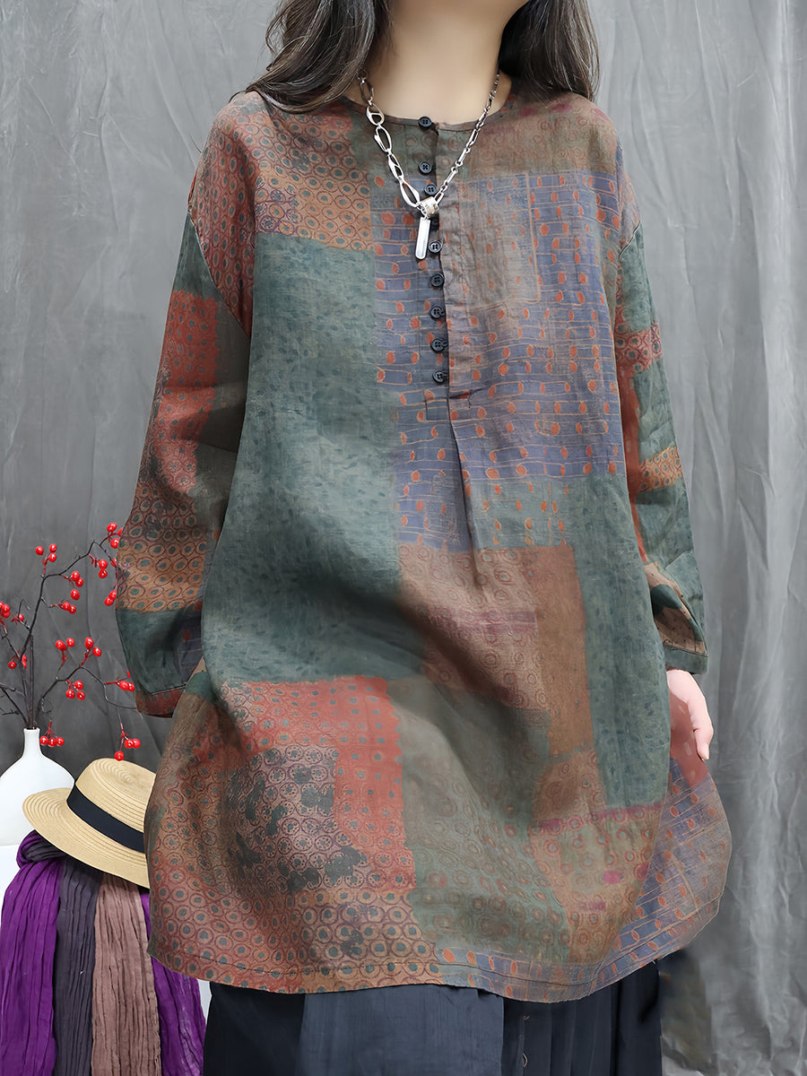 חולצת פשתן 100% פשתן עם צווארון O וטלאים בסגנון סתיו לנשים