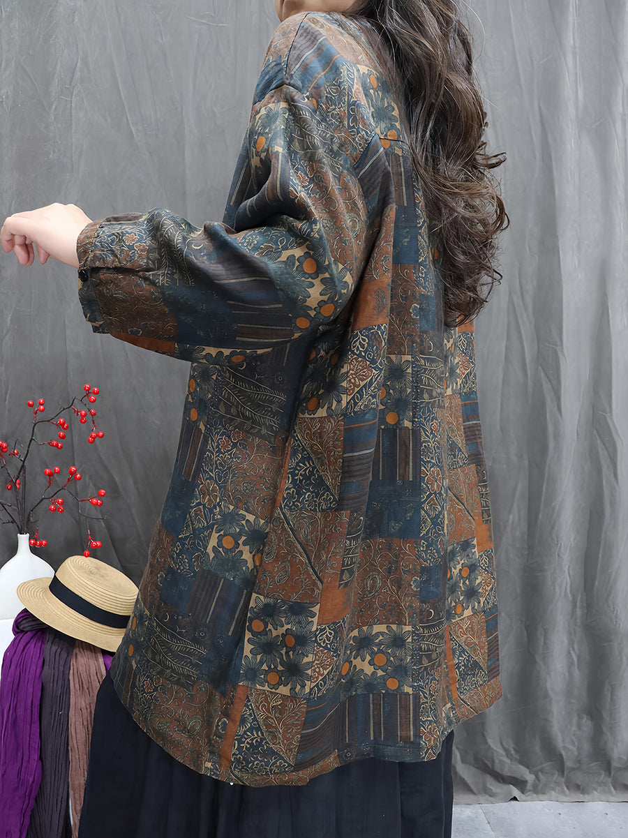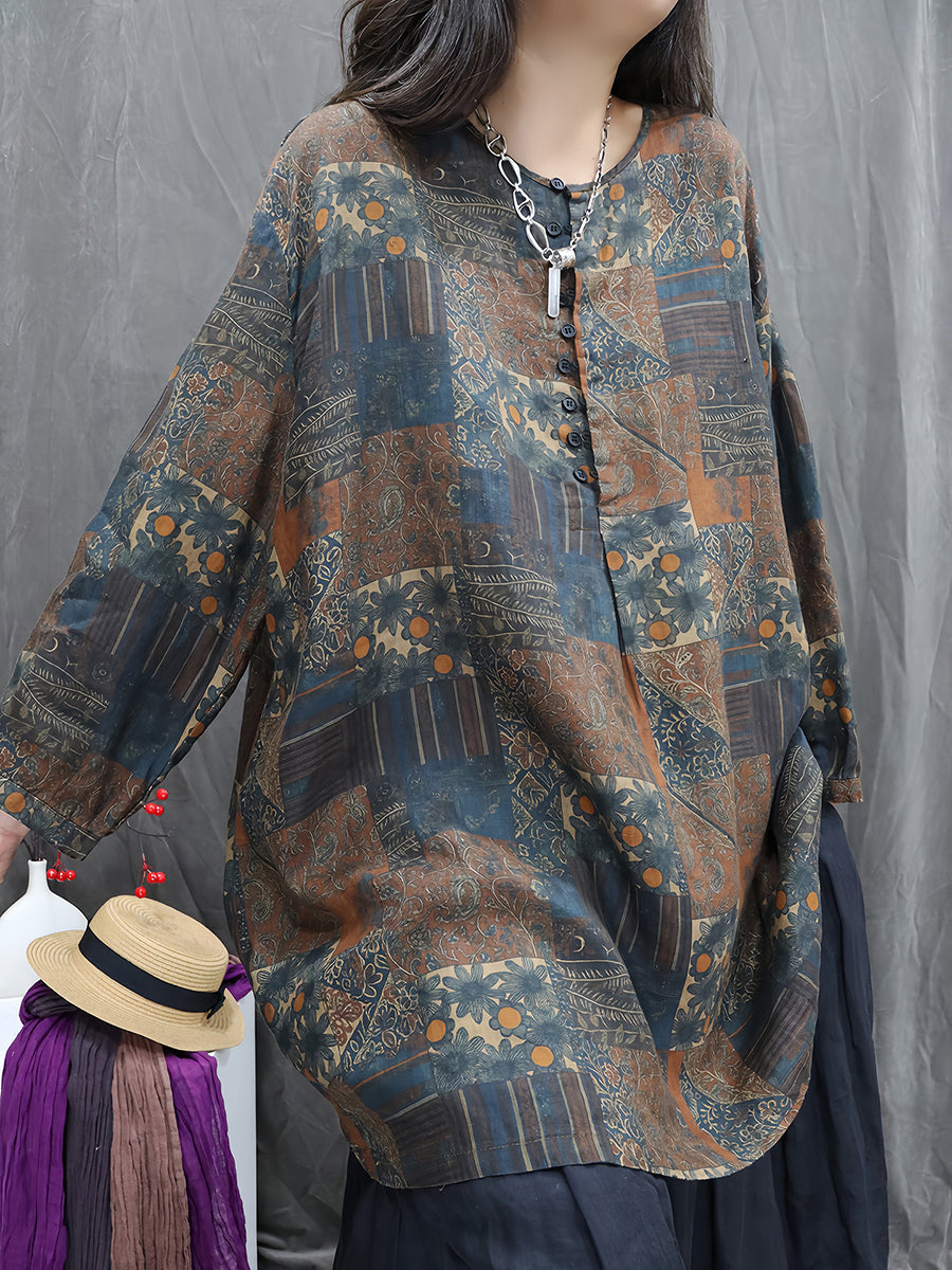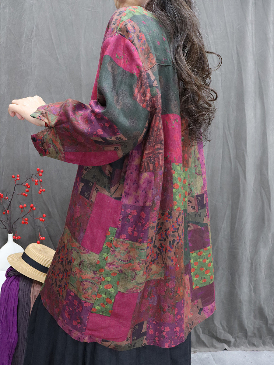 חולצת פשתן 100% פשתן עם צווארון O וטלאים בסגנון סתיו לנשים