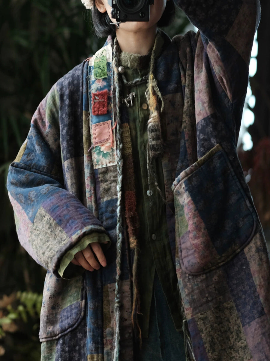 מעיל מרופד בסגנון רטרו לנשים עם צווארון V וטלאים מכותנה