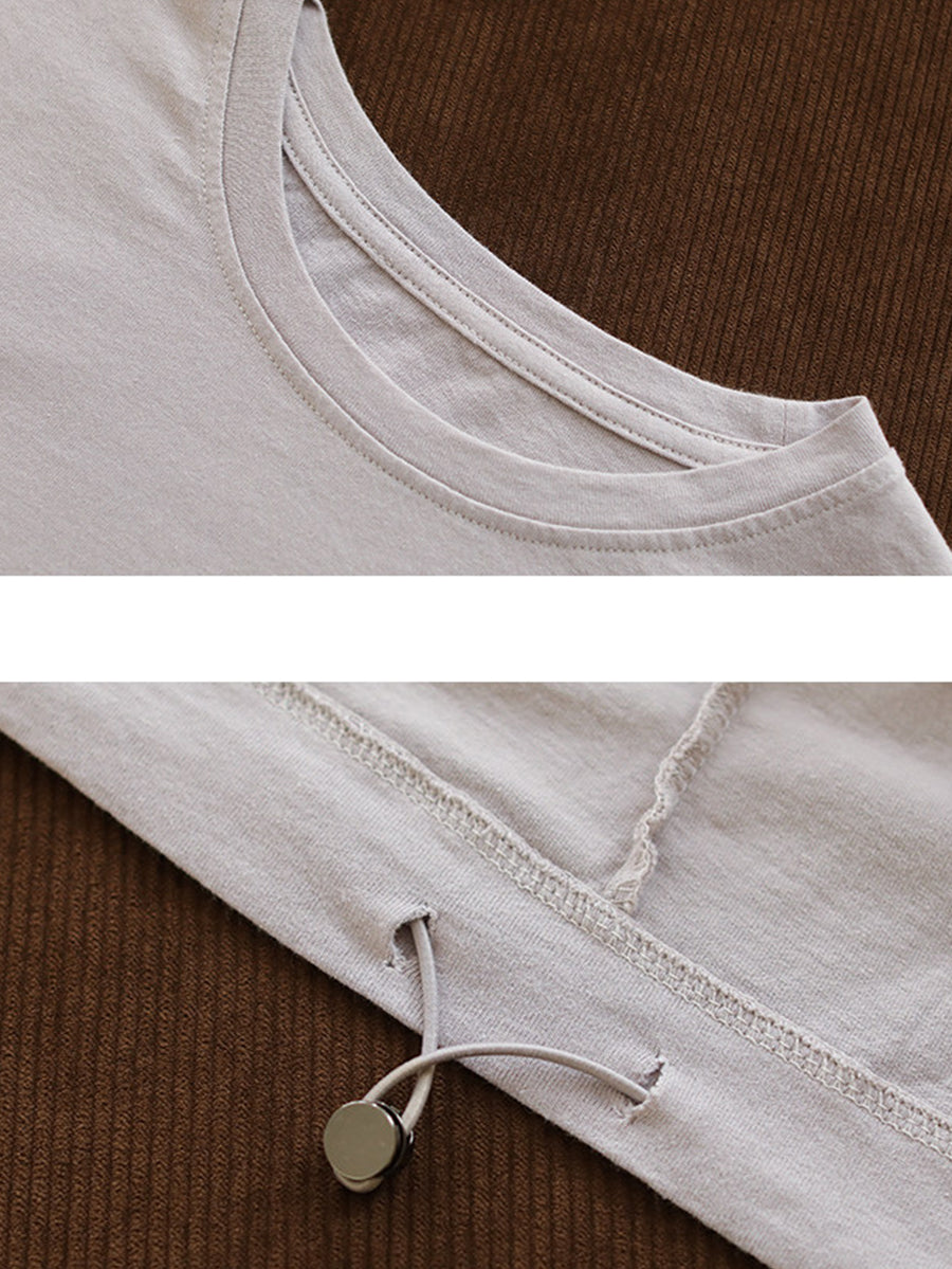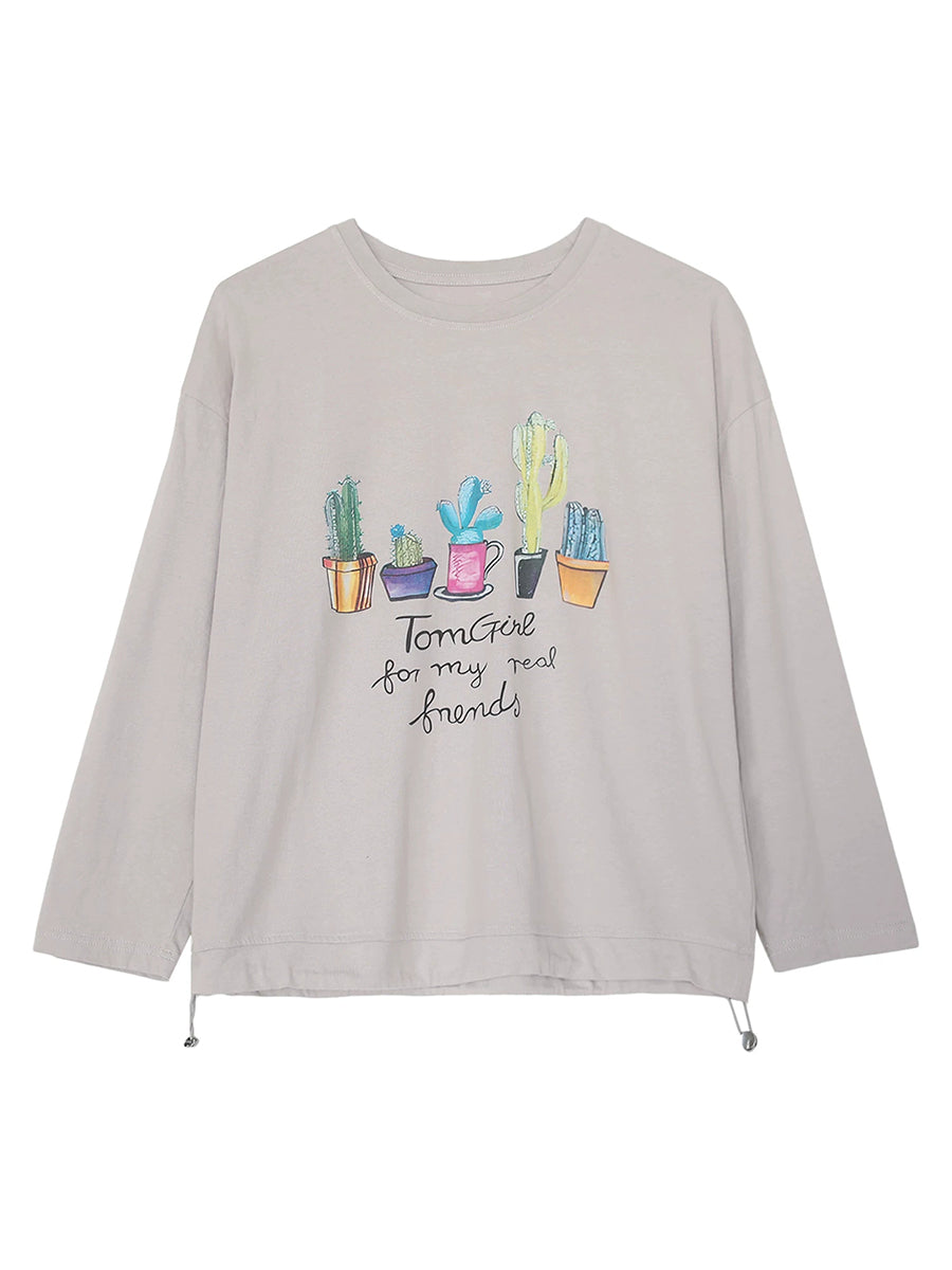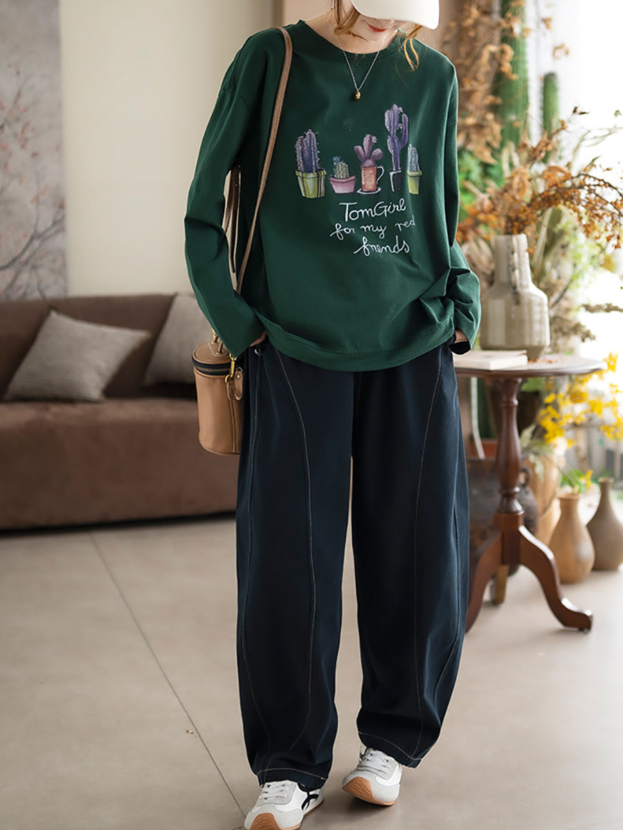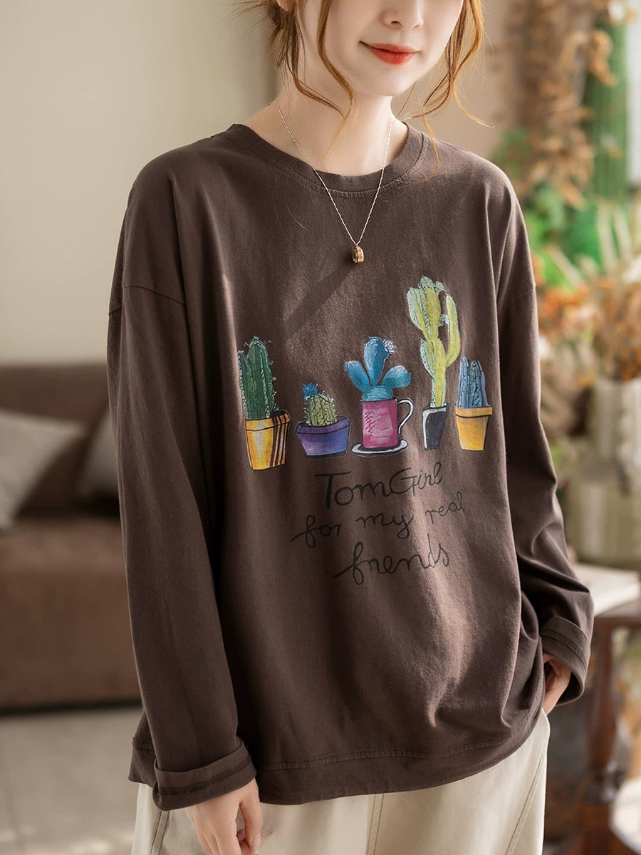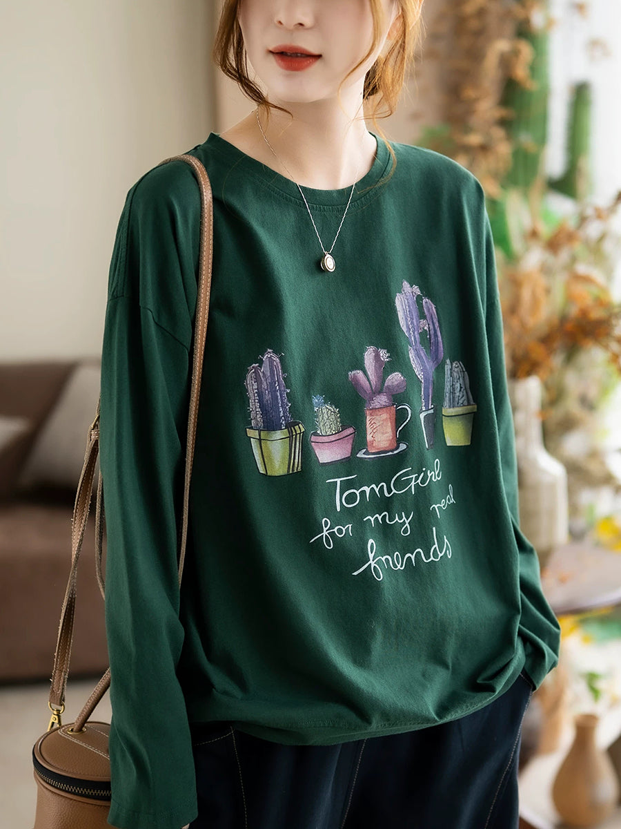 חולצת כותנה עם צווארון O-צוואר בצבעי אביב לנשים, צמחים אמנותיים
