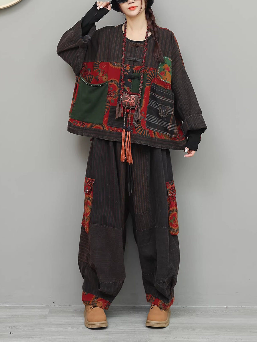 חליפות O-צוואר עם שוליים פרחוניים אתניים לנשים באביב