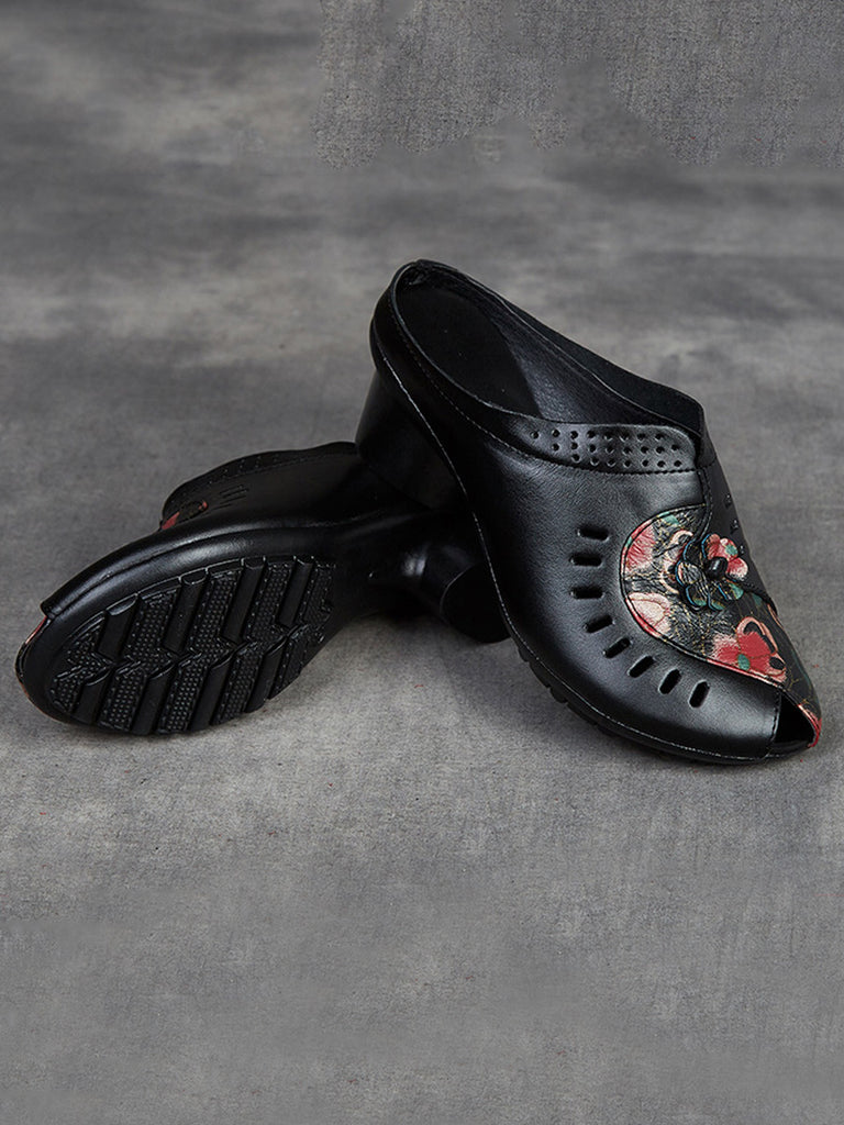 נעלי בית עם עקב בינוני ועקב פרחוני לקיץ לנשים מעור