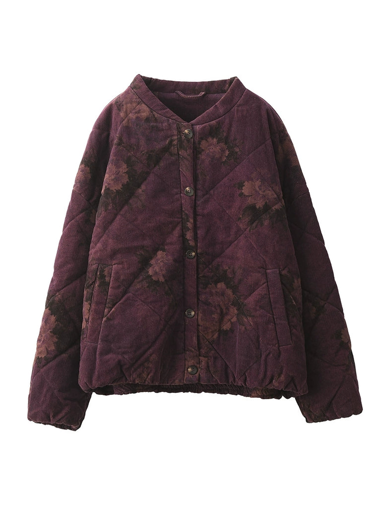 מעיל מרופד זה לנשים, עשוי מ-100% כותנה, בהשראת וינטג', כולל דוגמה פרחונית וצווארון עומד. הוא מעוצב עם שרוולים רטרו באורך מלא, אידיאלי ללבוש סתיו וחורף כאחד.