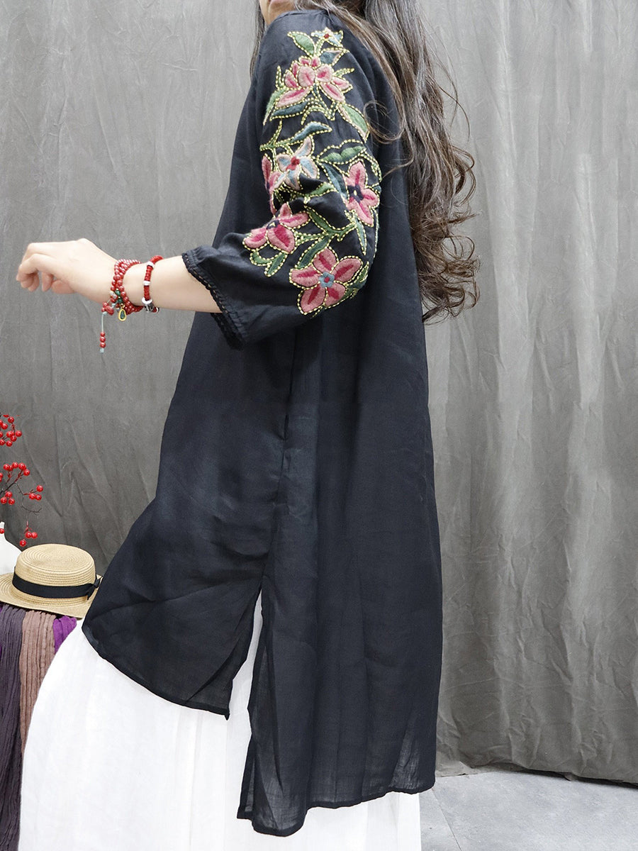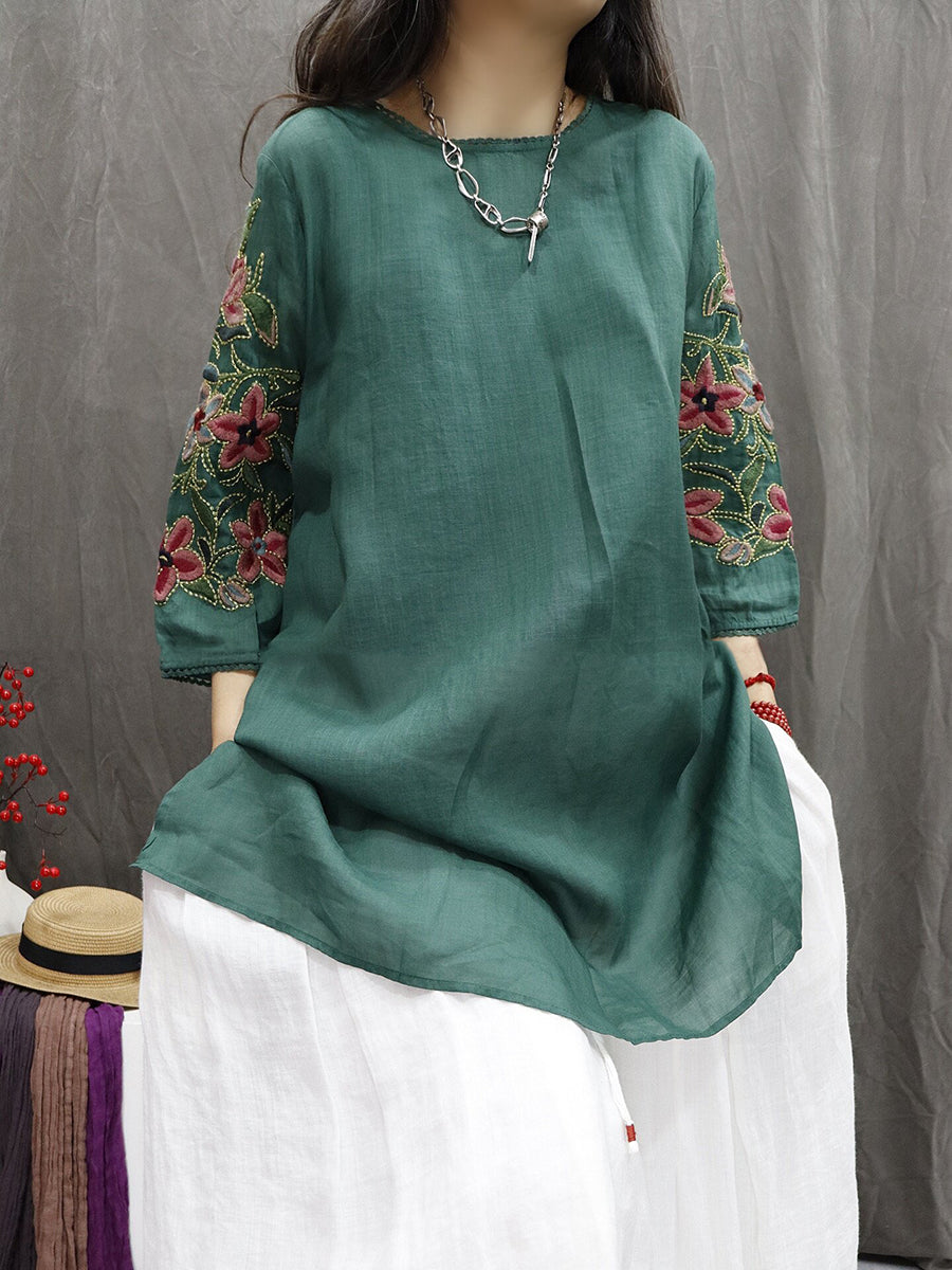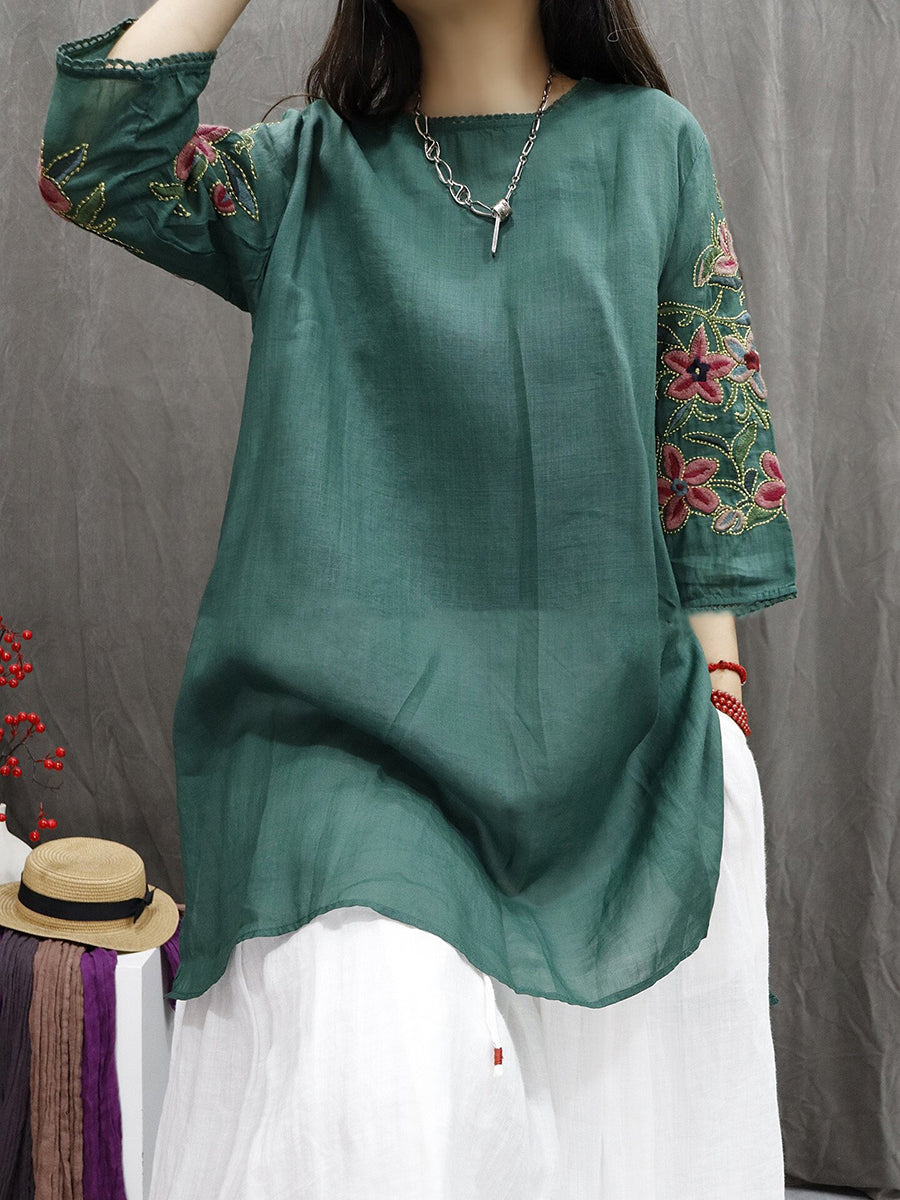 חולצה לנשים עם צווארון O ורקמה פרחונית 100% רמי