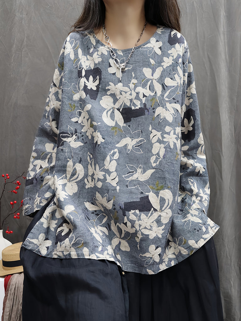 חולצת O-צוואר פרחונית וינטג' סתיו לנשים 100% פשתן