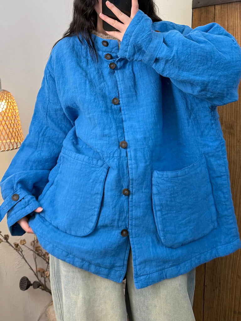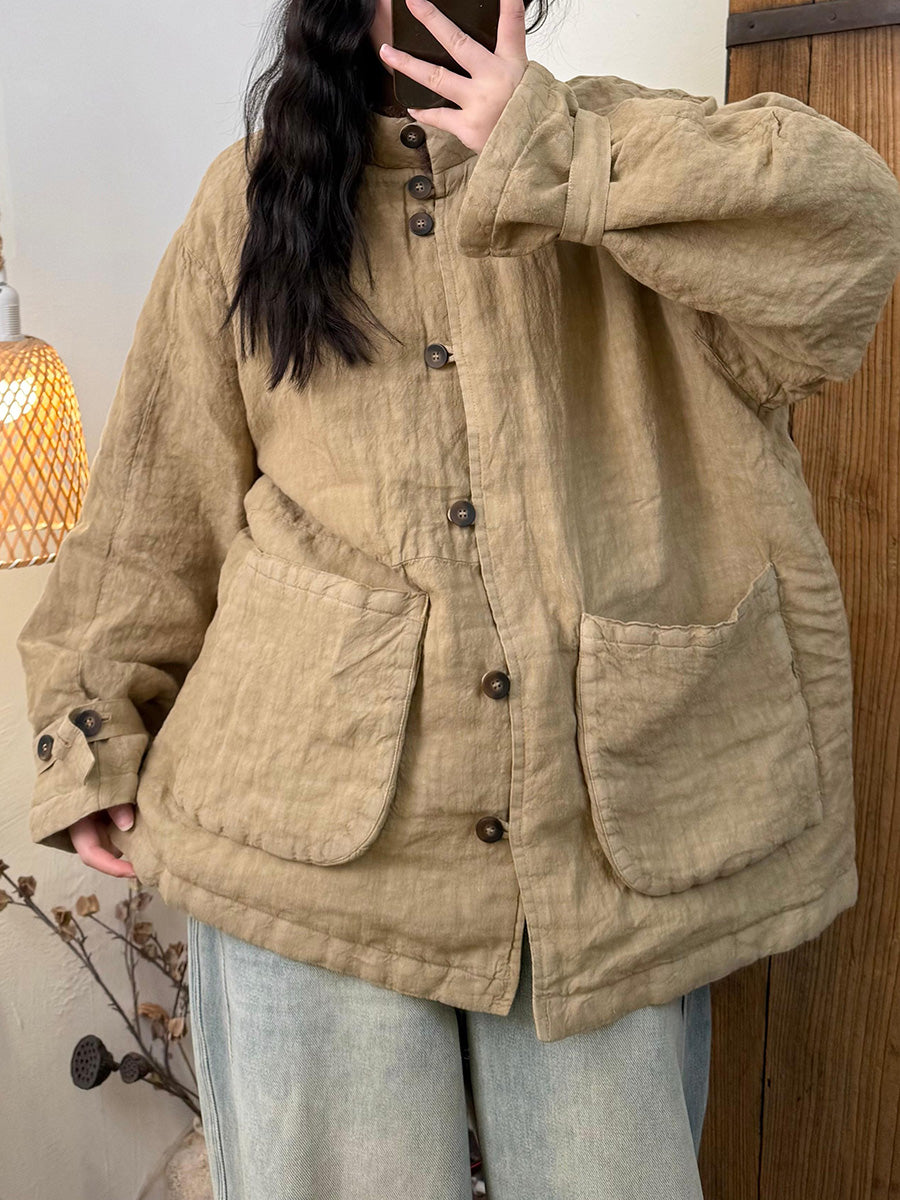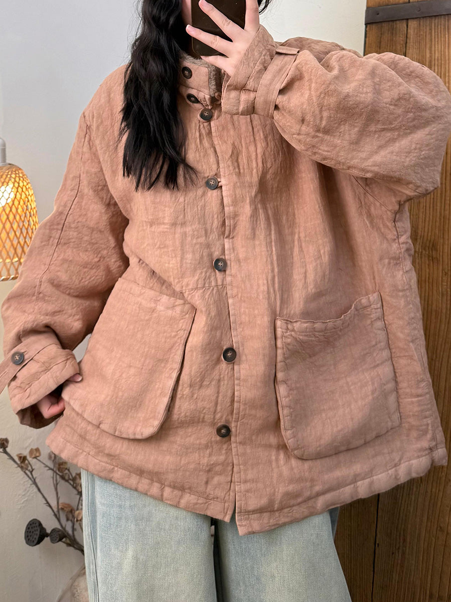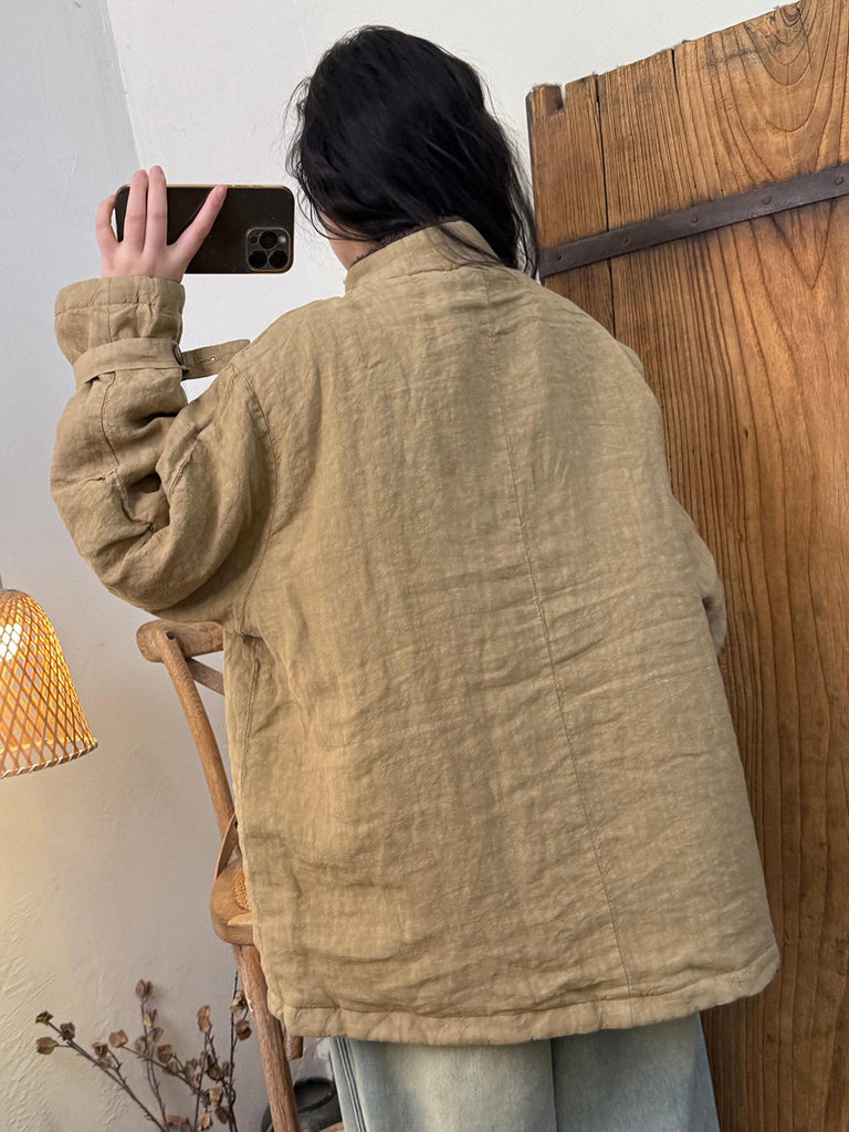 מעיל חורף וינטג' לנשים עם צווארון עומד, פליז פשתן