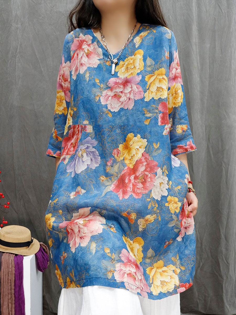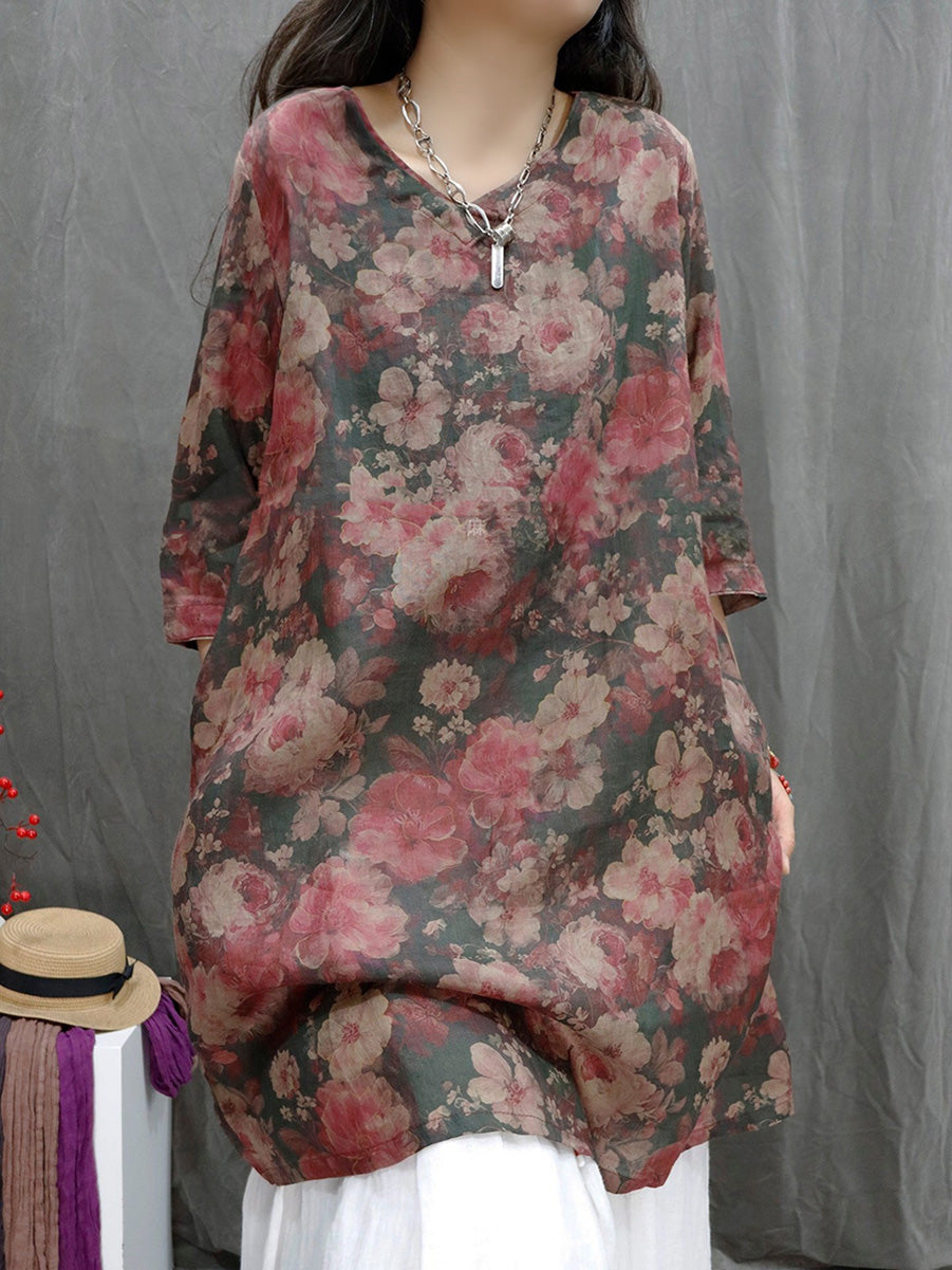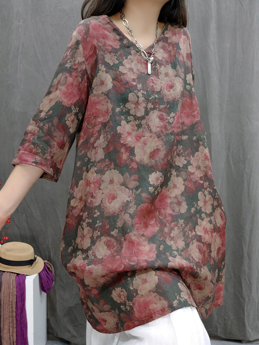 חולצת קיץ לנשים עם צווארון V פרחוני אומנותי 100% רמי