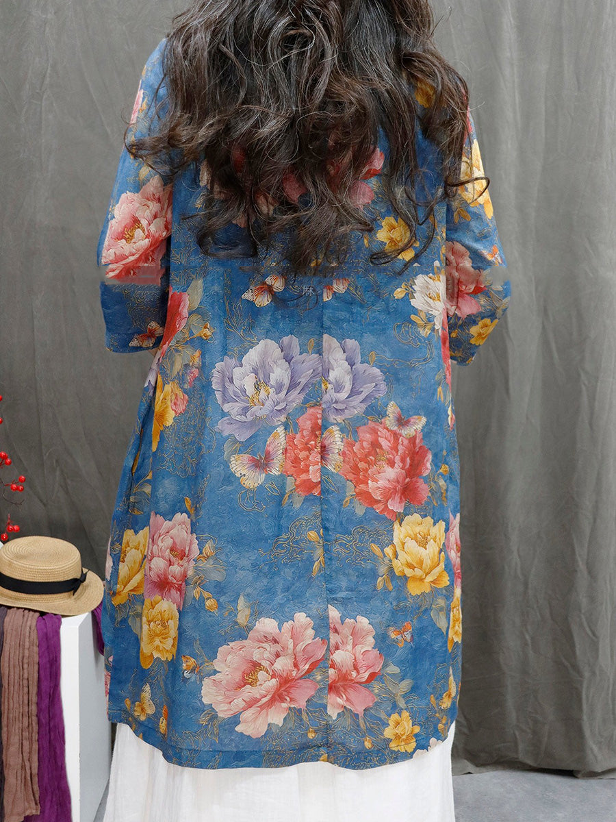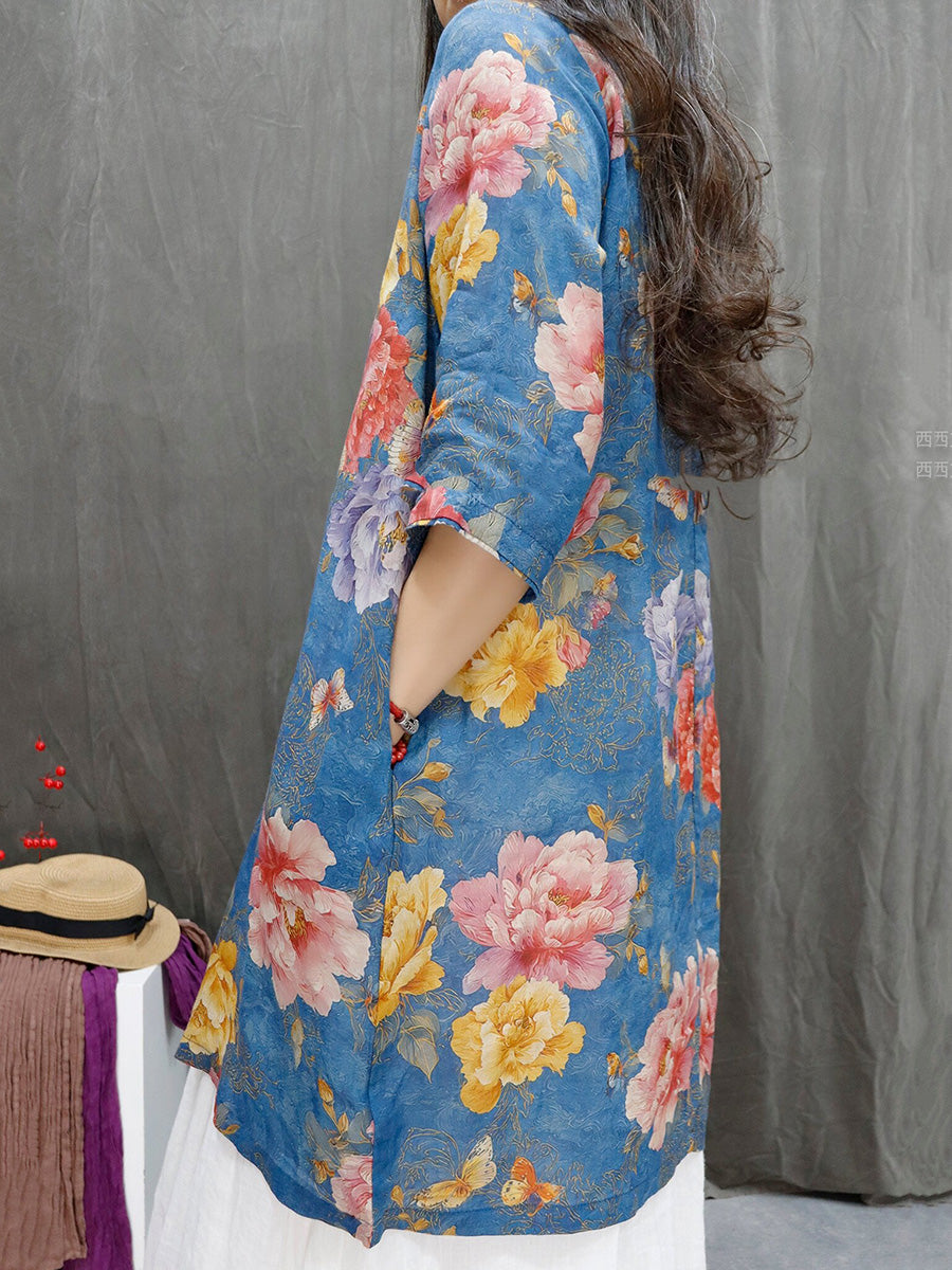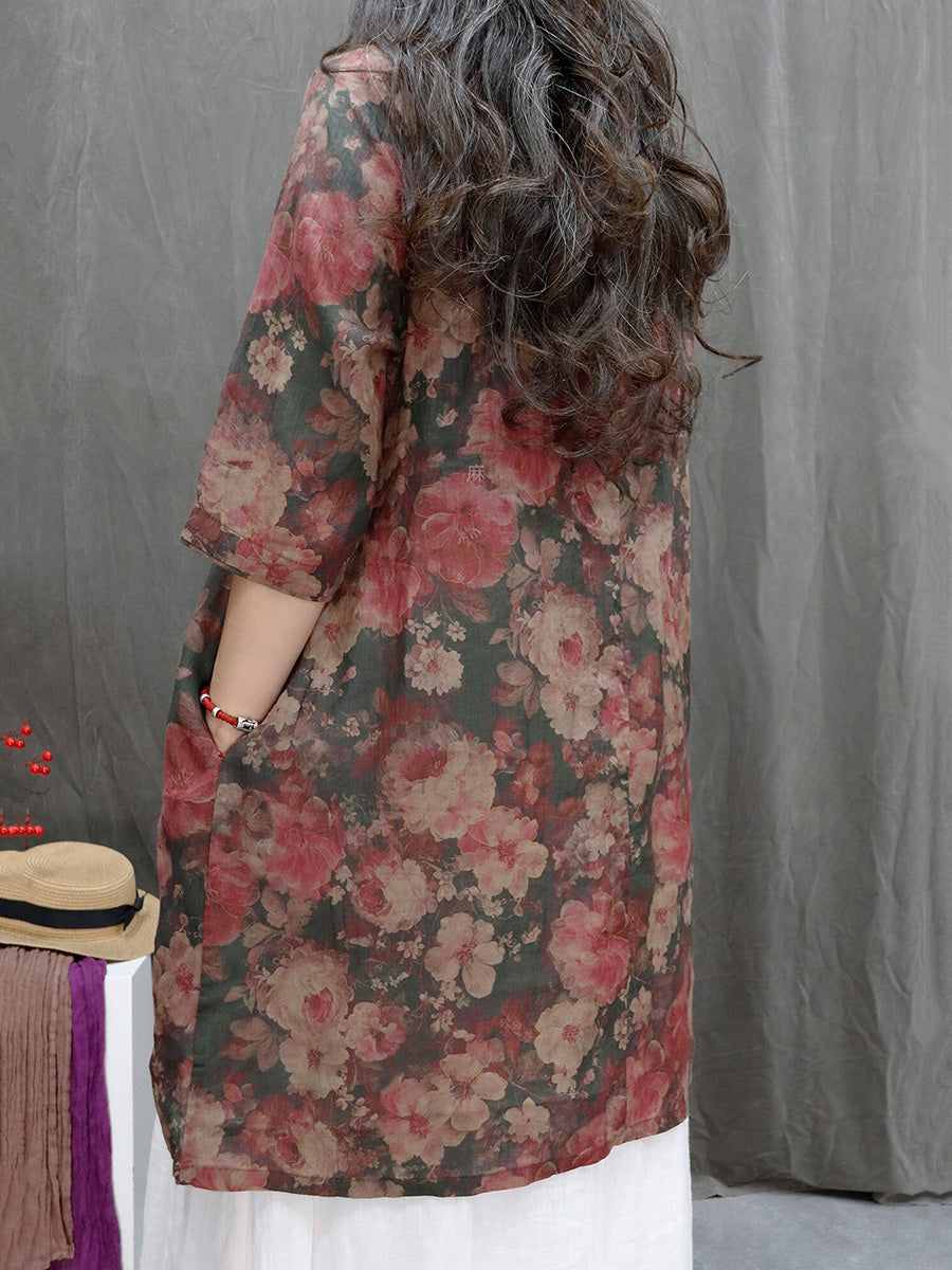 חולצת קיץ לנשים עם צווארון V פרחוני אומנותי 100% רמי