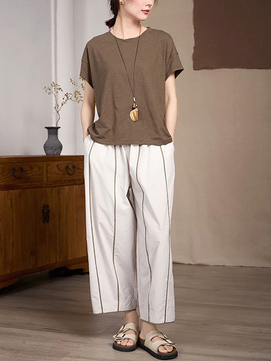 מכנסי אביב לנשים עם פסים בגזרה ישרה מכותנה