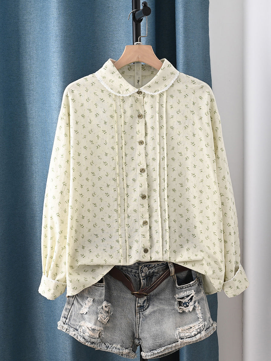 חולצת אביב לנשים עם צווארון הפוך, פרחונית אומנותית מ-100% כותנה
