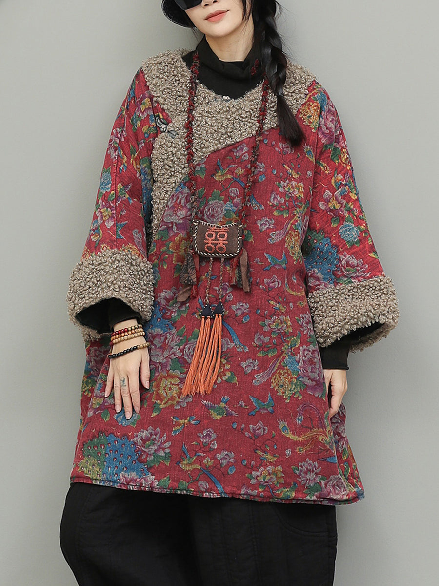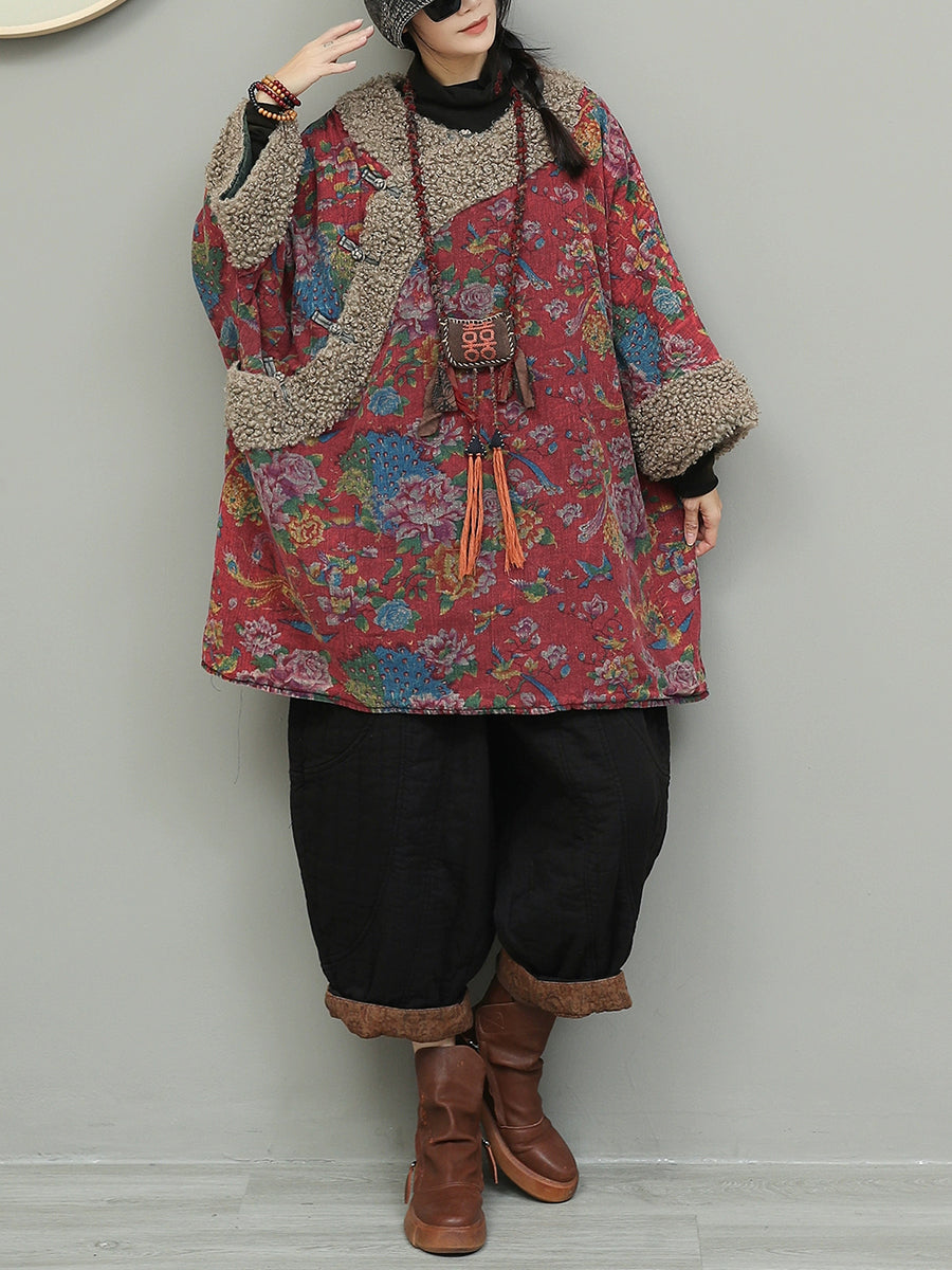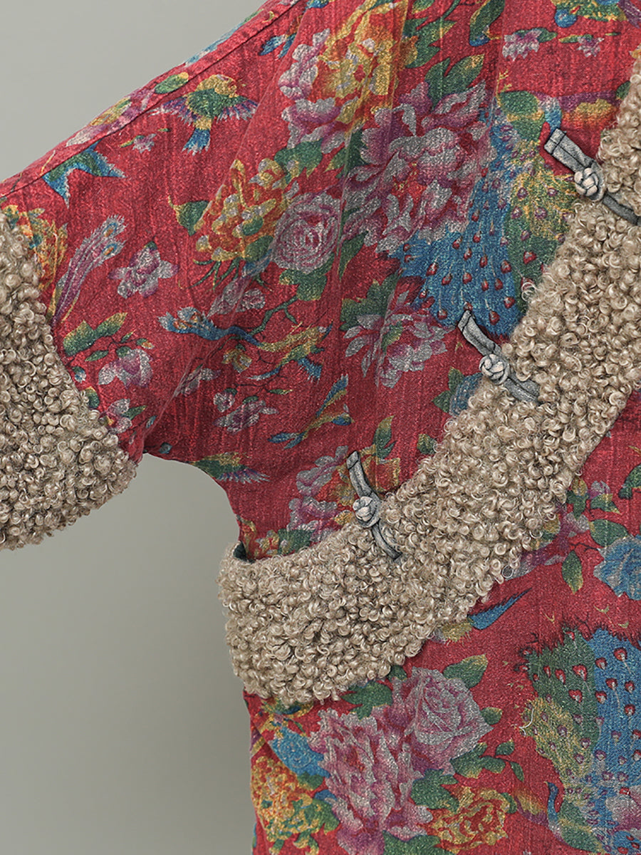 מעיל רטרו עם צווארון O של כותנה ופליז פרחוני לנשים