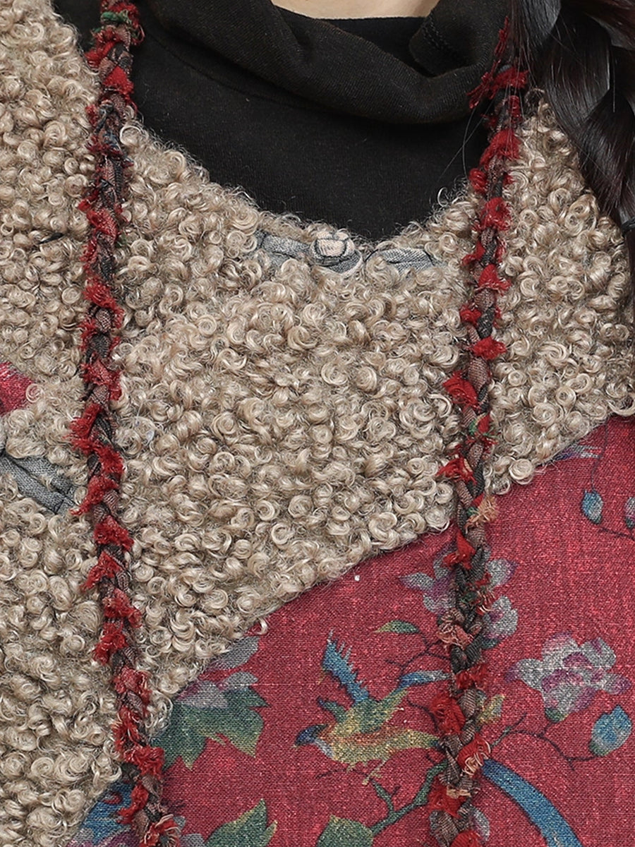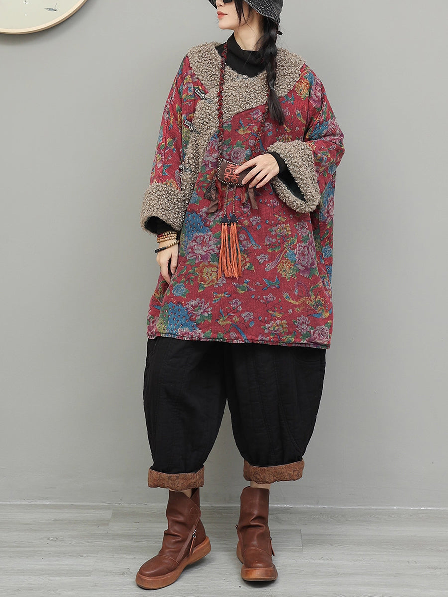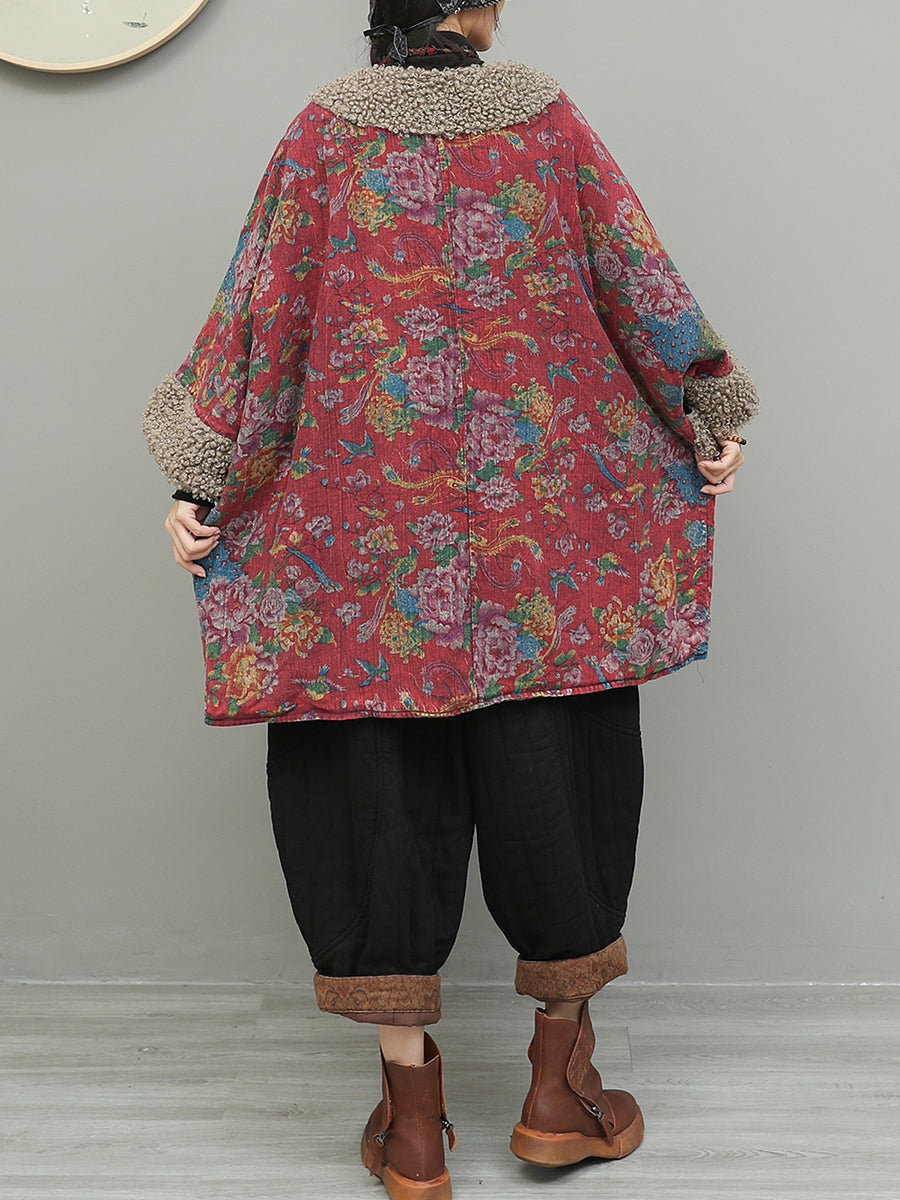 מעיל רטרו עם צווארון O של כותנה ופליז פרחוני לנשים