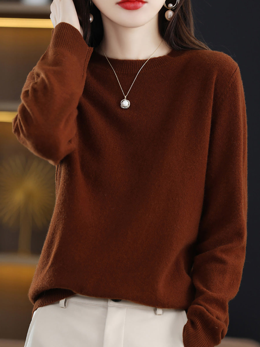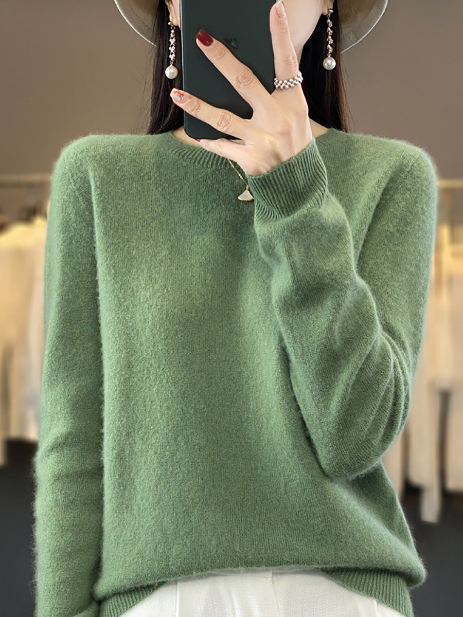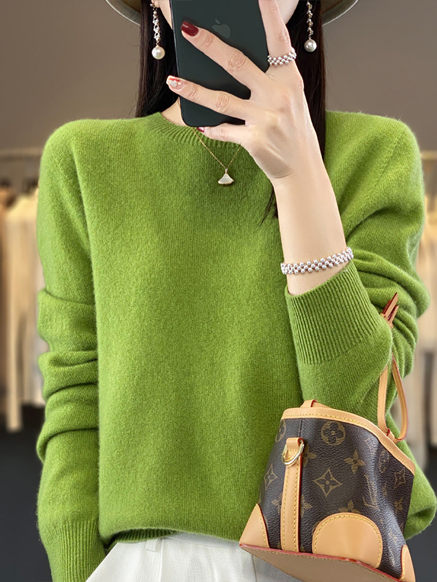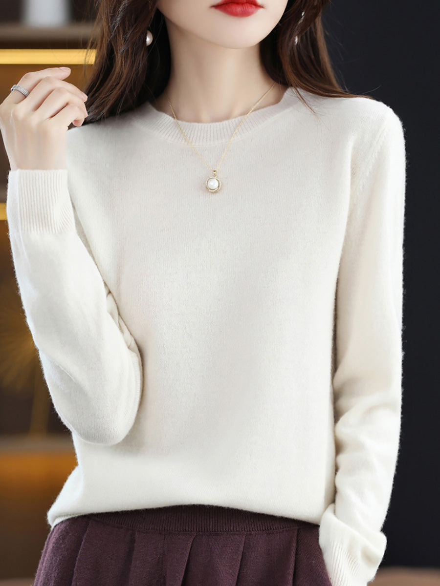 סוודר צמר O-צוואר בצבע טהור אומנותי לסתיו לנשים