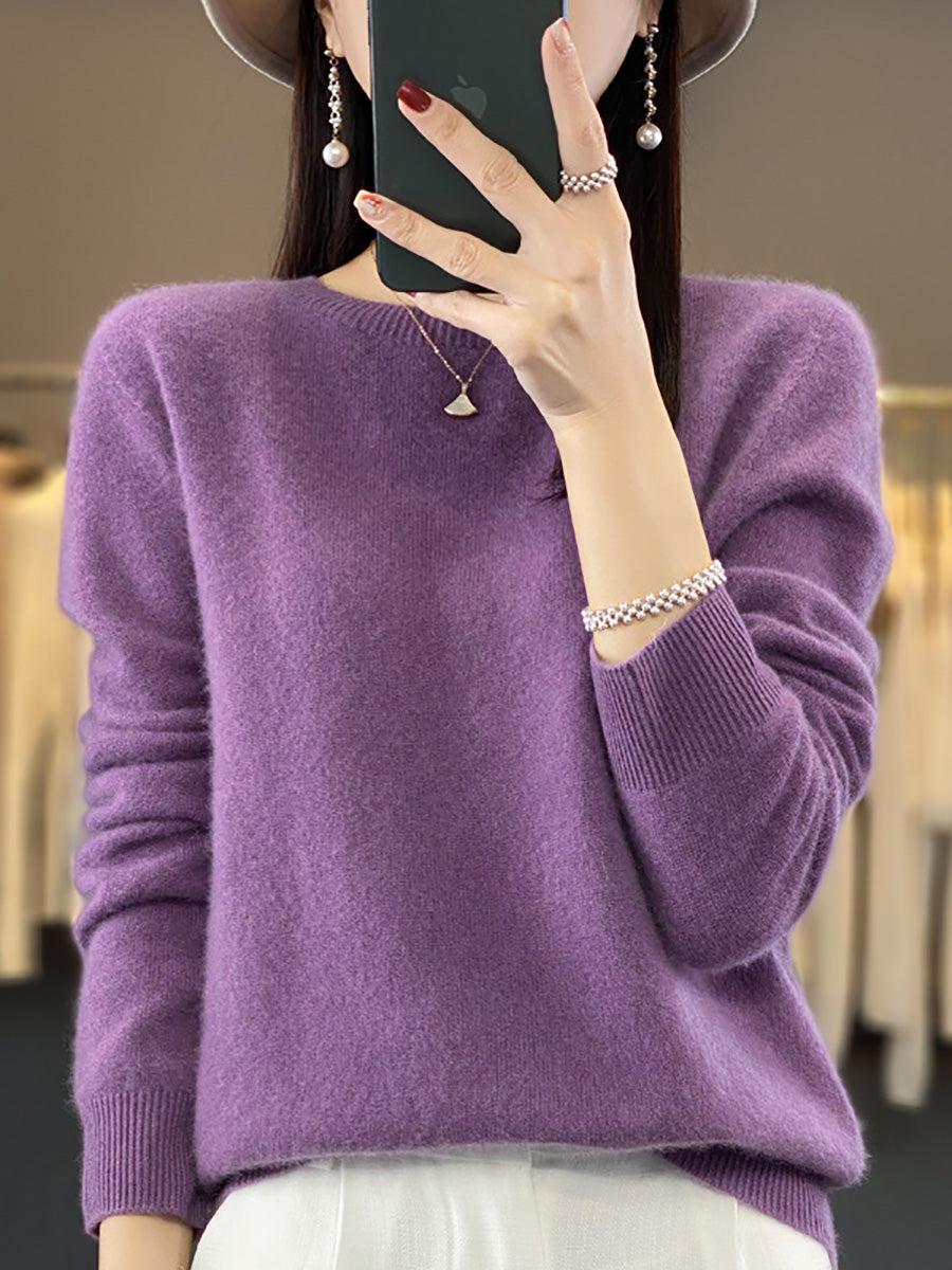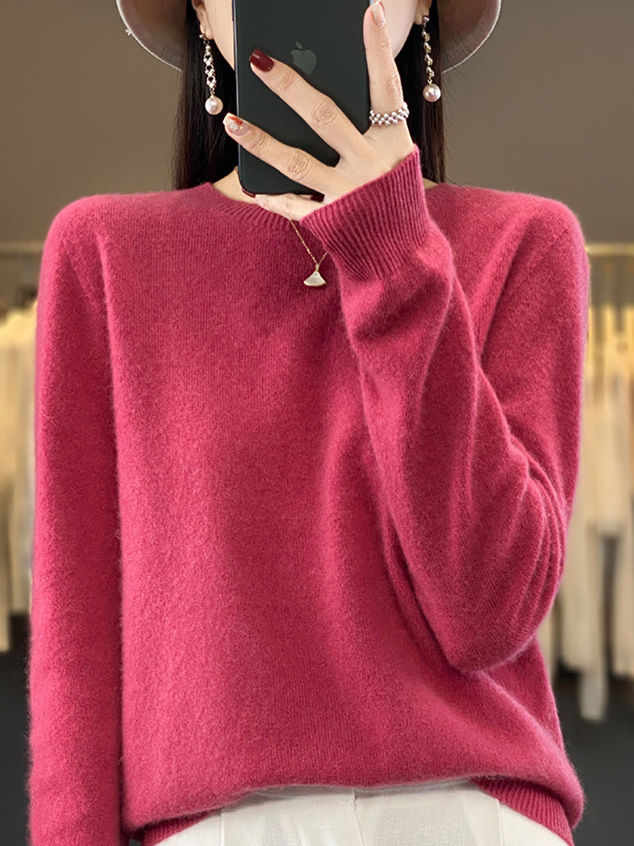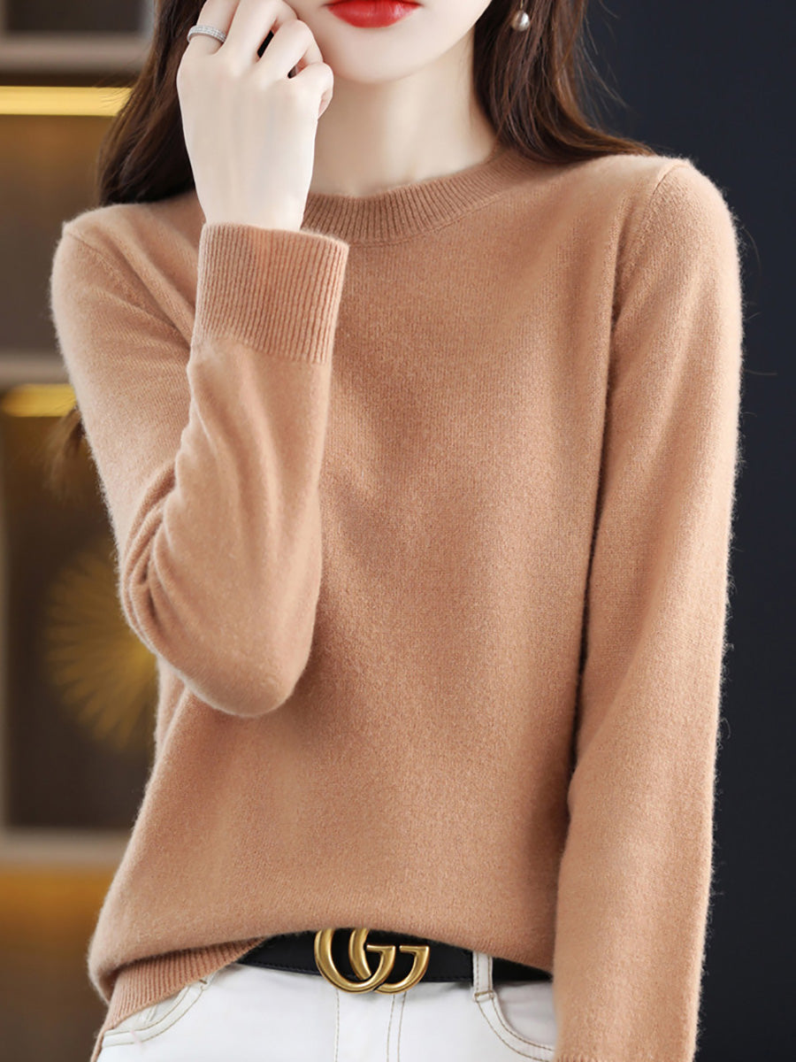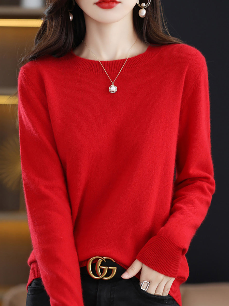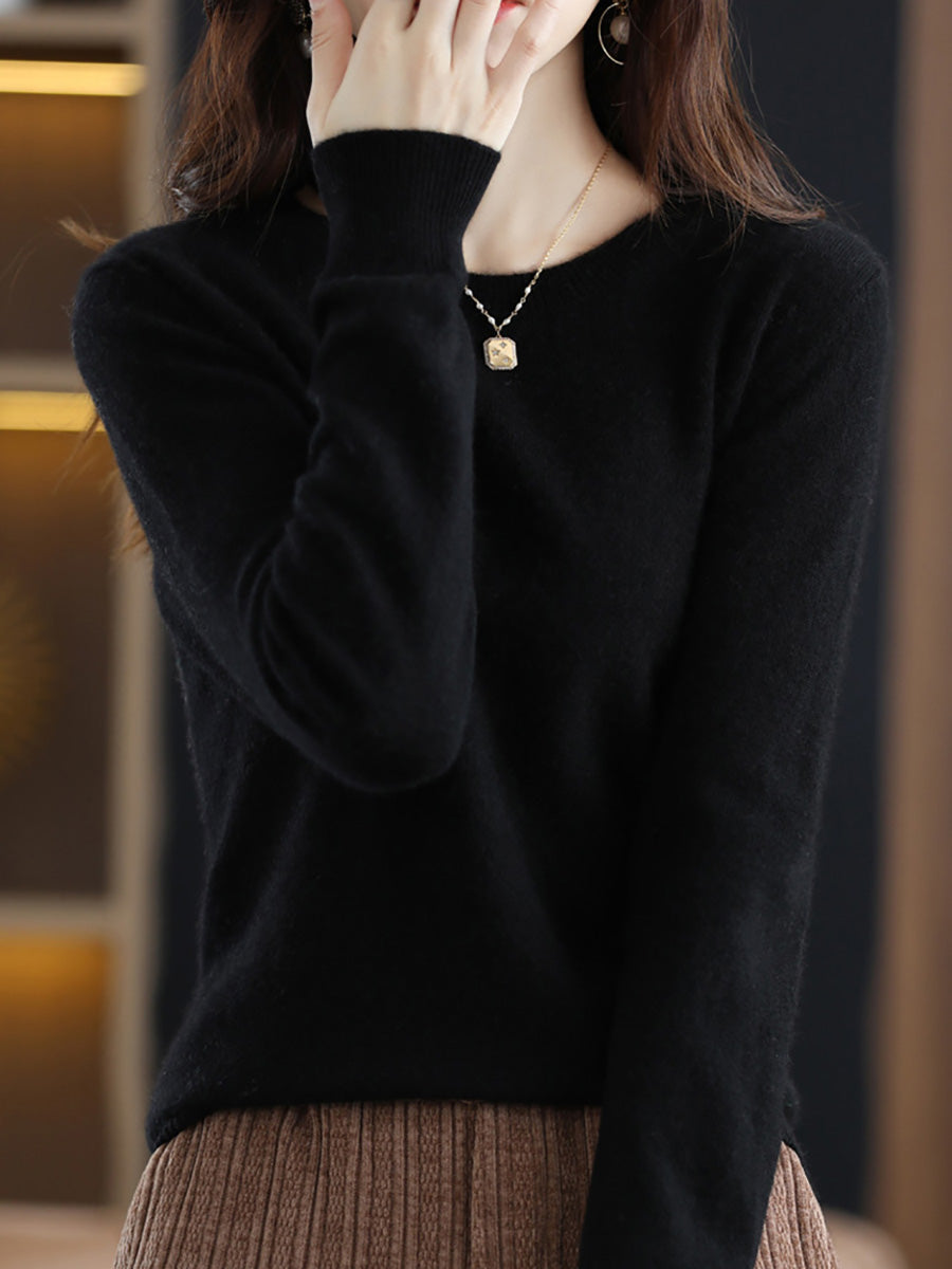 סוודר צמר O-צוואר בצבע טהור אומנותי לסתיו לנשים