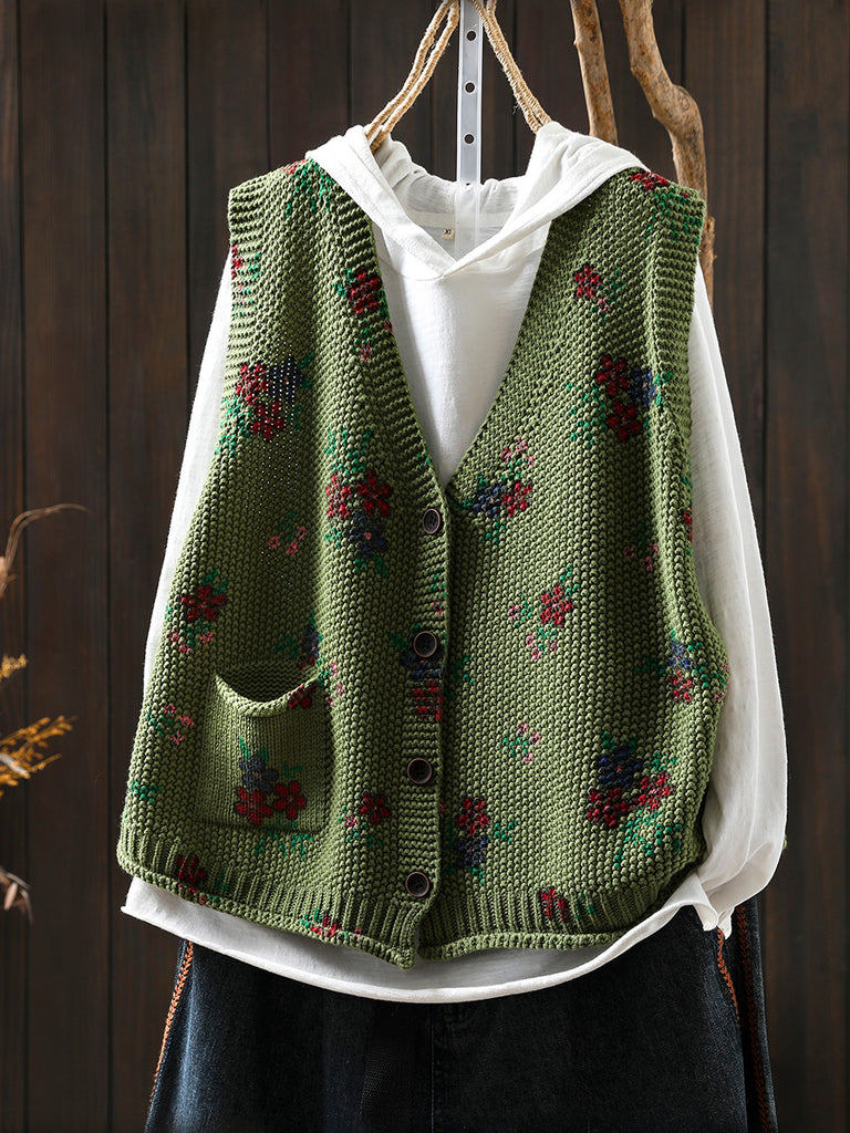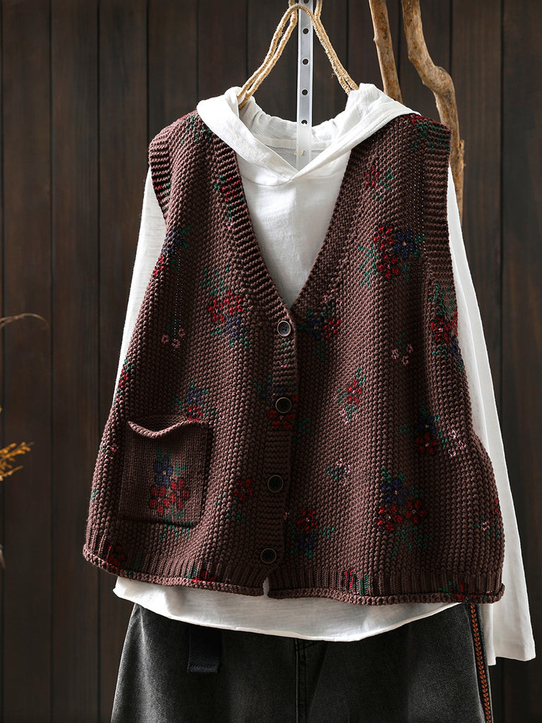 אפוד סרוג פרחוני עם צווארון V לסתיו לנשים