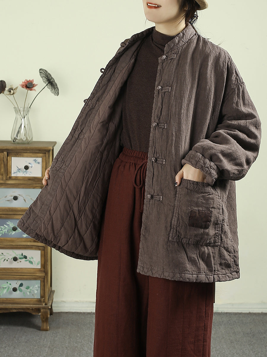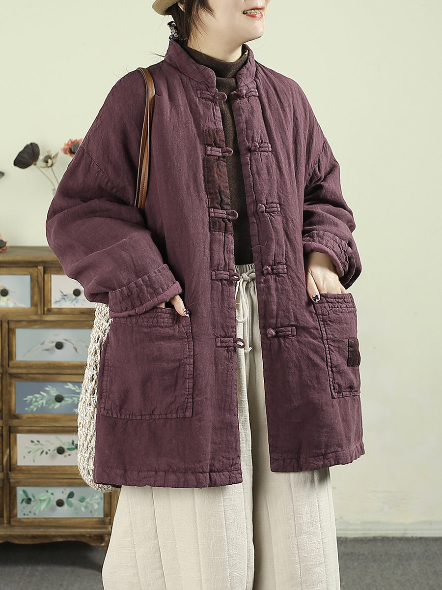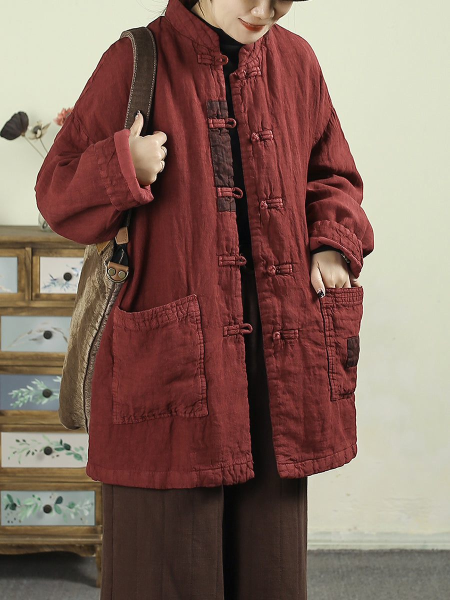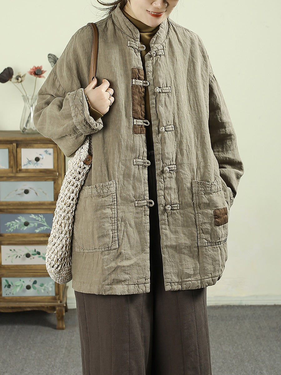 מעיל צווארון עומד 100% פשתן טלאים אתניים לחורף לנשים