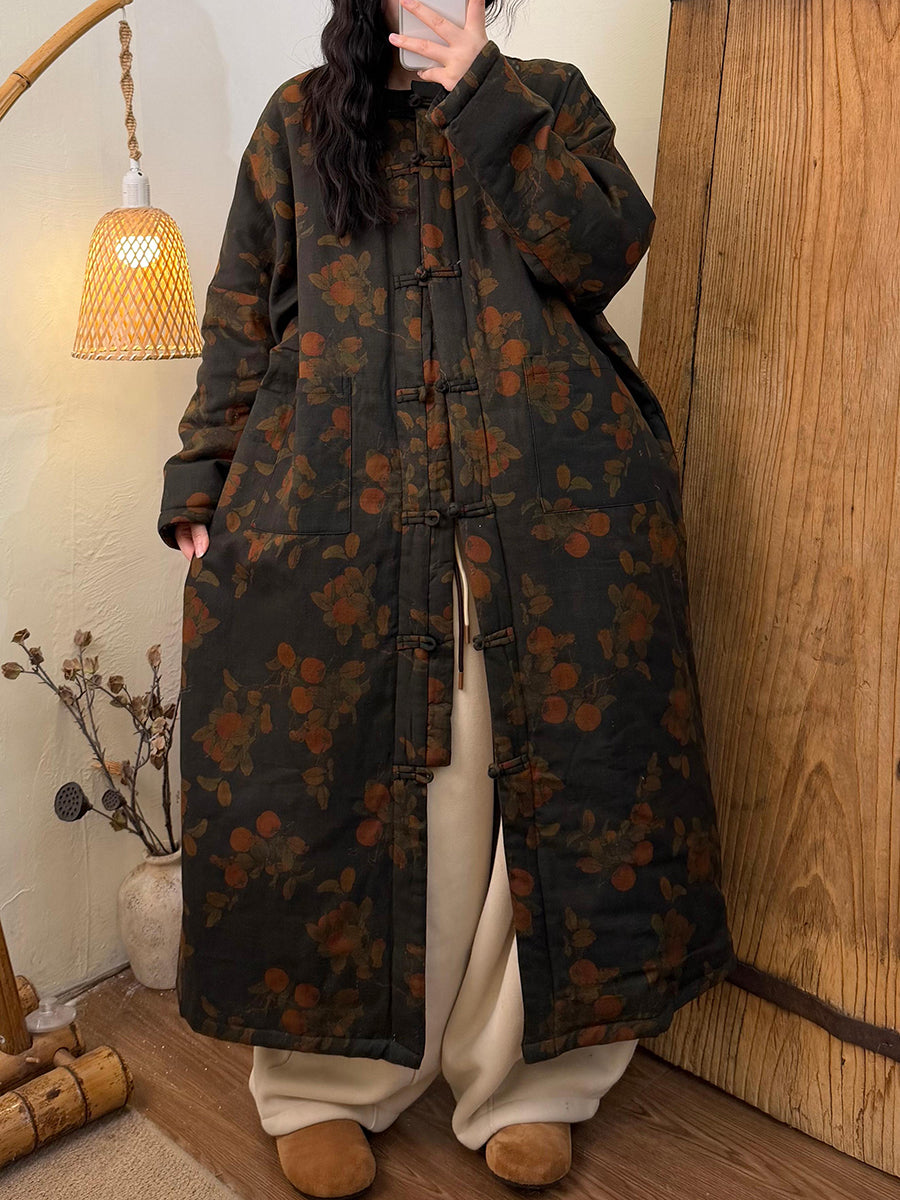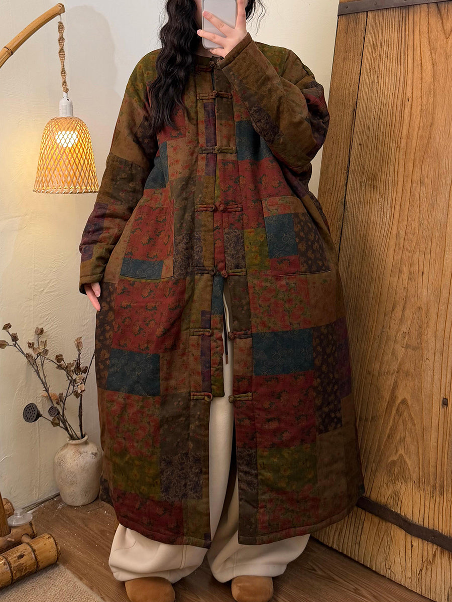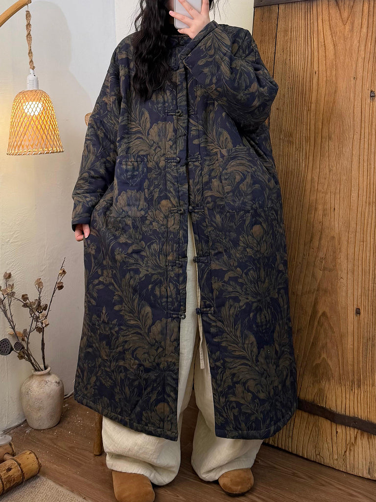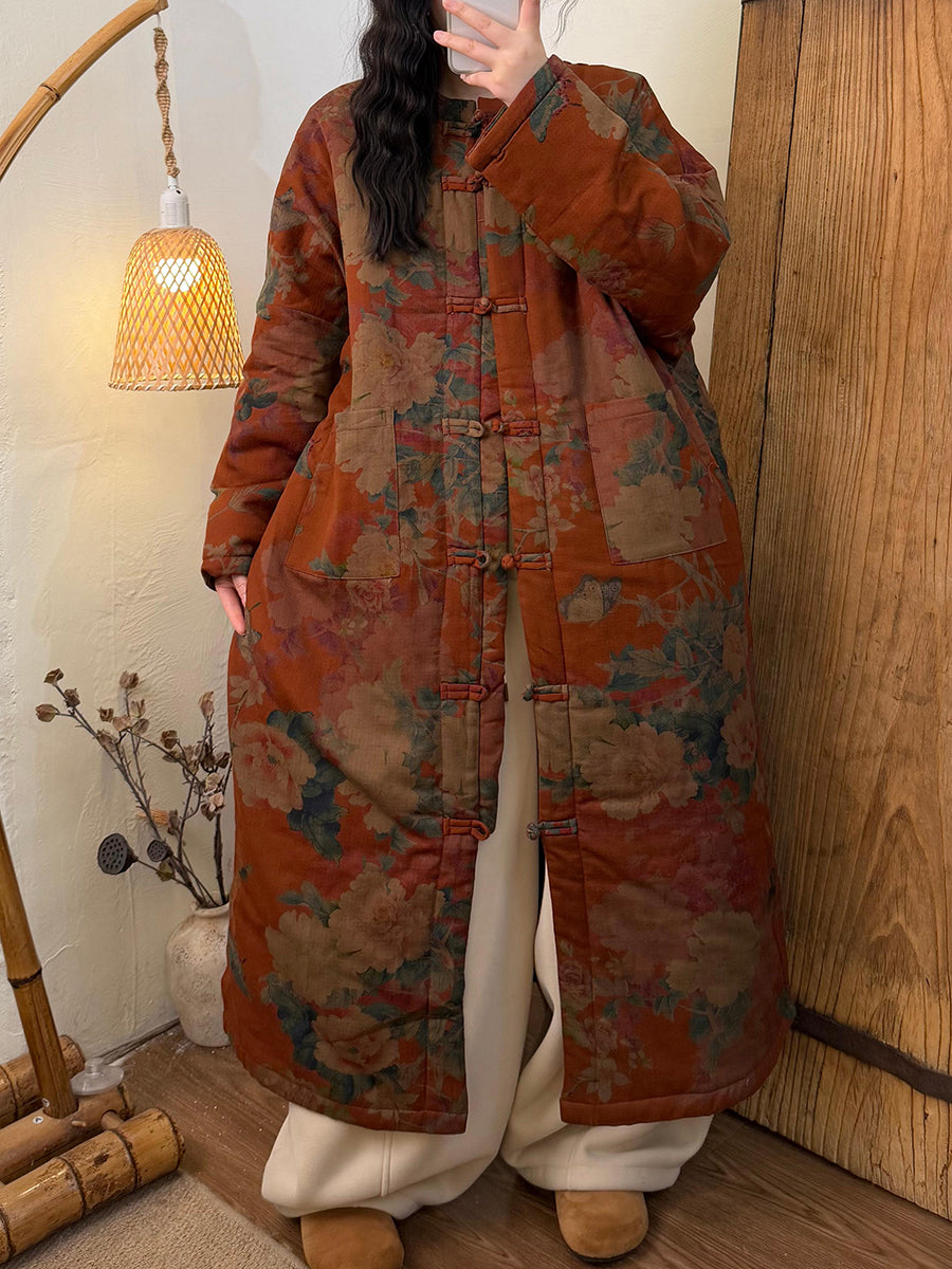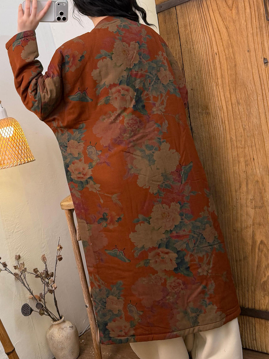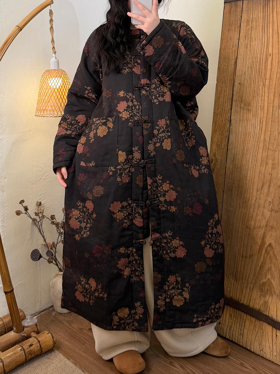 מעיל ארוך מרופד פרחוני עם צווארון O לנשים בחורף