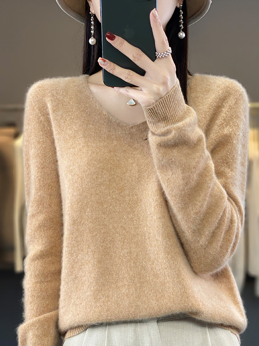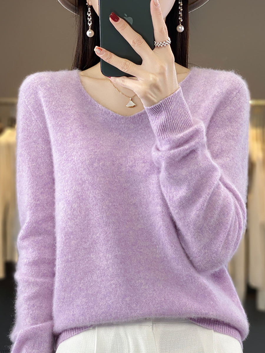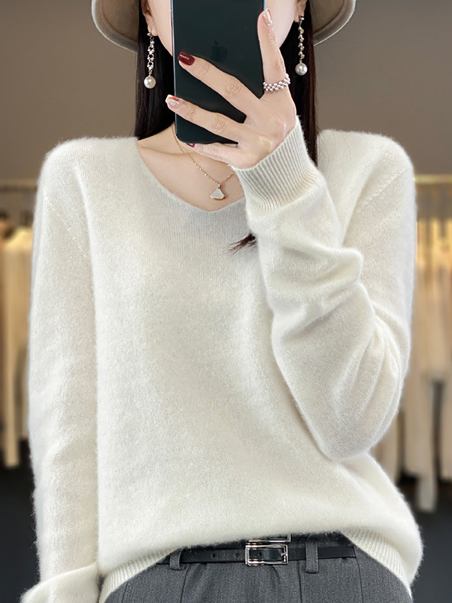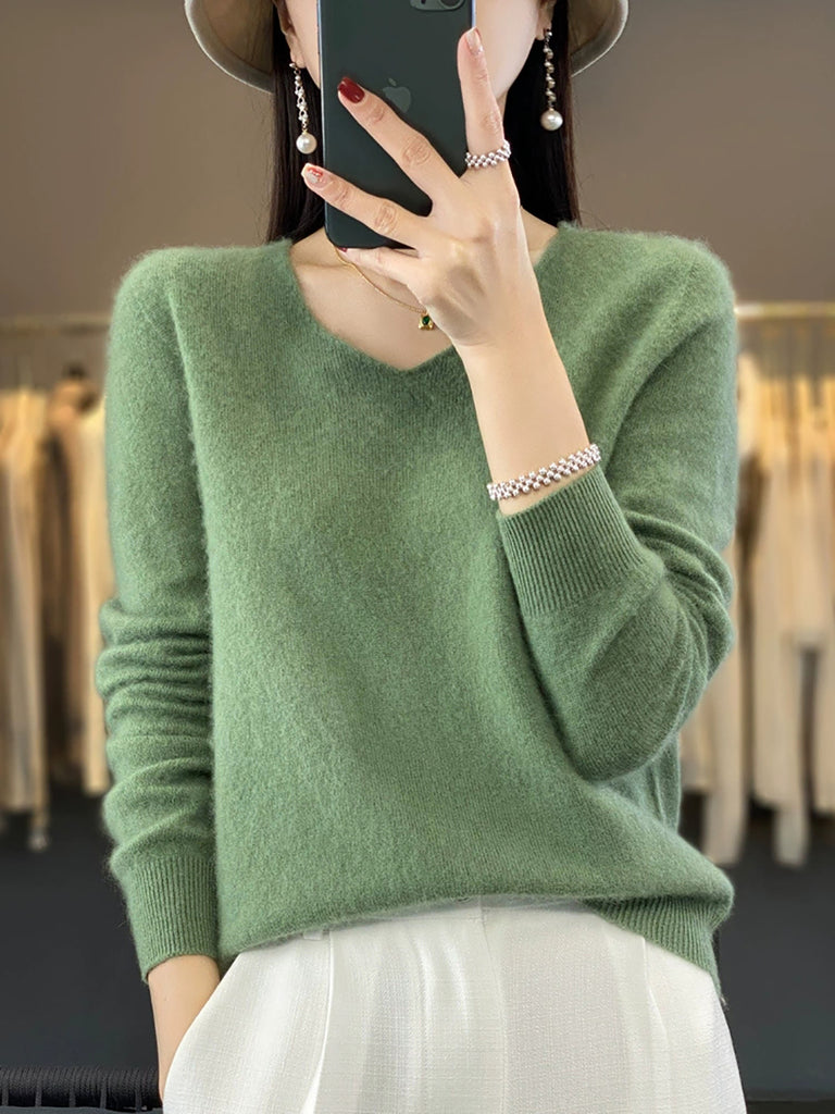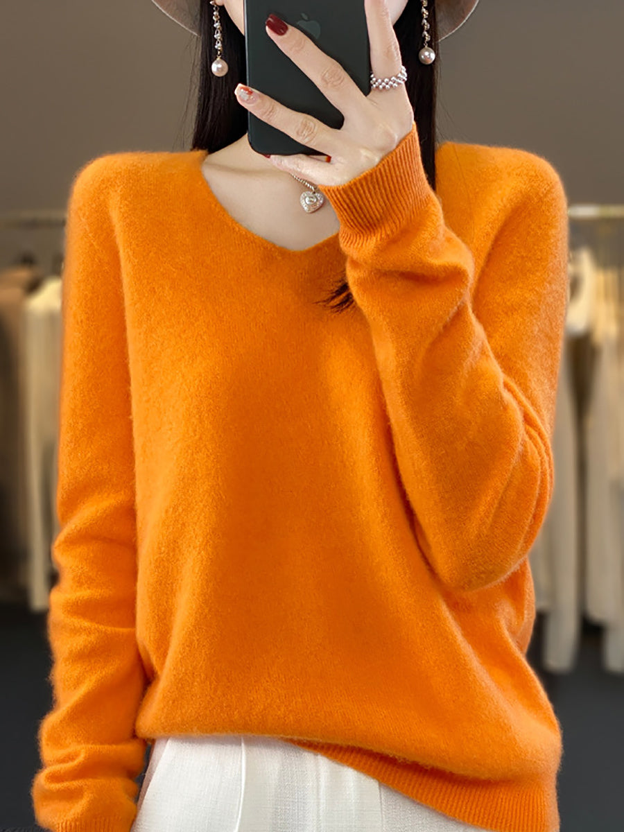 סוודר צווארון V בצבע טהור לחורף לנשים