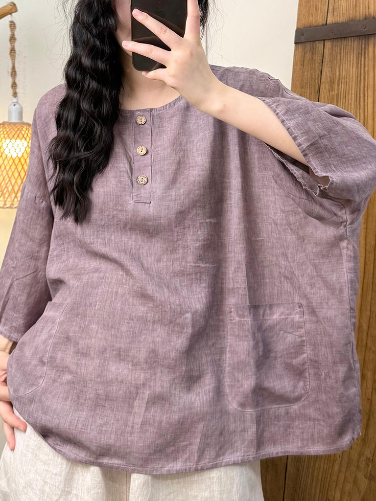 חולצת פשתן O-צוואר בצבע טהור רטרו לקיץ לנשים