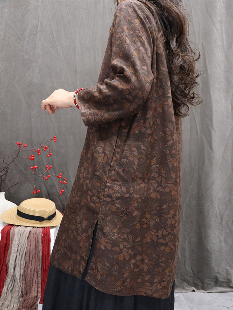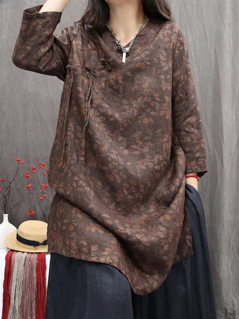 חולצת צווארון V פרחונית 100% פשתן לנשים בסגנון סתיו רטרו