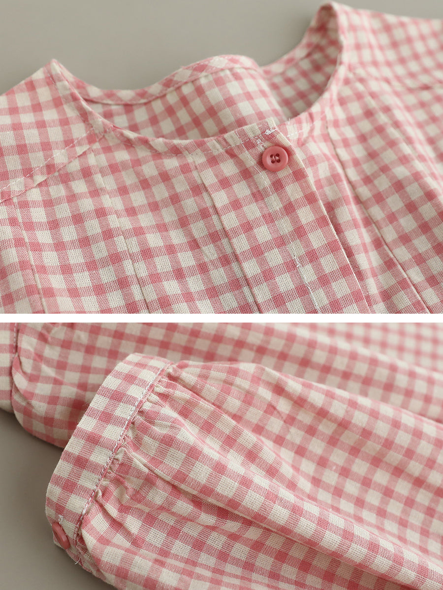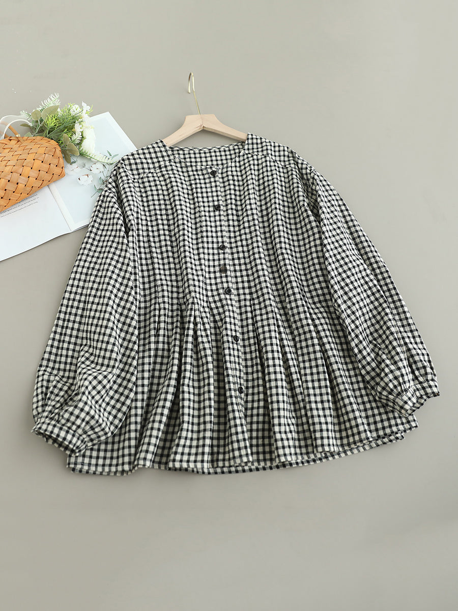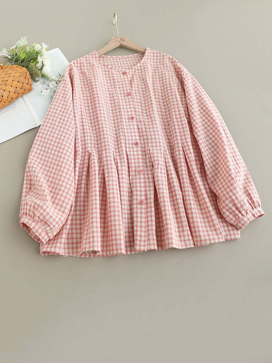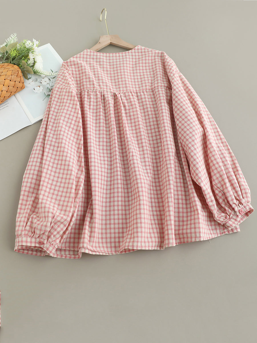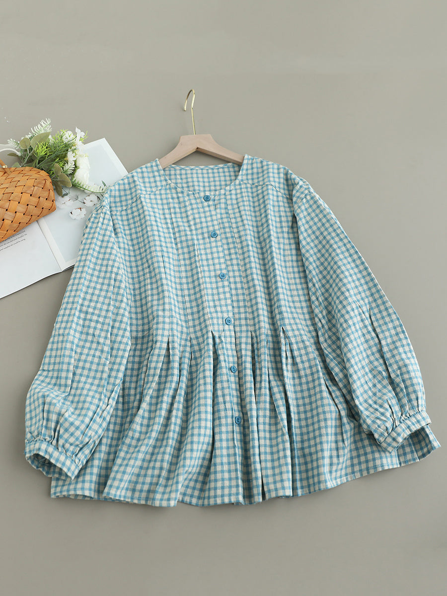 Women Artsy Spring Plaid O-Neck Doll 100%Cotton Shirt