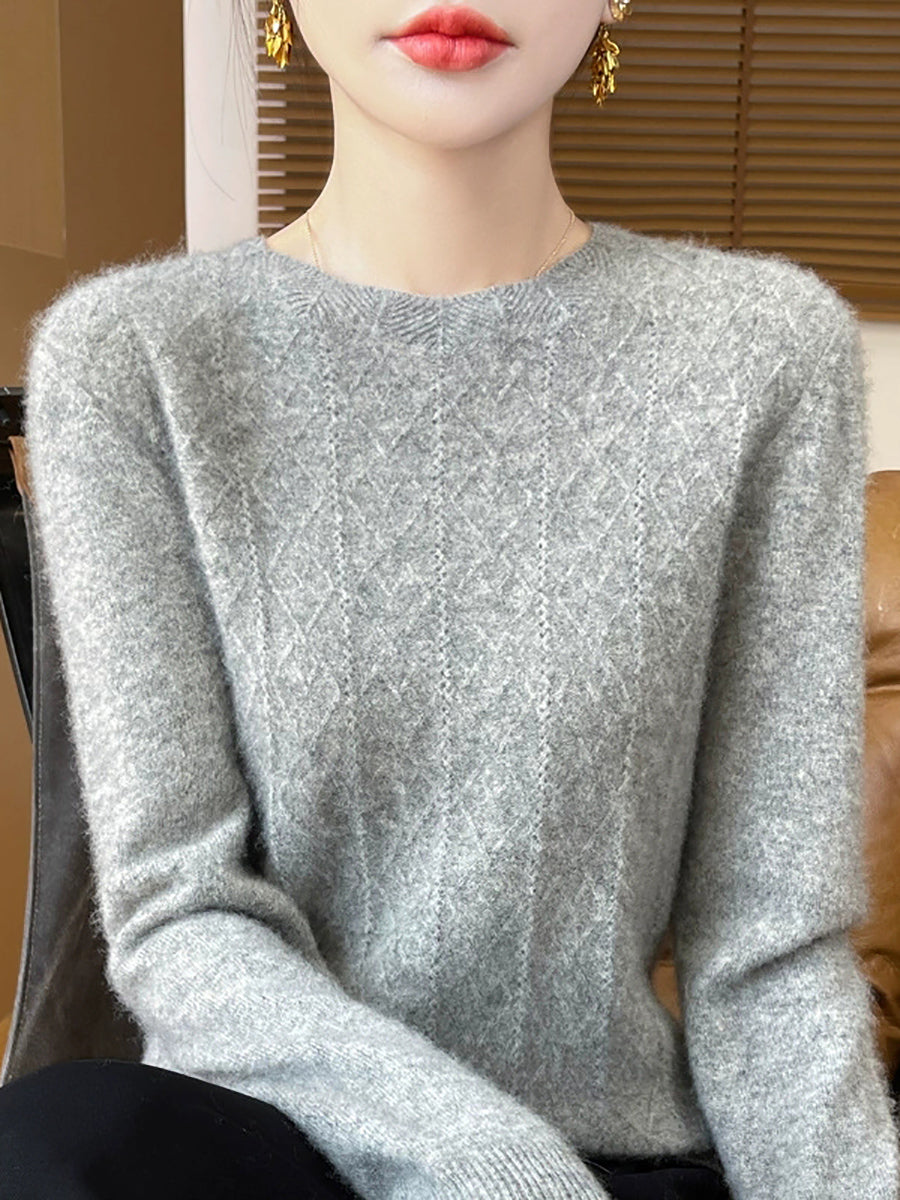 Women Artsy Pure Color Cable Knit O-Neck Sweater