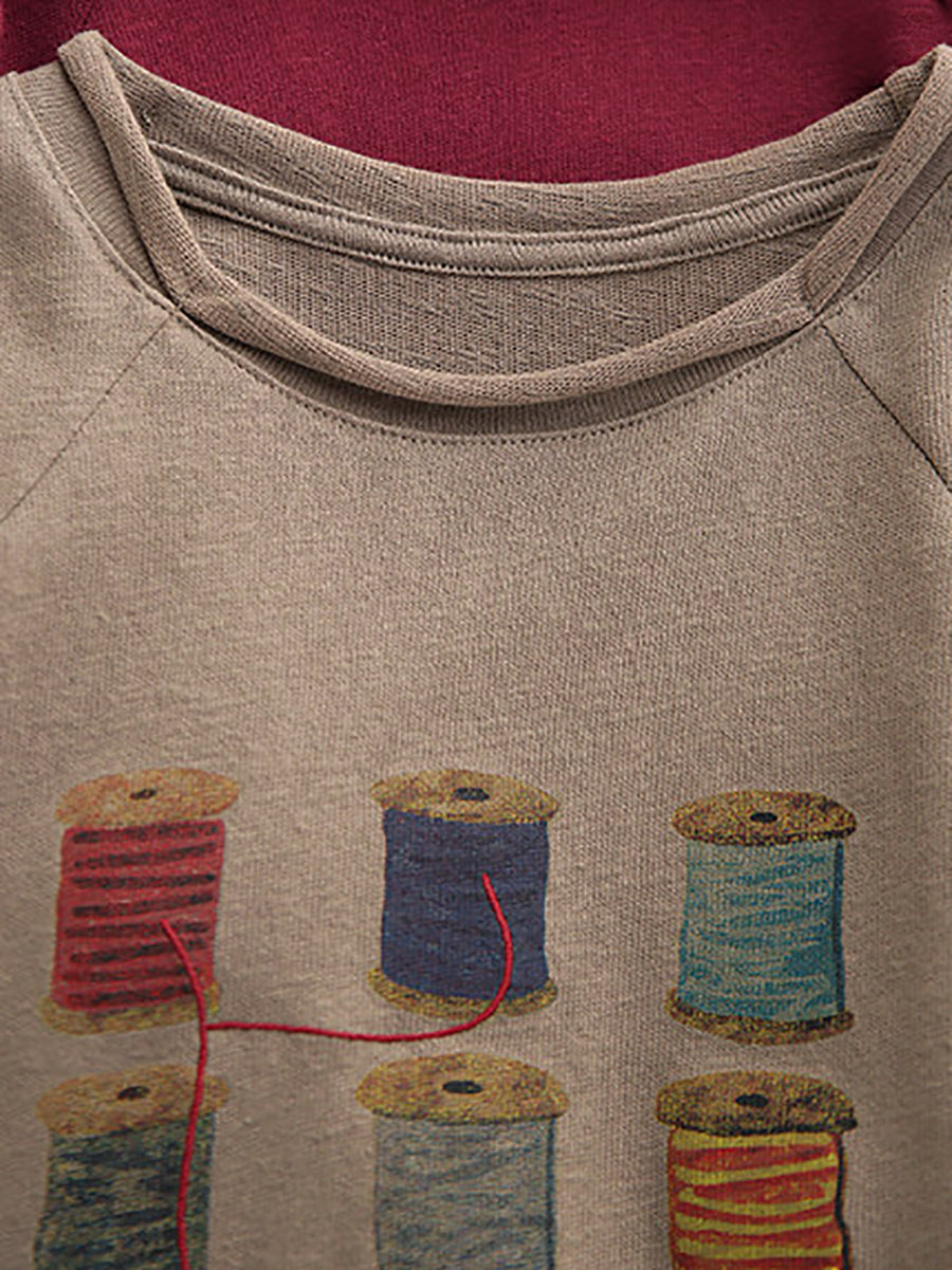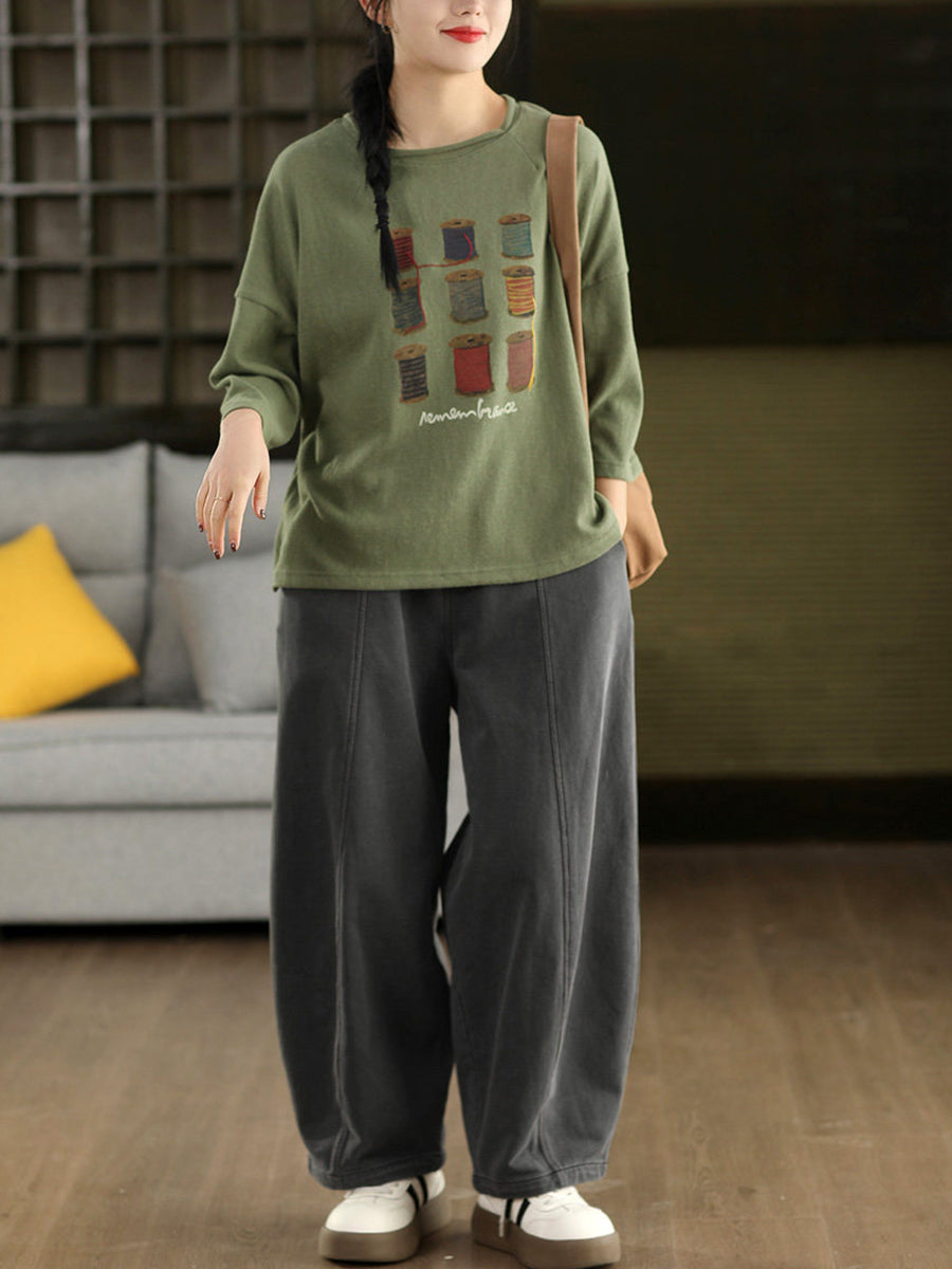 Women Spring Artsy Print Cotton O-Neck Blouse