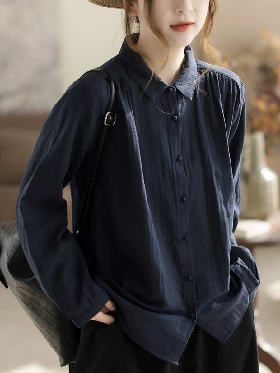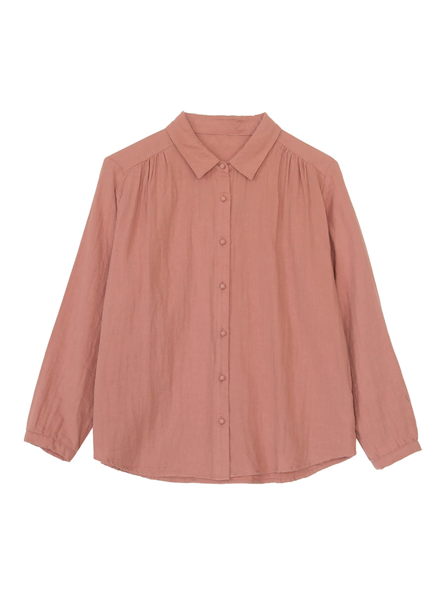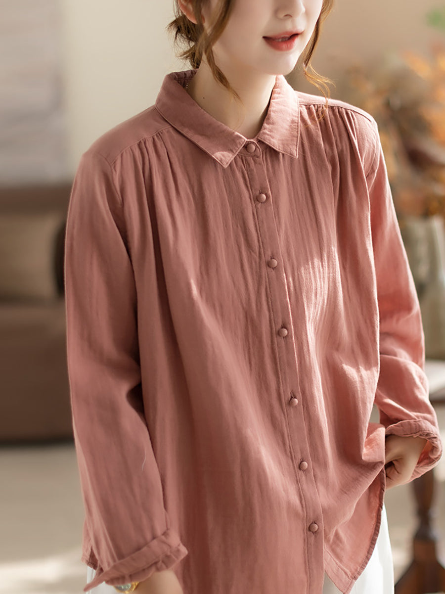 Women Spring Artsy Pure Color 100%Cotton Turn-down Collar Shirt