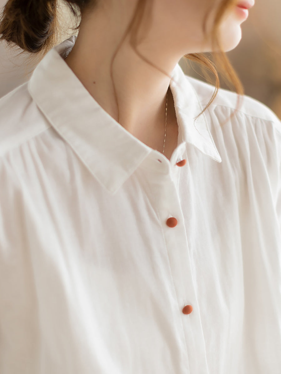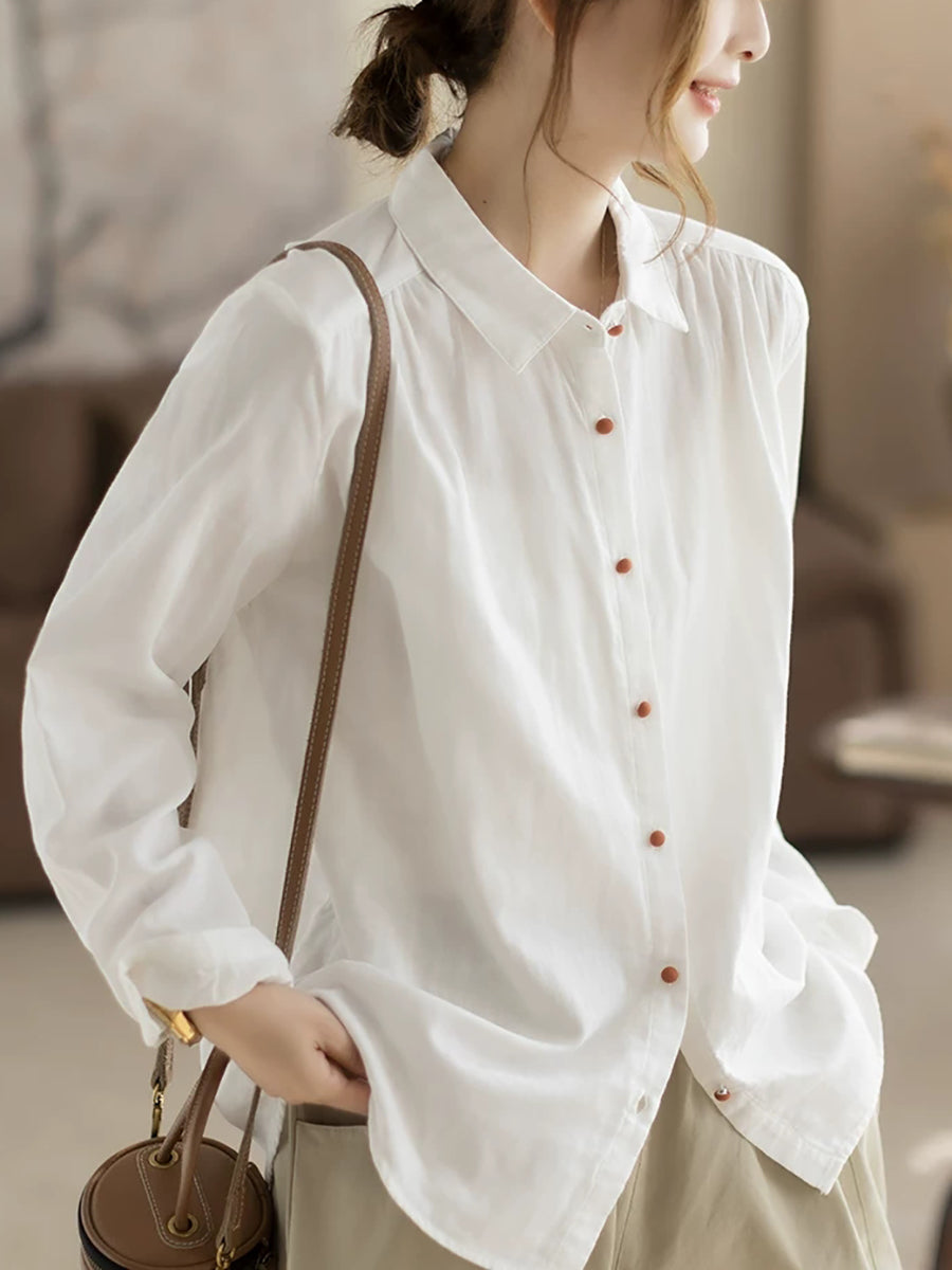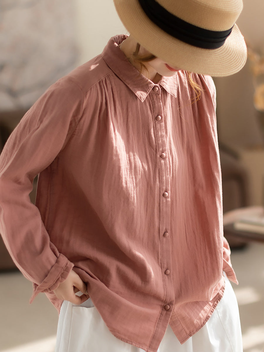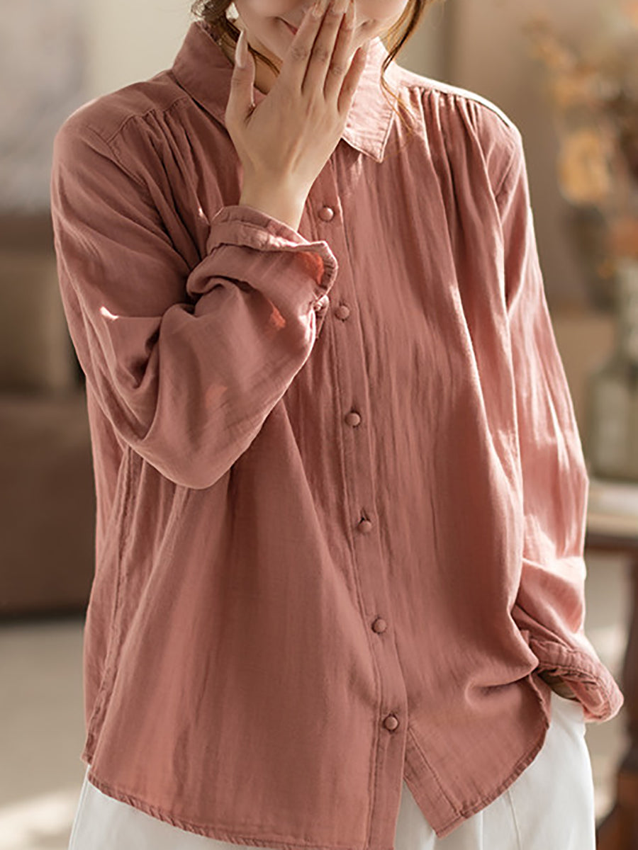 Women Spring Artsy Pure Color 100%Cotton Turn-down Collar Shirt