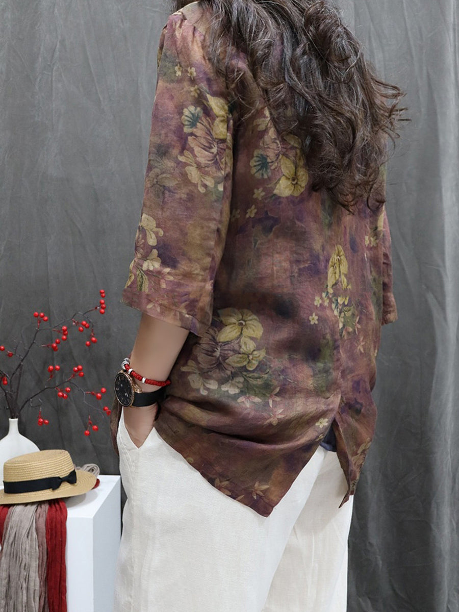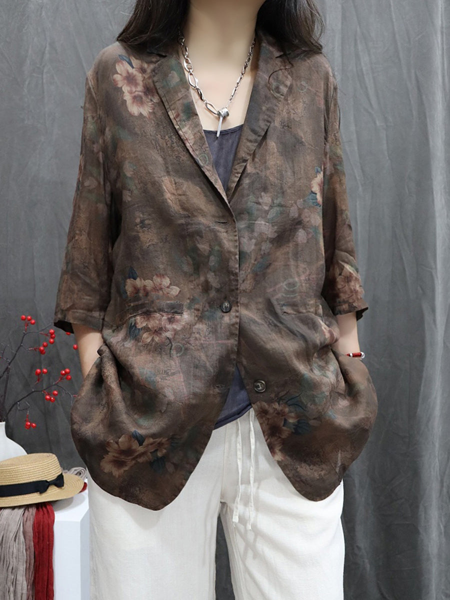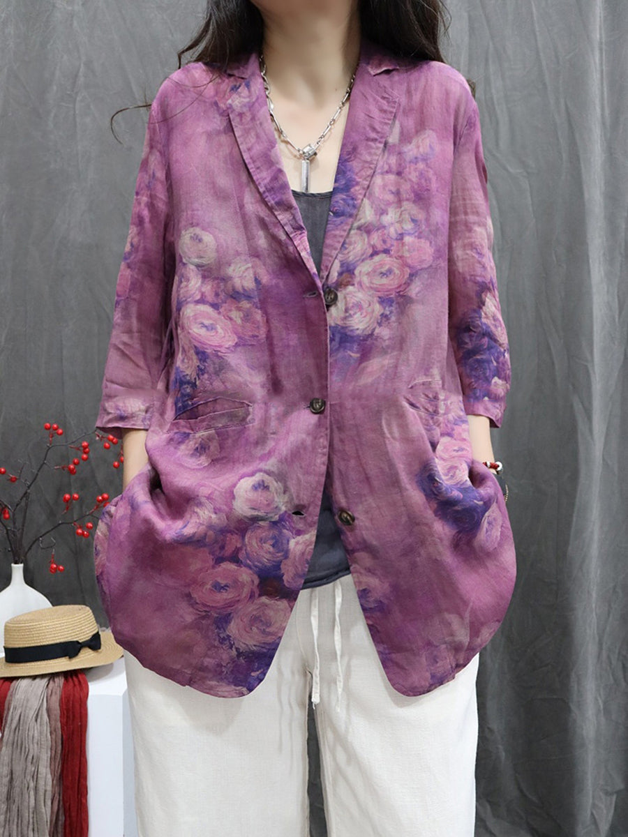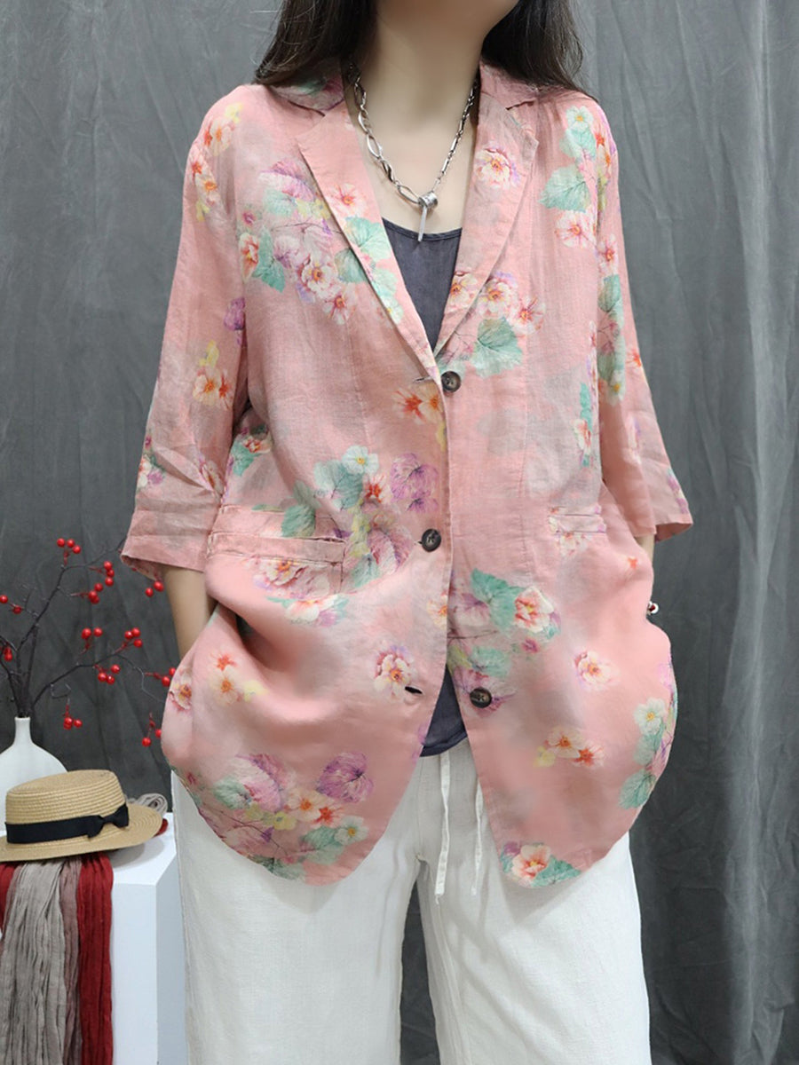 Women Spring Flower 100%Ramie Turn-down Collar Coat
