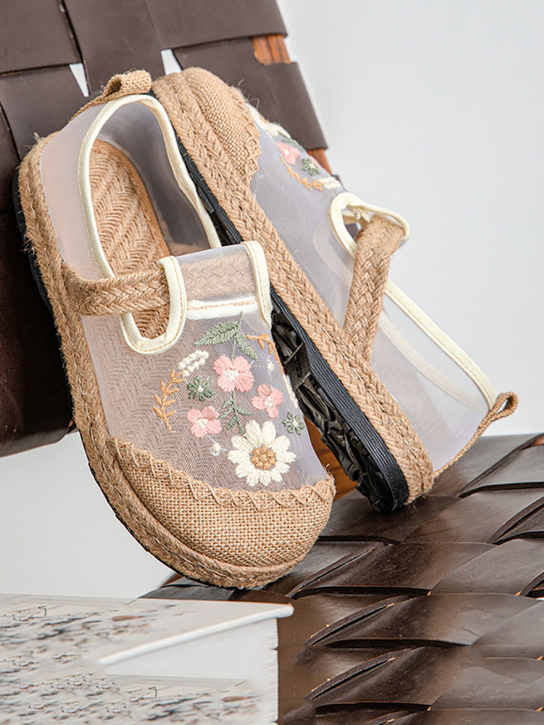 Women Summer Artsy Flower Embroidery Linen Slippers