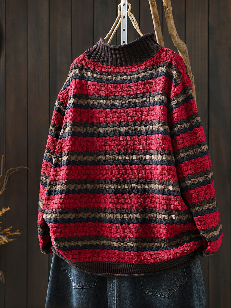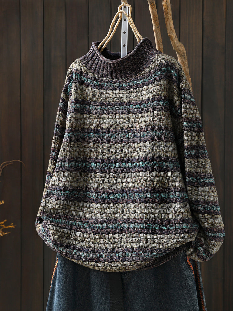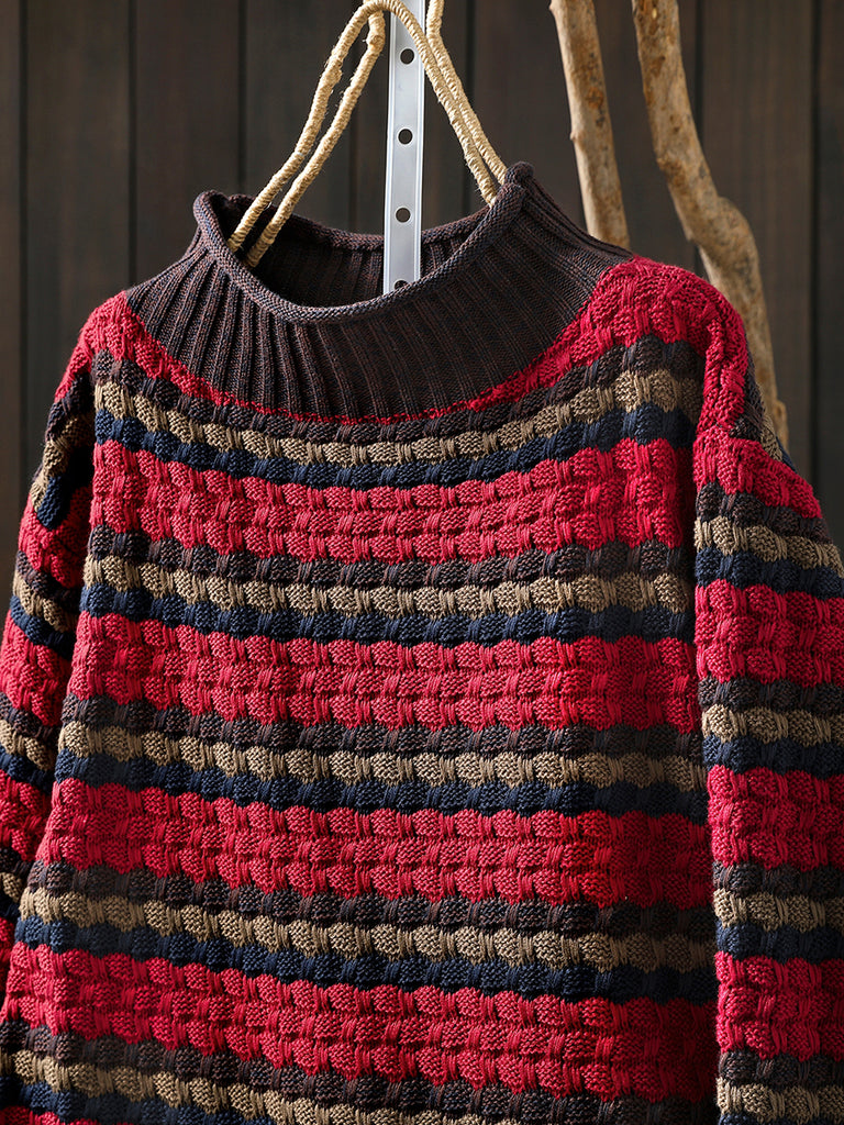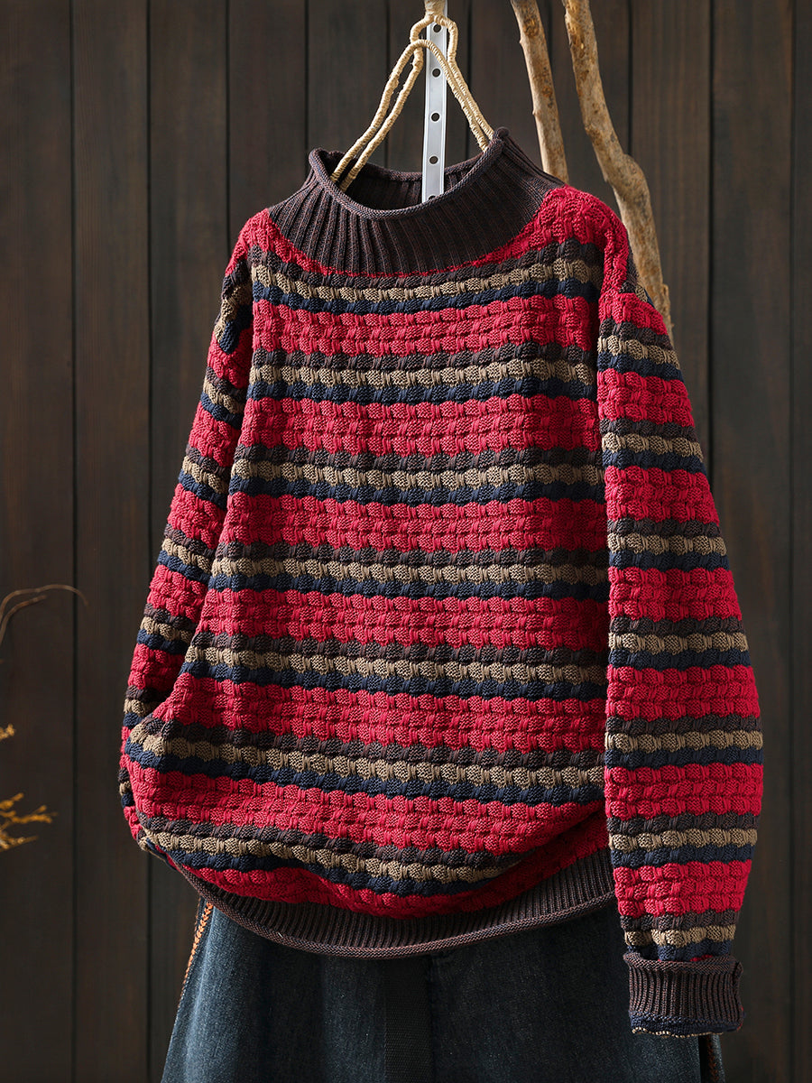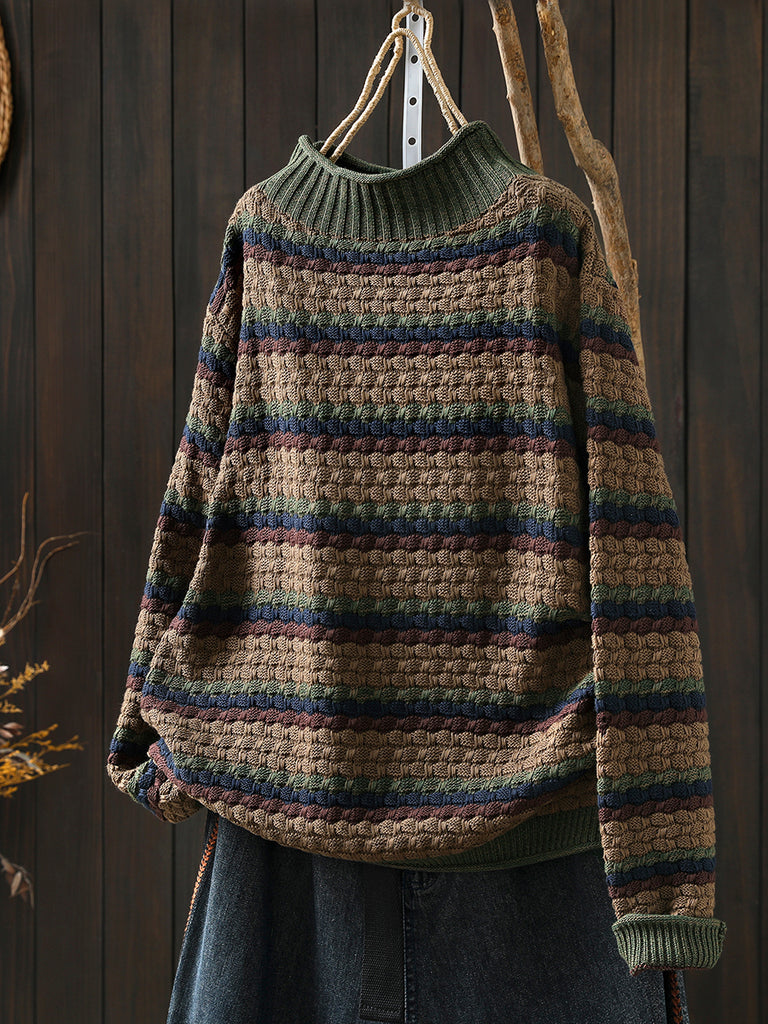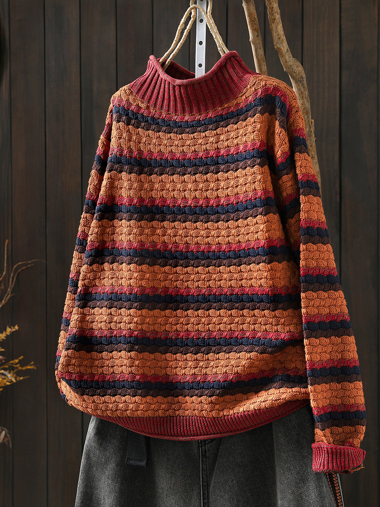 Women Autumn Artsy Colorblock Stripe Half-Turtleneck Sweater