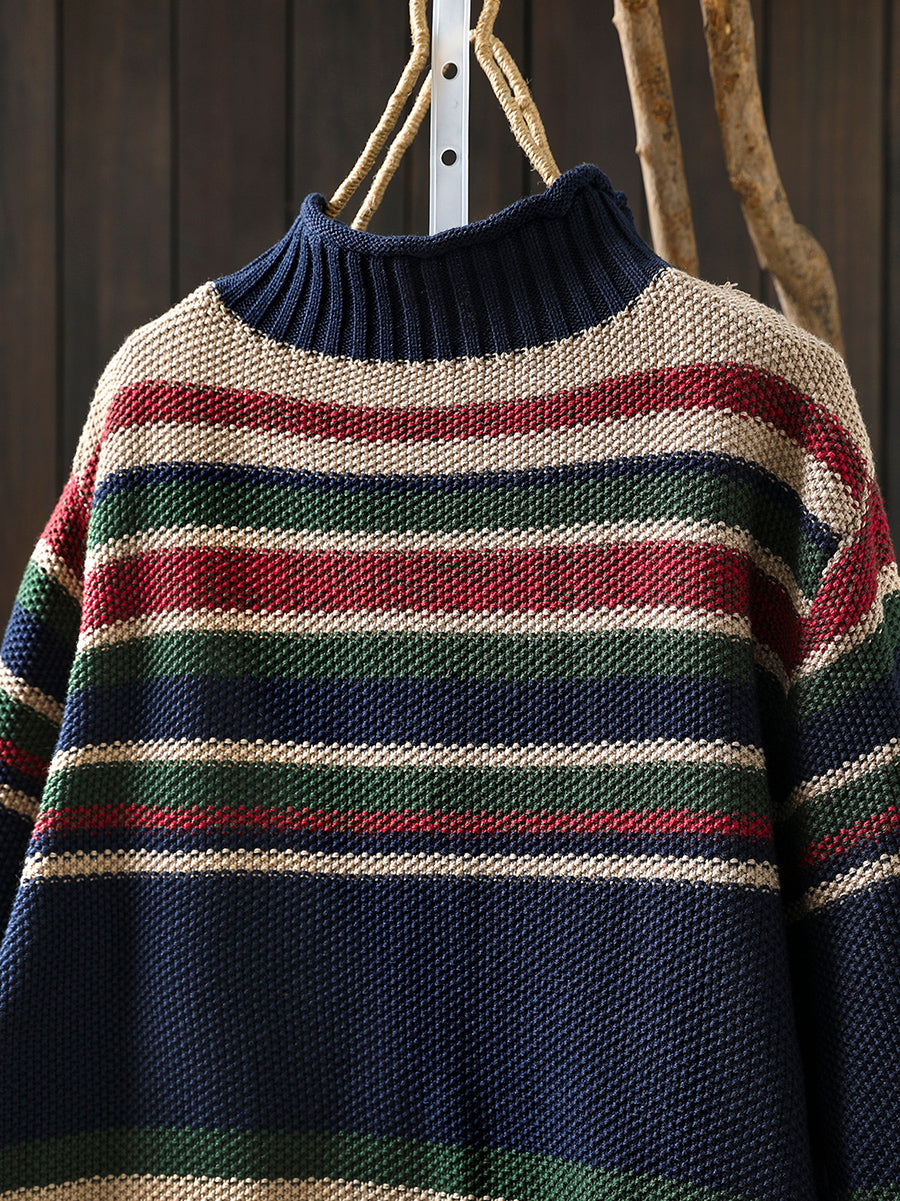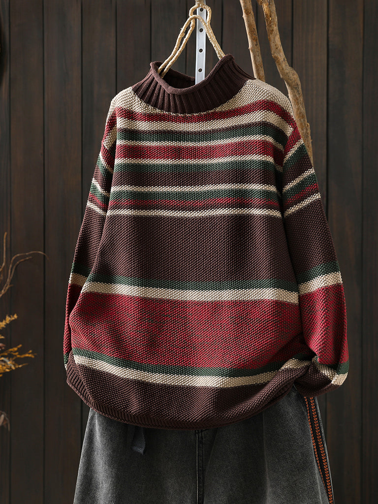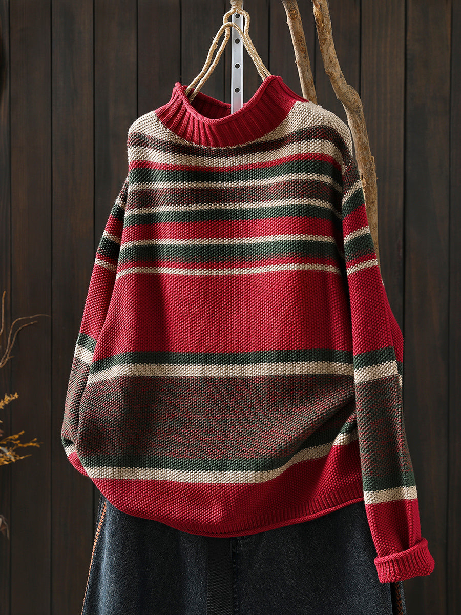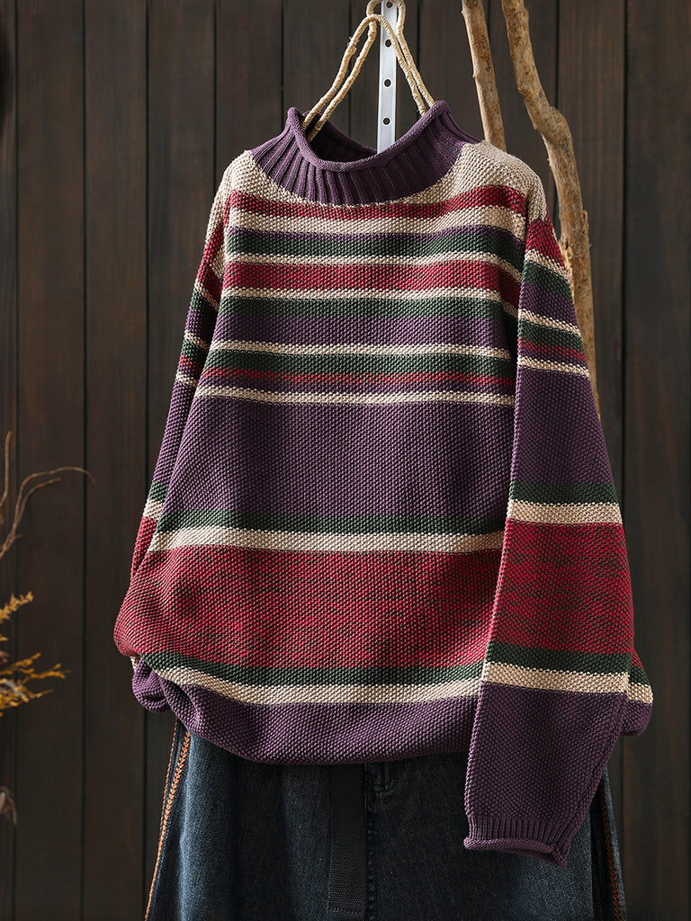 Women Autumn Artsy Colorblock Stripe Half-Turtleneck Sweater