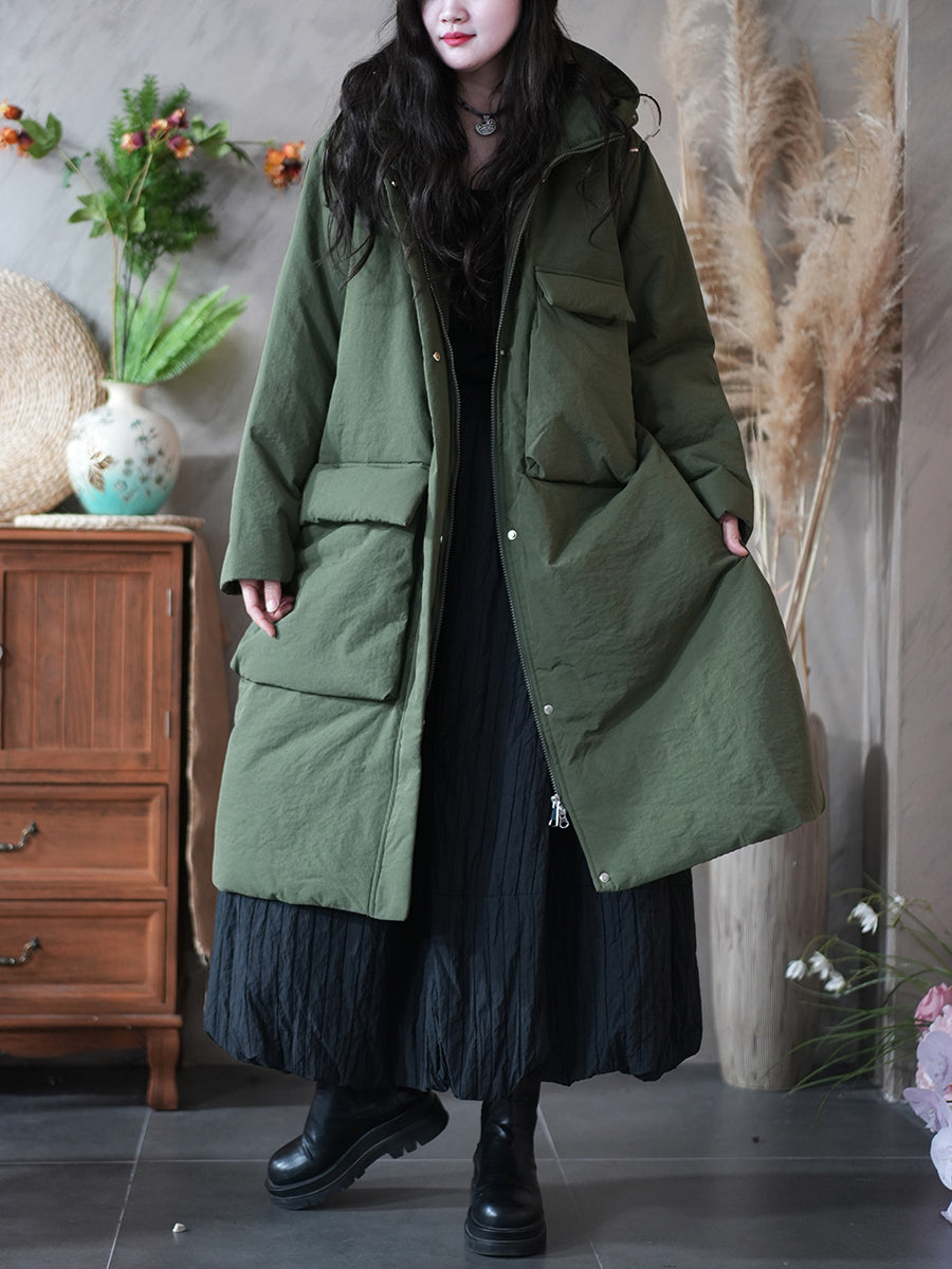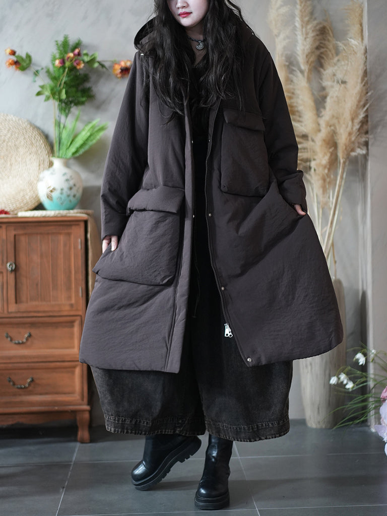 Women Winter Pure Color Pocket Padded Hooded Coat