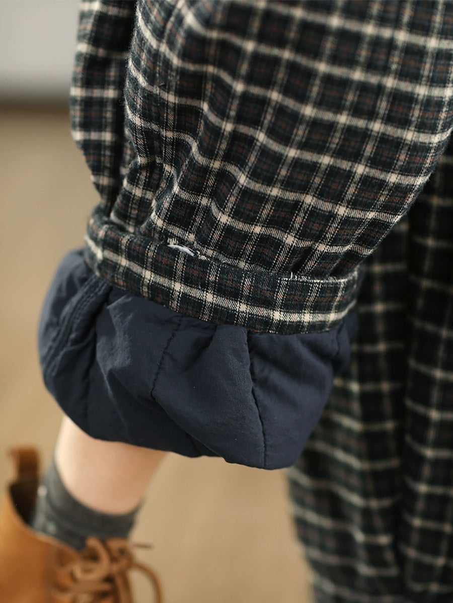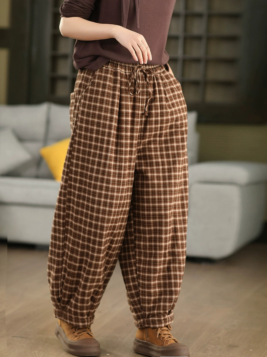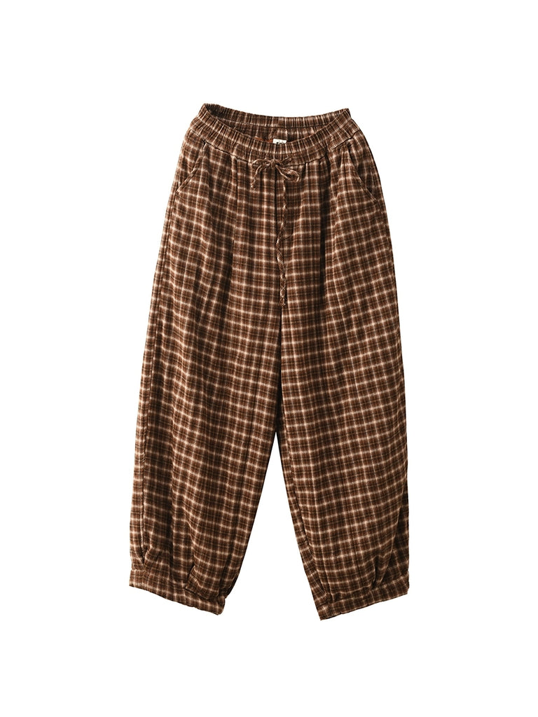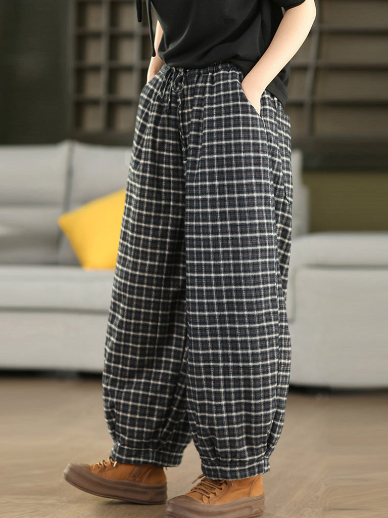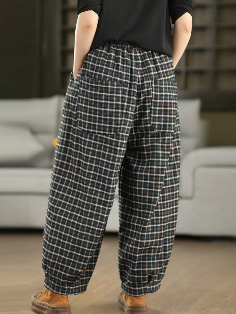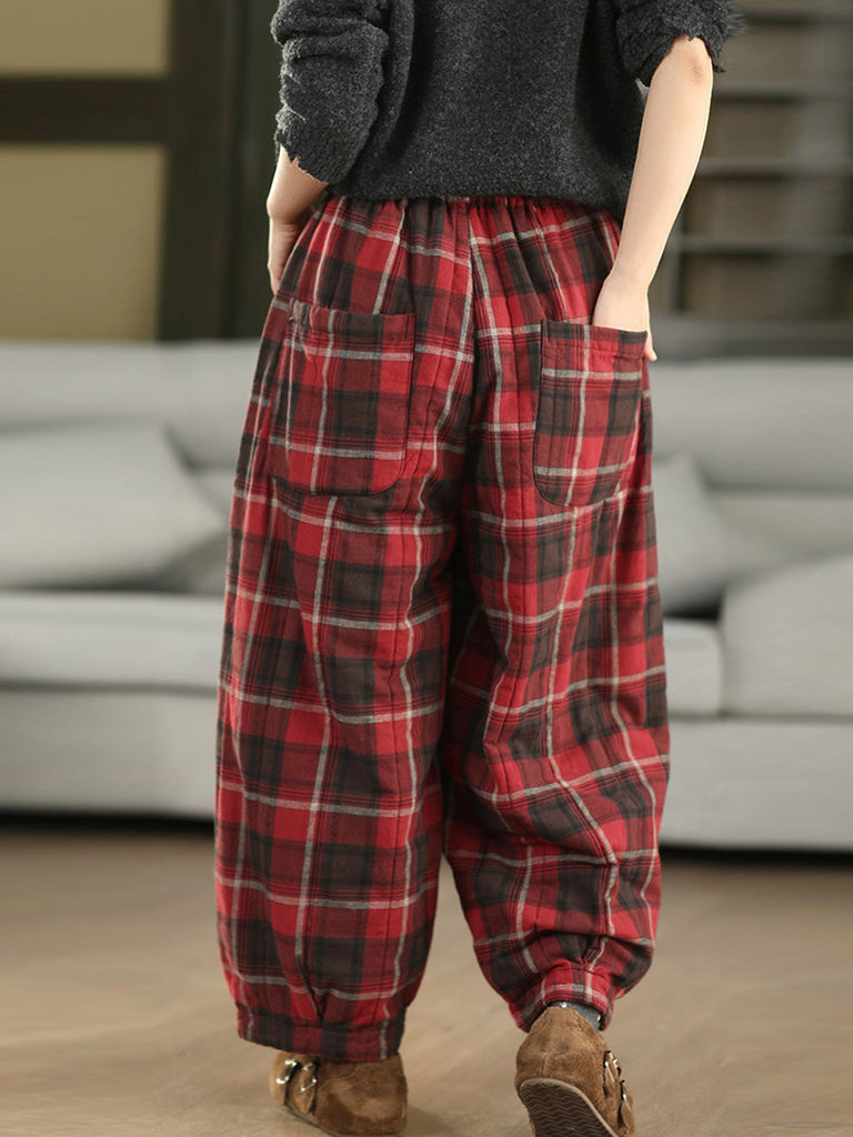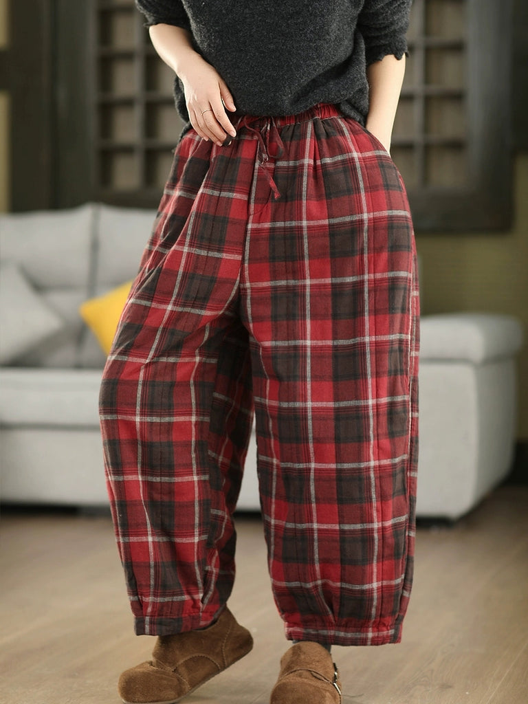 Women Winter Retro Plaid 100%Cotton Padded Harem Pants