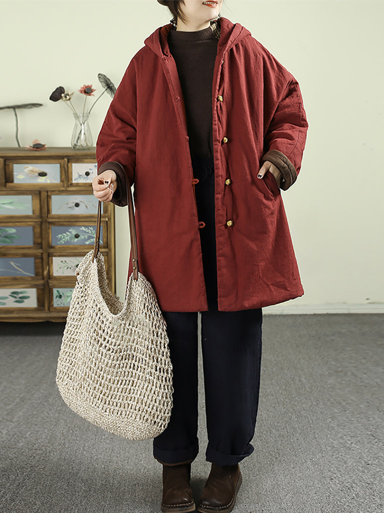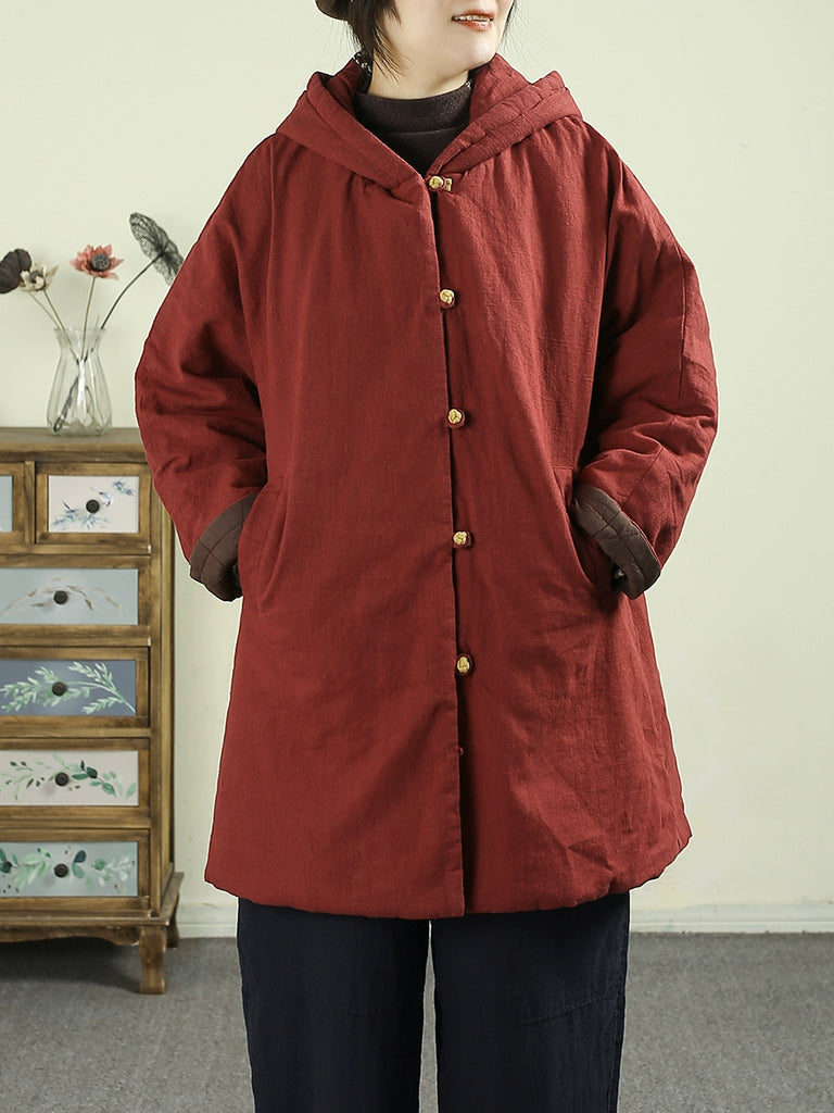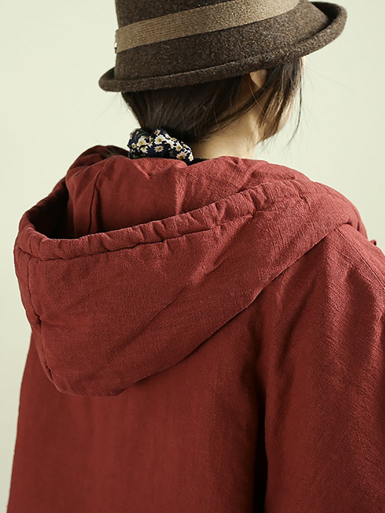 Women Winter Retro Pure Color 100%Linen Hooded Coat