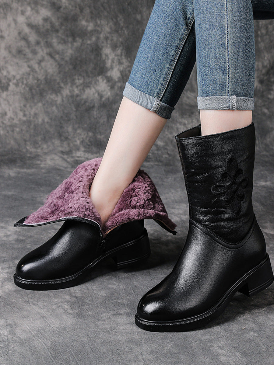 Women Winter Genuine Leather Fleece-lined Mid Heel Boots