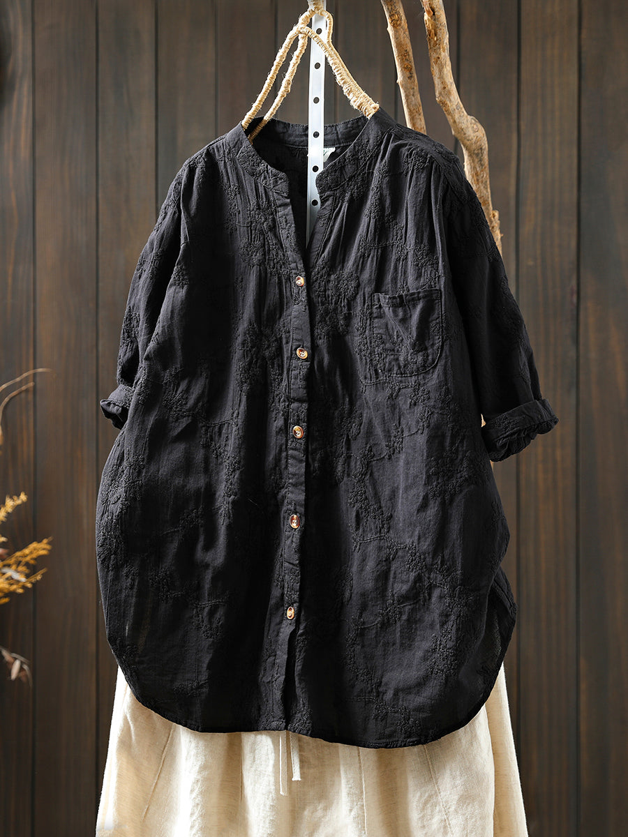 Women Summer Artsy Flower Embroidery V-Neck 100%Cotton Shirt
