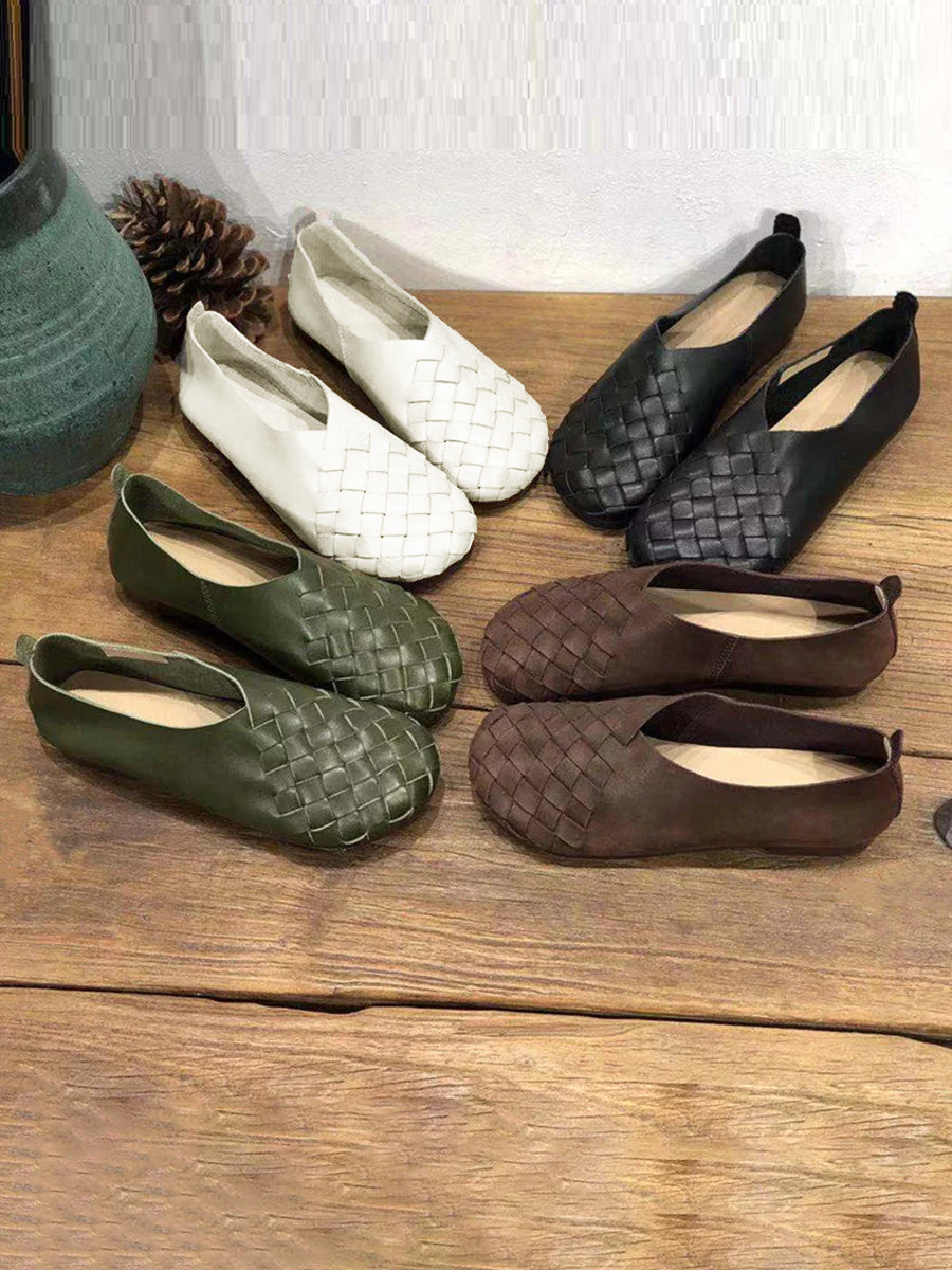 Leather Women Solid Color Woven Round Toe Flat Shoes