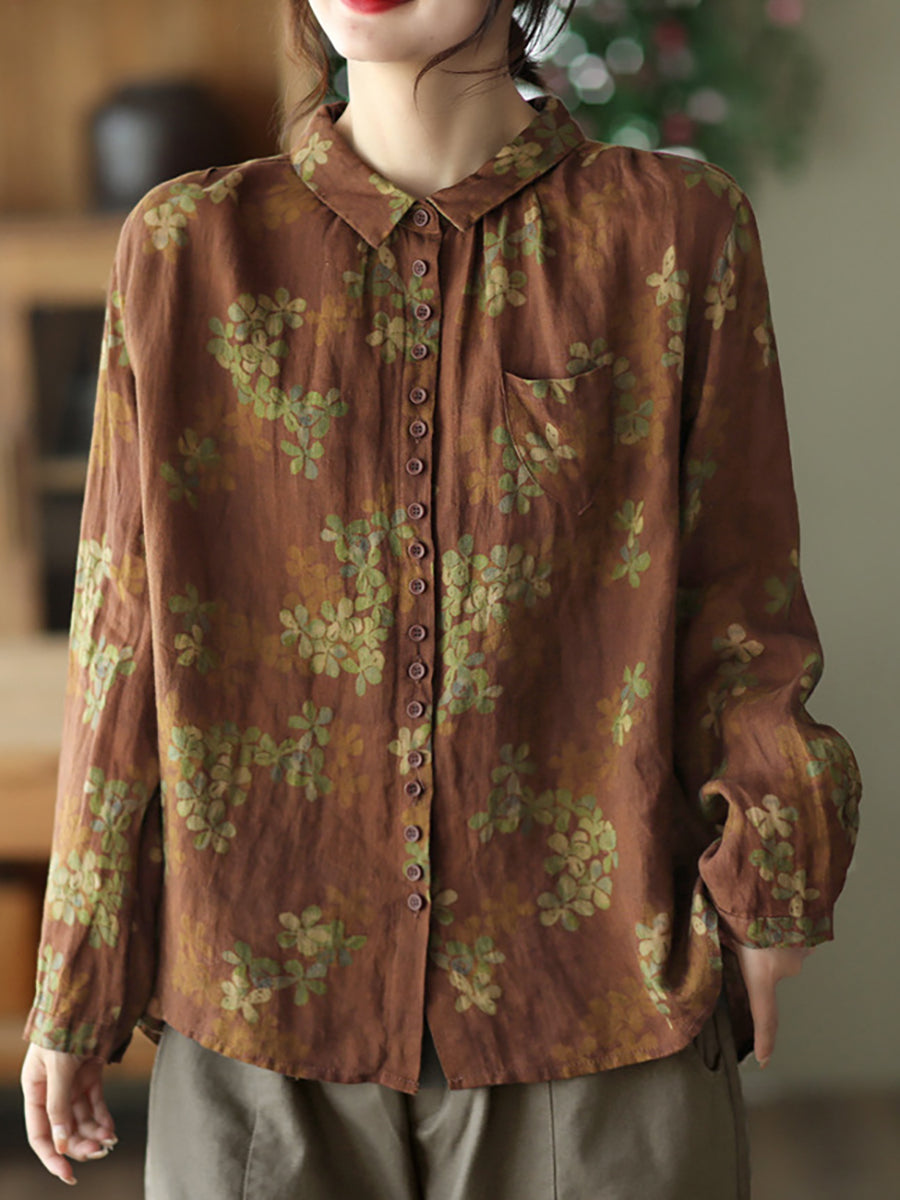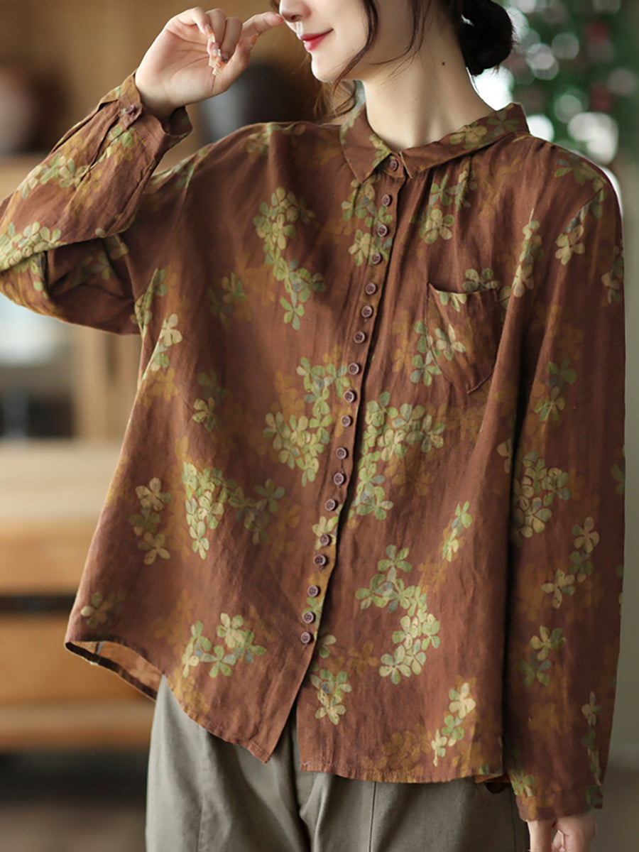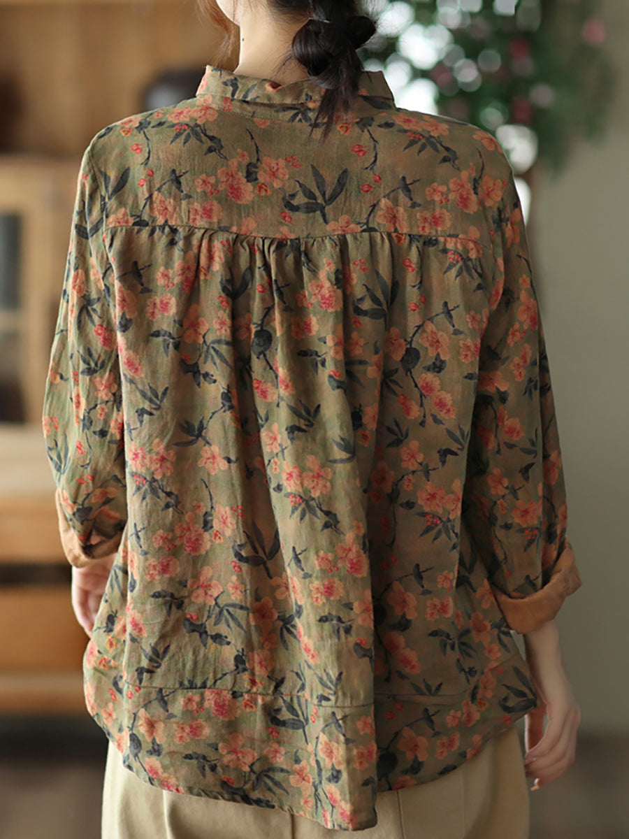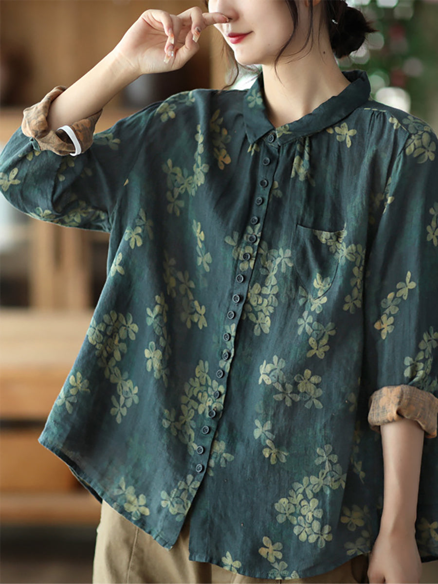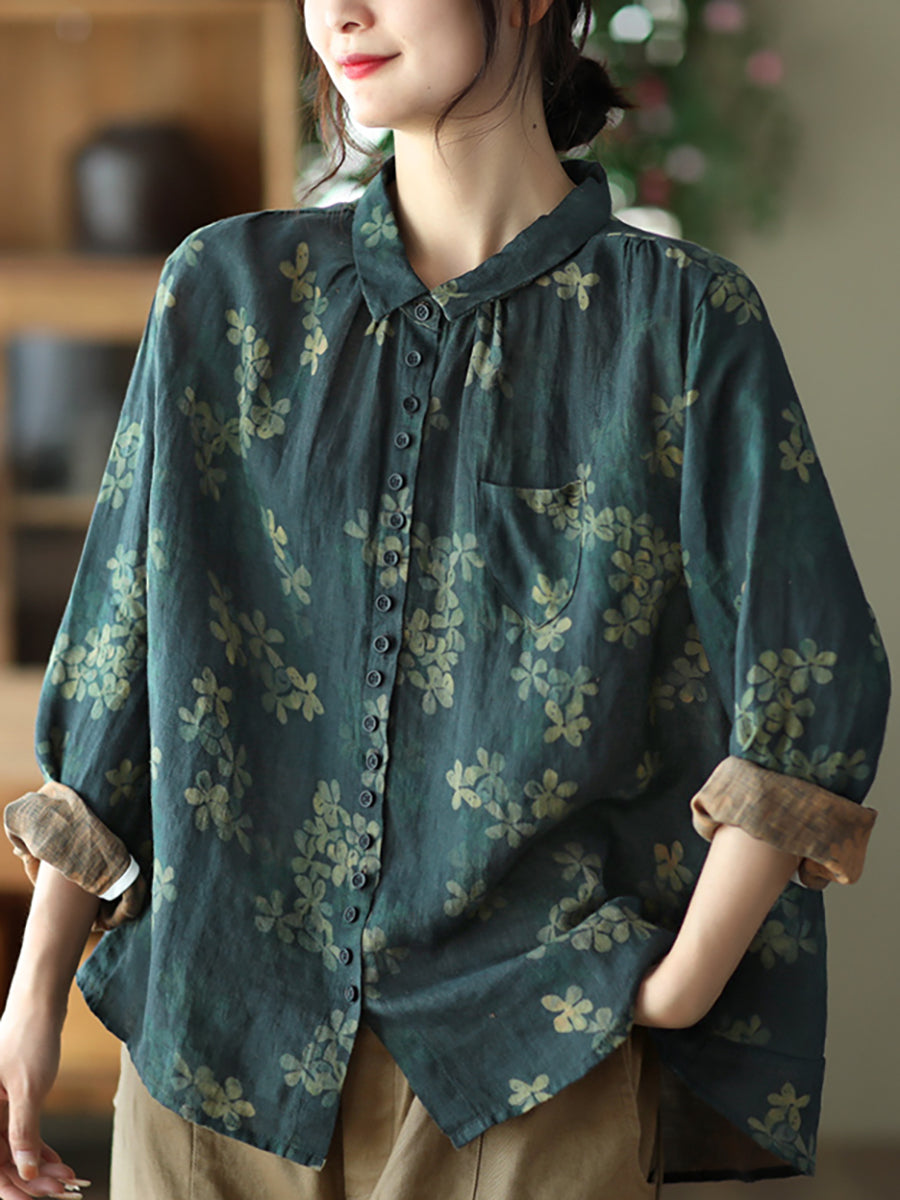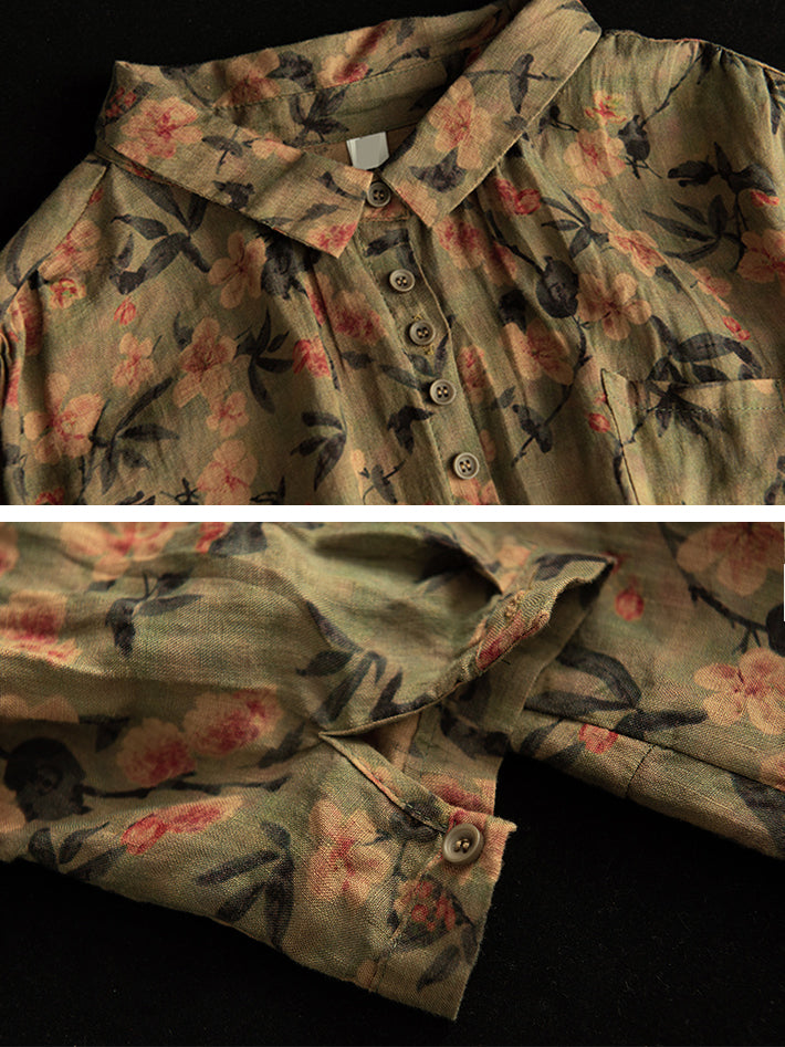 Summer Vintage Printed Linen Shirt Turn-down Collar Top