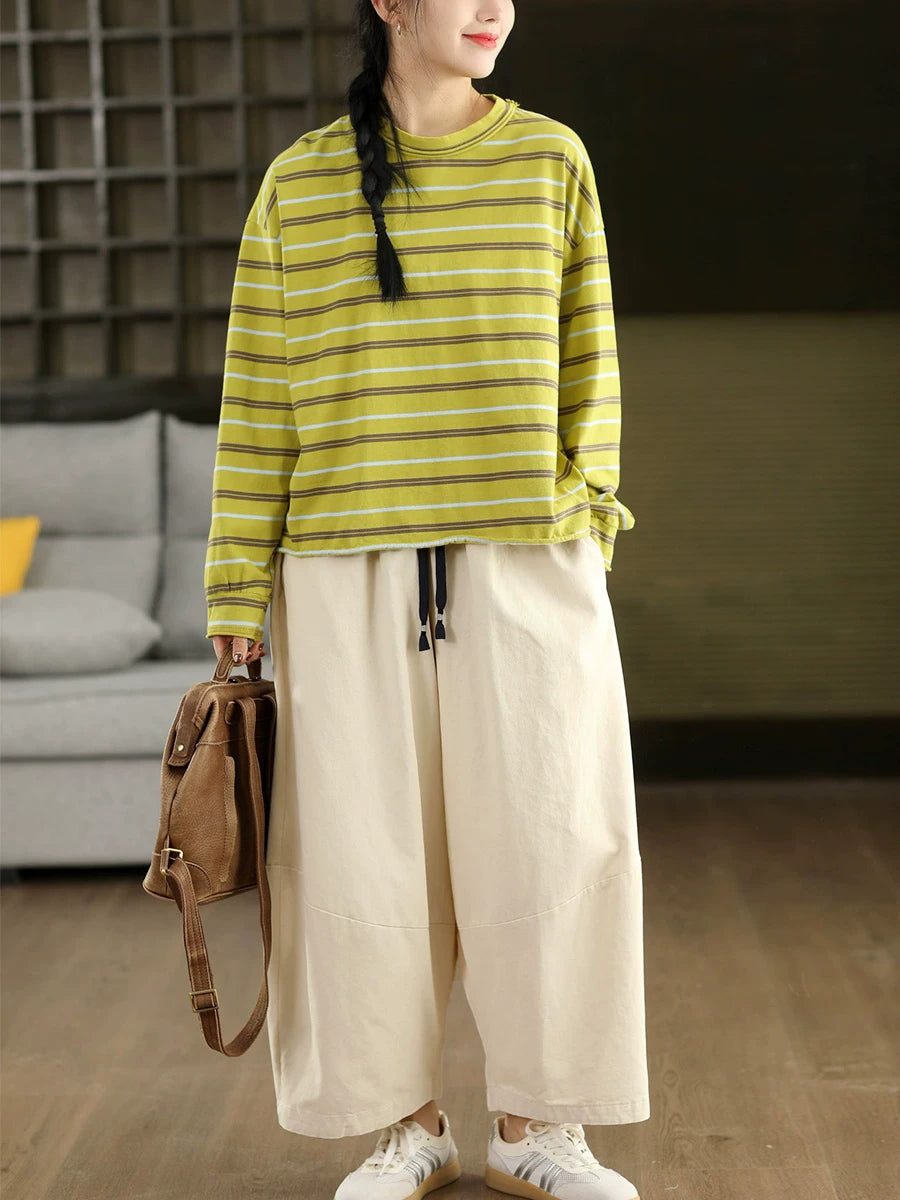 Women Artsy Spring Stripe Cotton O-Neck Blouse