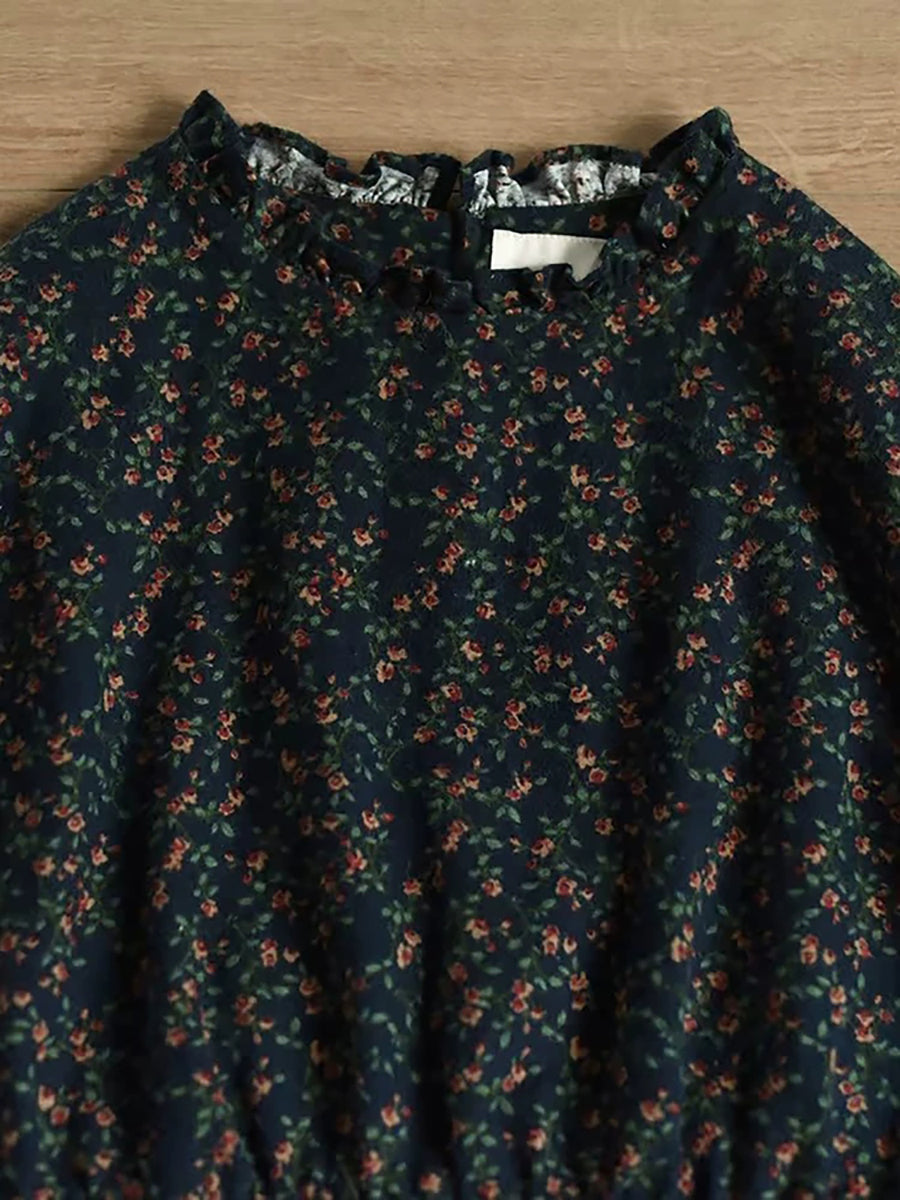Women Autumn Artsy Floral Stand Collar Cotton Dress