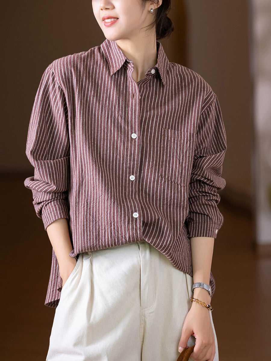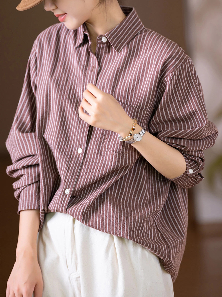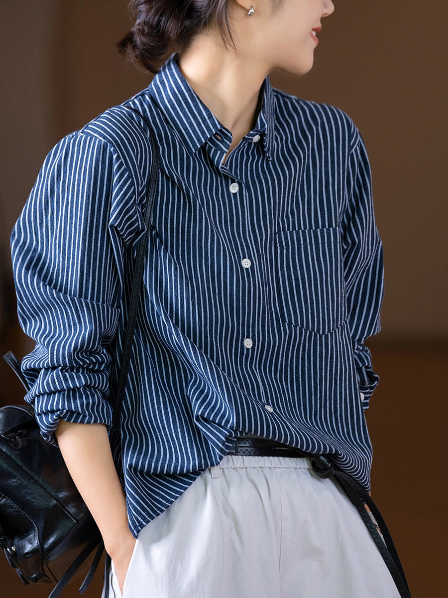 Women Autumn Stripe Turn-down Collar 100%Cotton Shirt