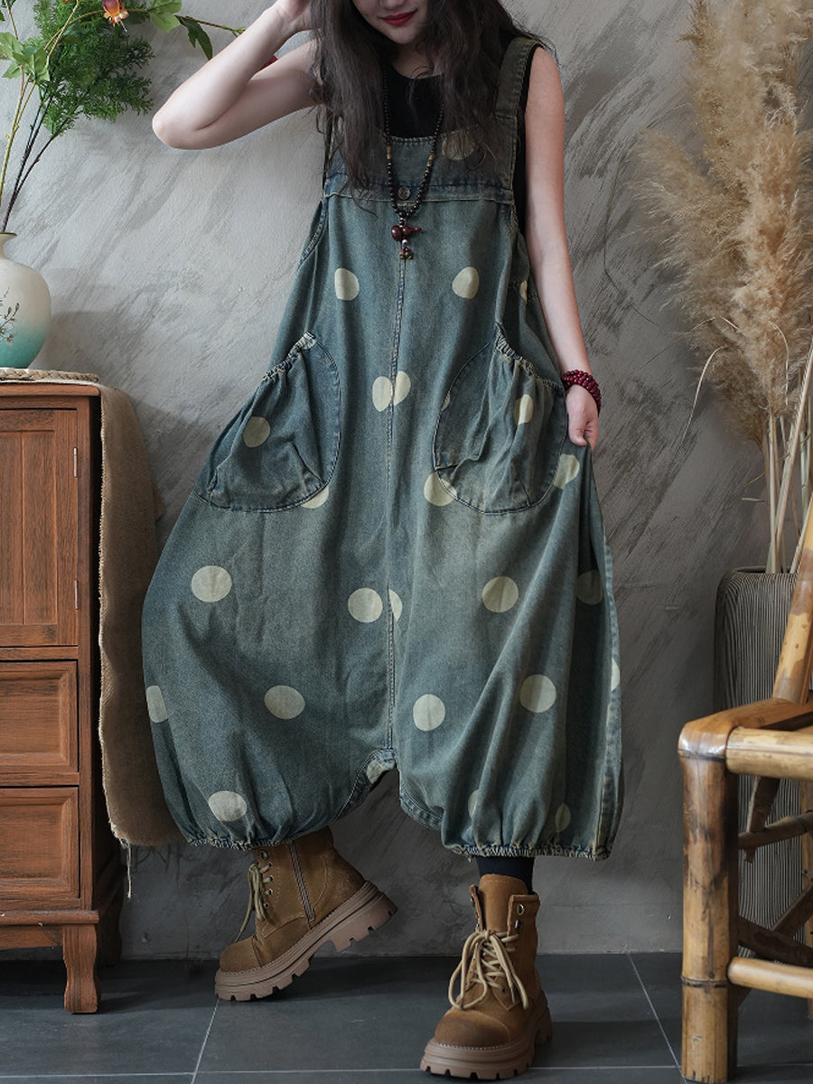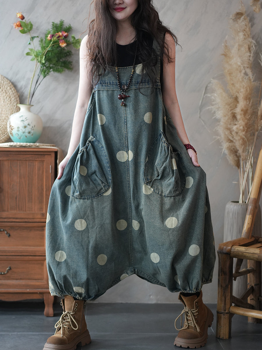 Women Casual Dot Denim Low Crotch Jumpsuit