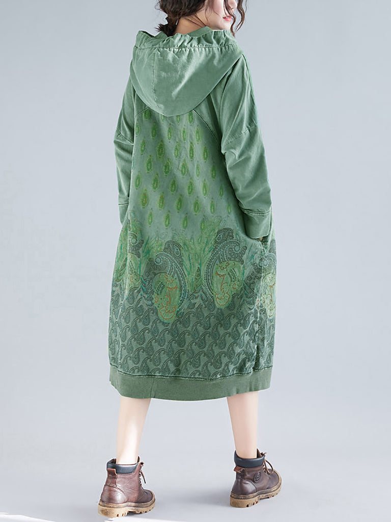 This product features a unique print pattern. It also includes a hooded collar and full raglan sleeves, adding an artistic touch. Perfect for the spring and autumn seasons.