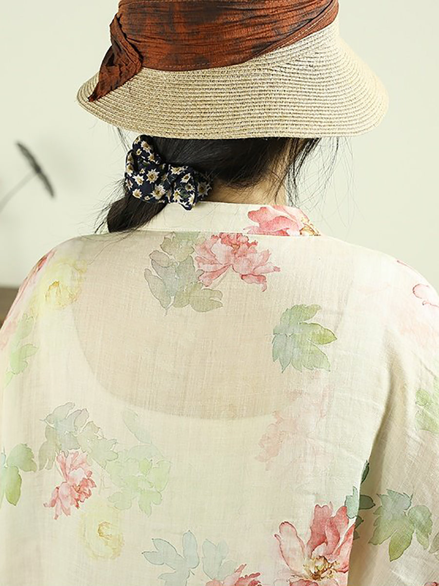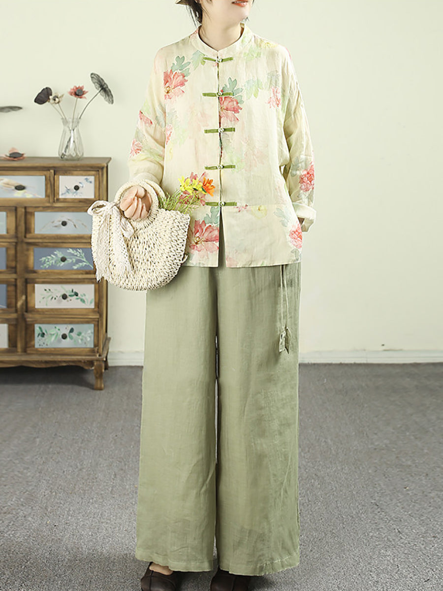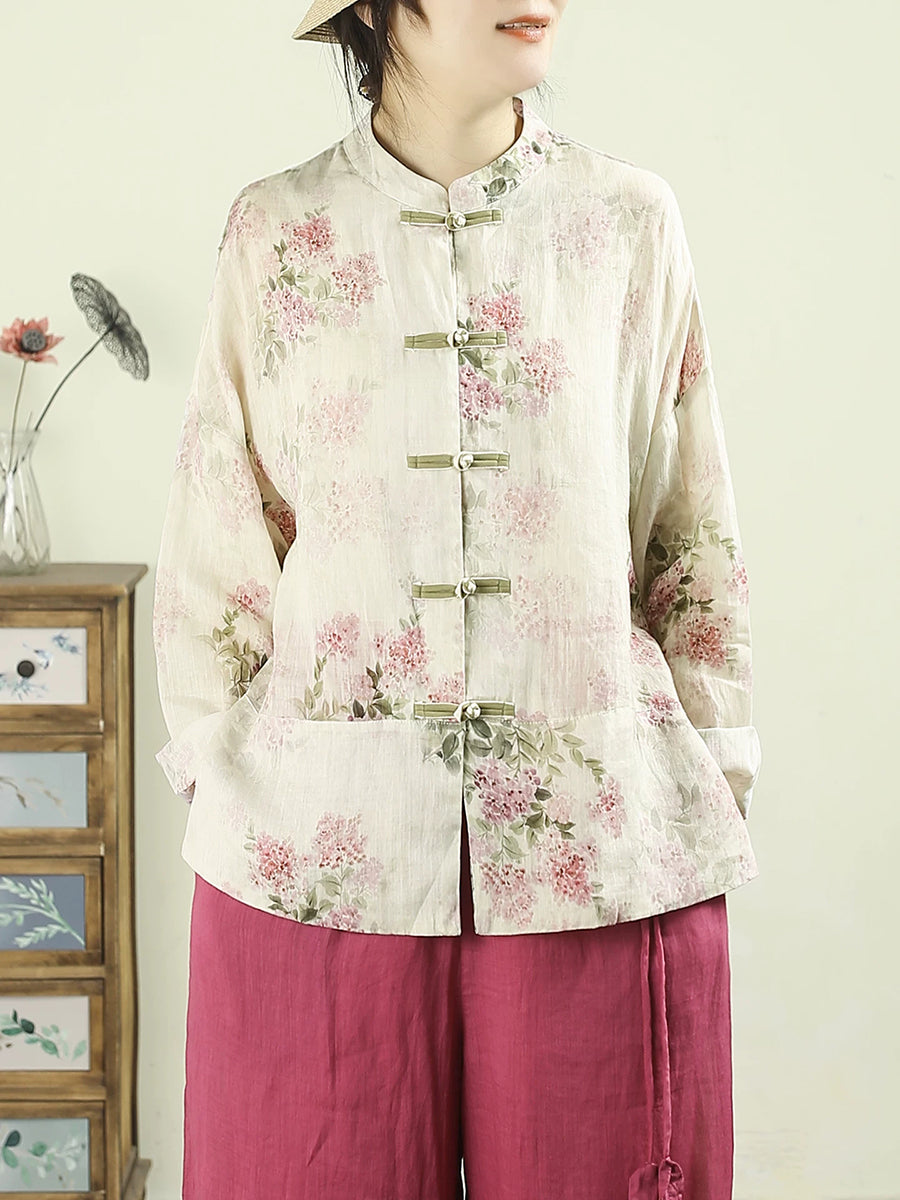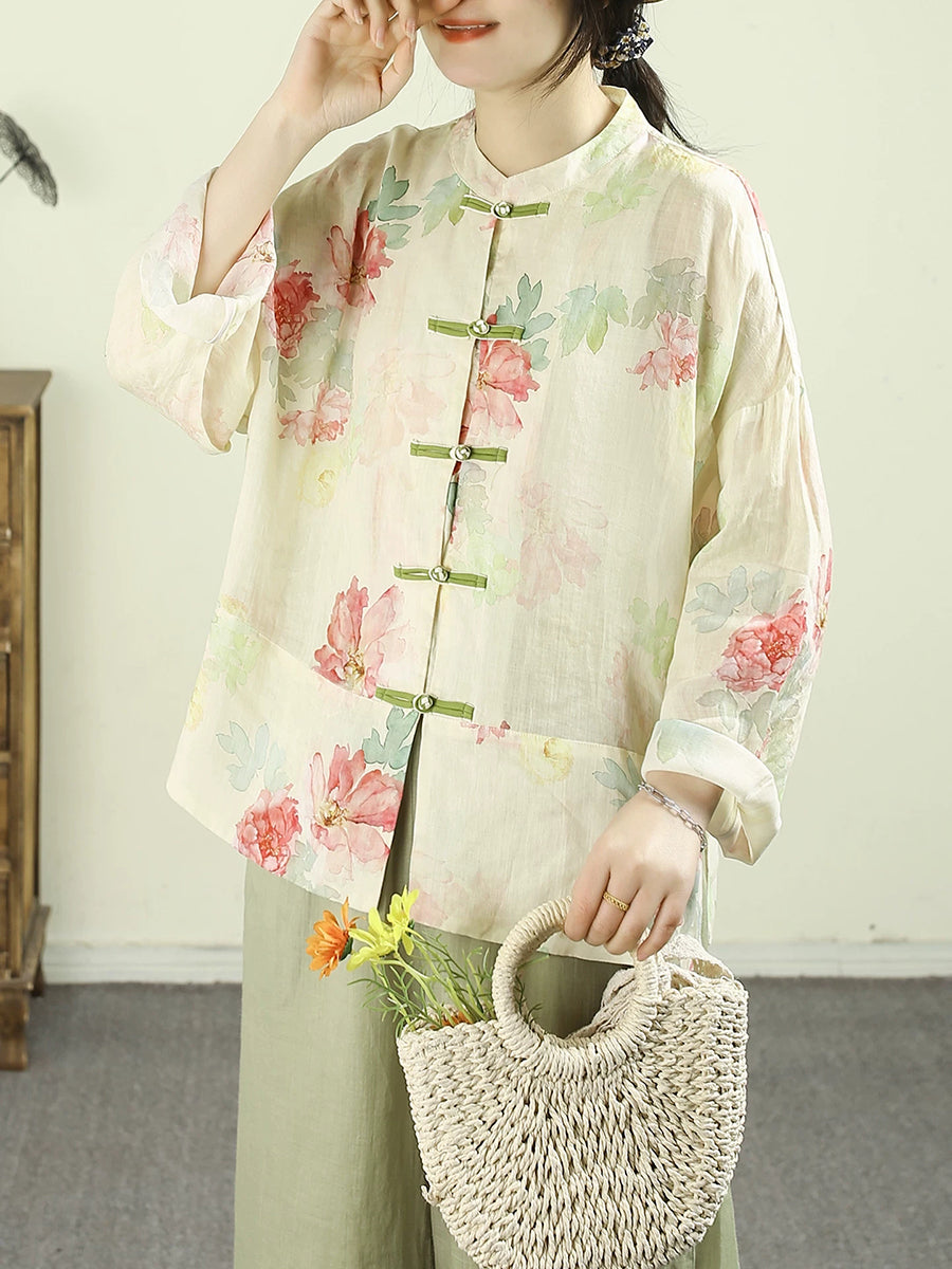 Women Ethnic Spring Flower Stand Collar 100%Ramie Shirt