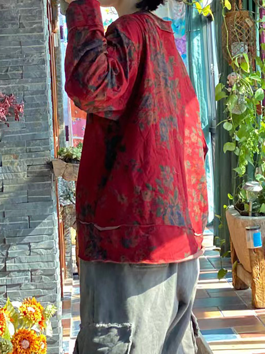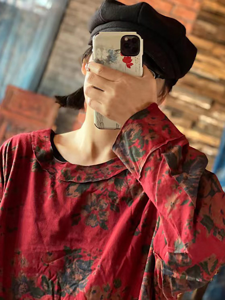 Plus Size Women Cotton Floral Vintage Long Sleeve Loose T Shirt