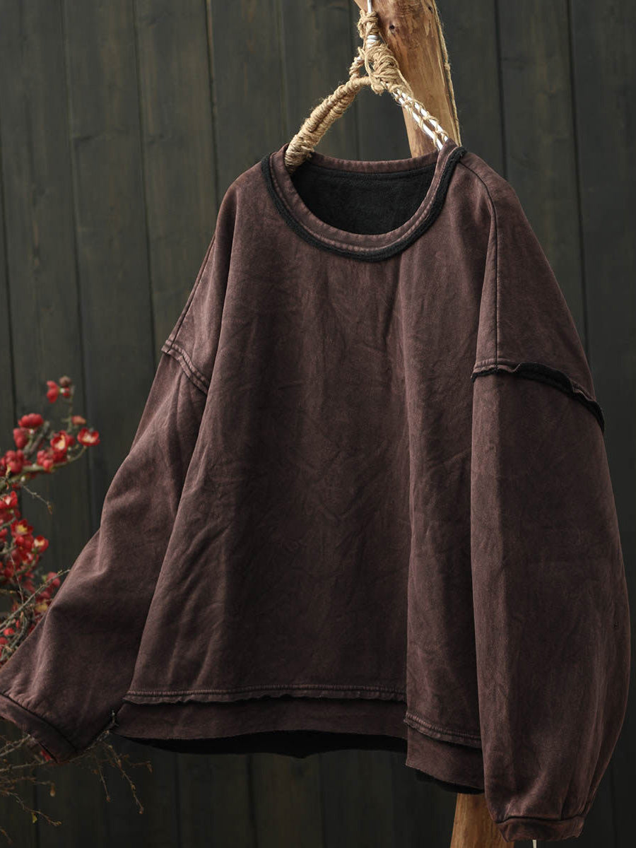 Women Retro Autumn Pure Color Fleece-lined O-Neck Blouse