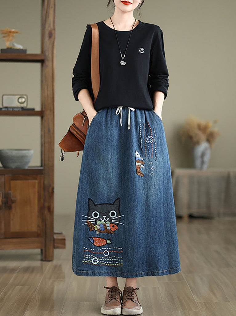 Women Spring Artsy Cat Fish Embroidery Denim Skirt