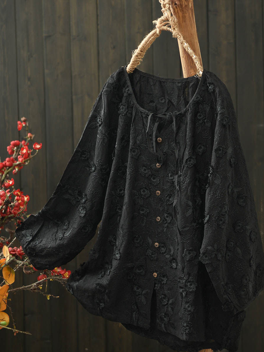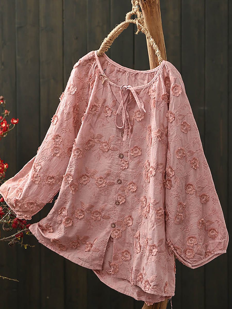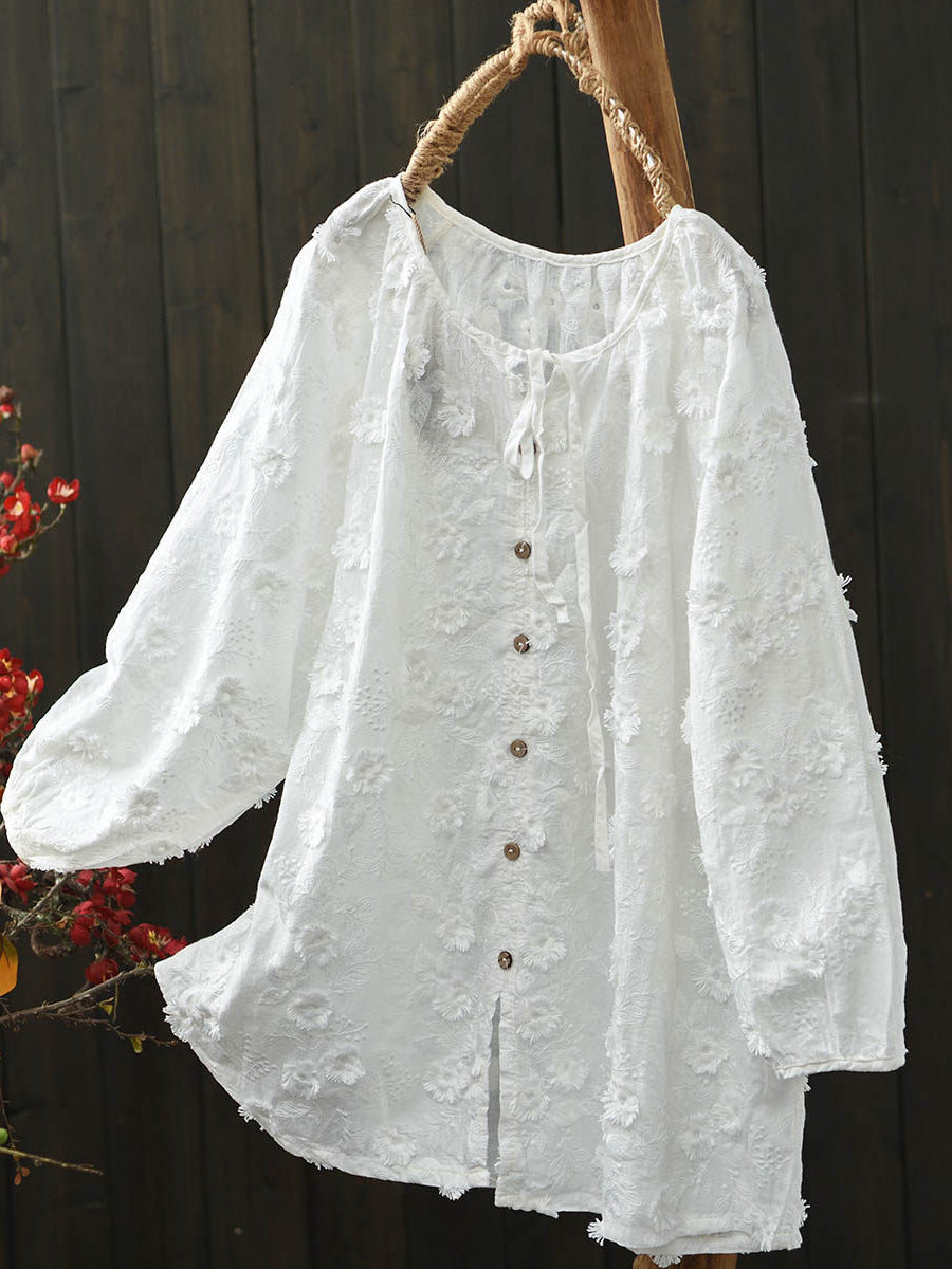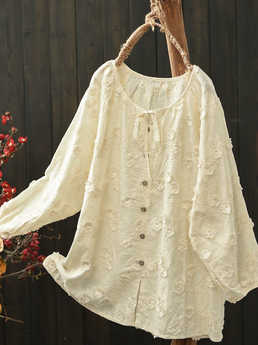 Women Spring Artsy Flower Embroidery Cotton Blouse